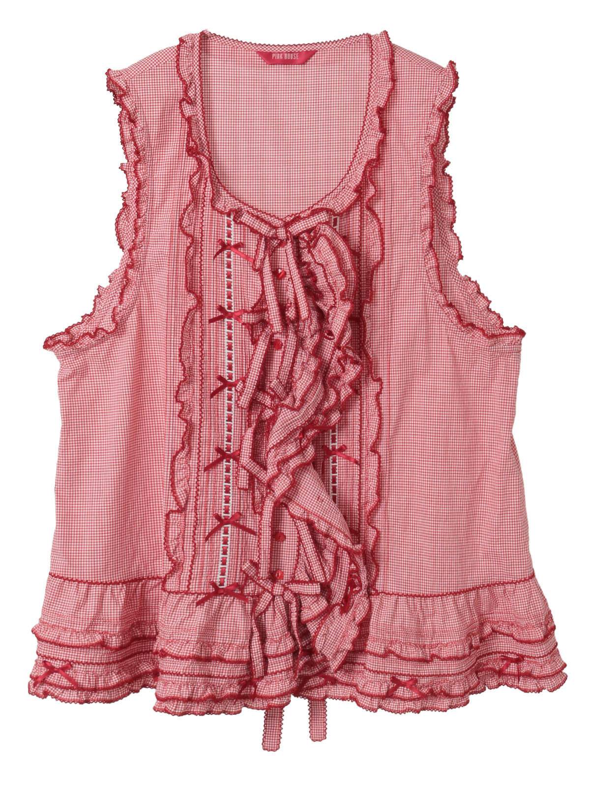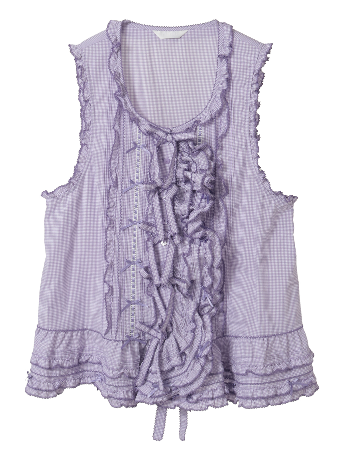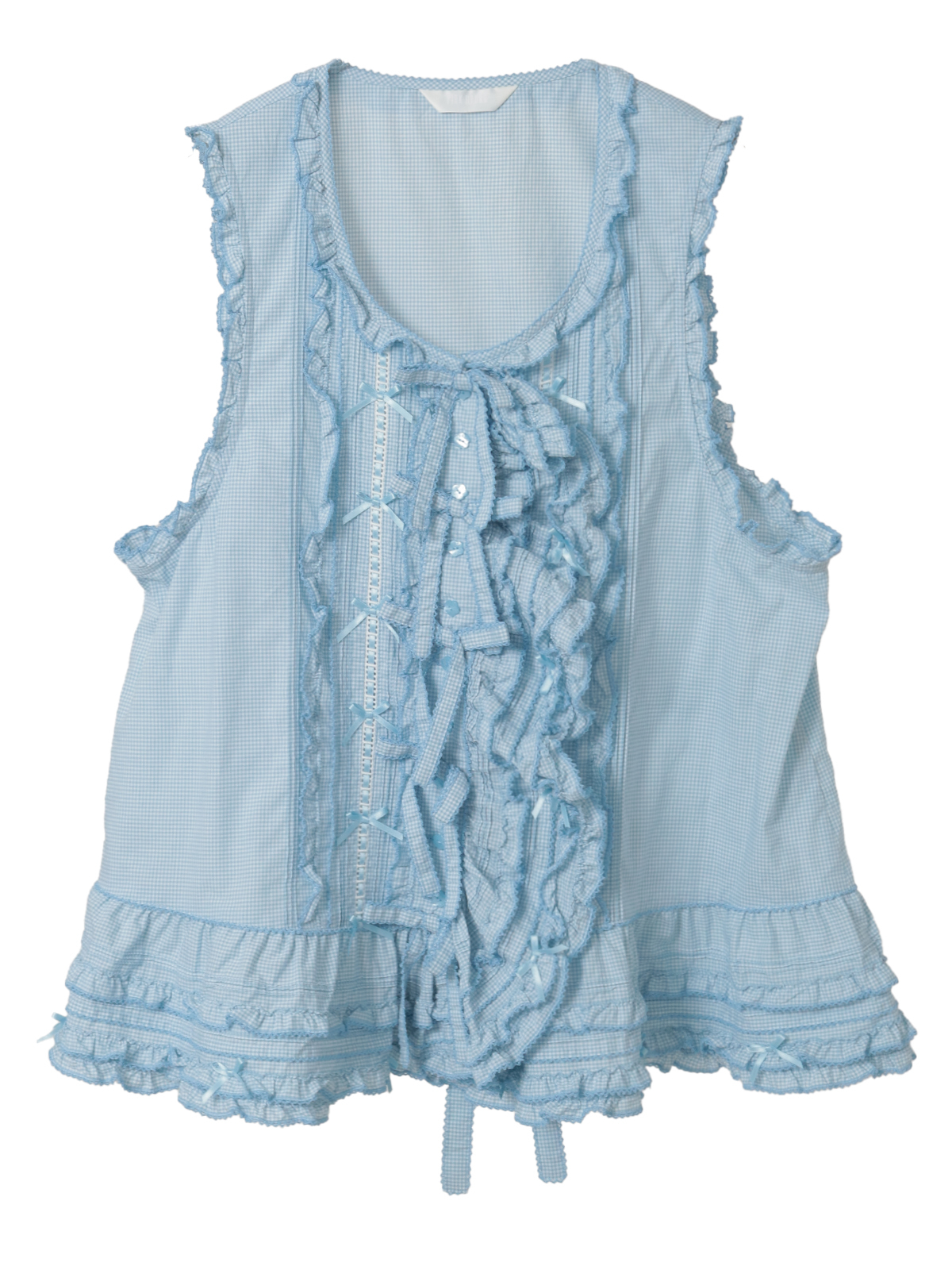 ピコフリルにピンタック、ミニリボンにサテンリボンを通したハシゴレース使いなど、キュートなデティールをあしらったベストブラウス。