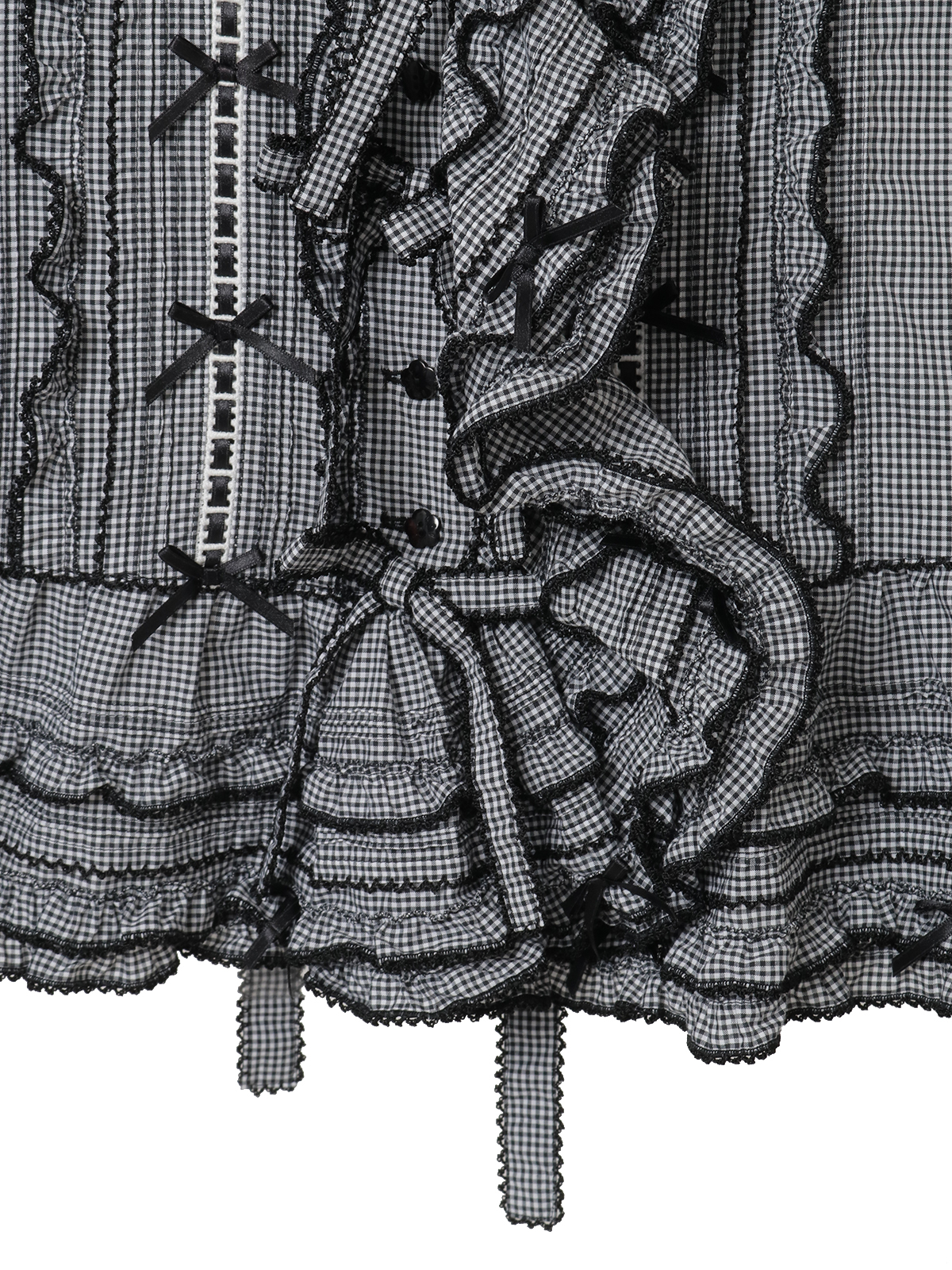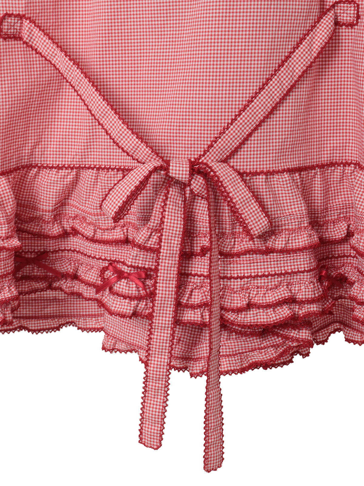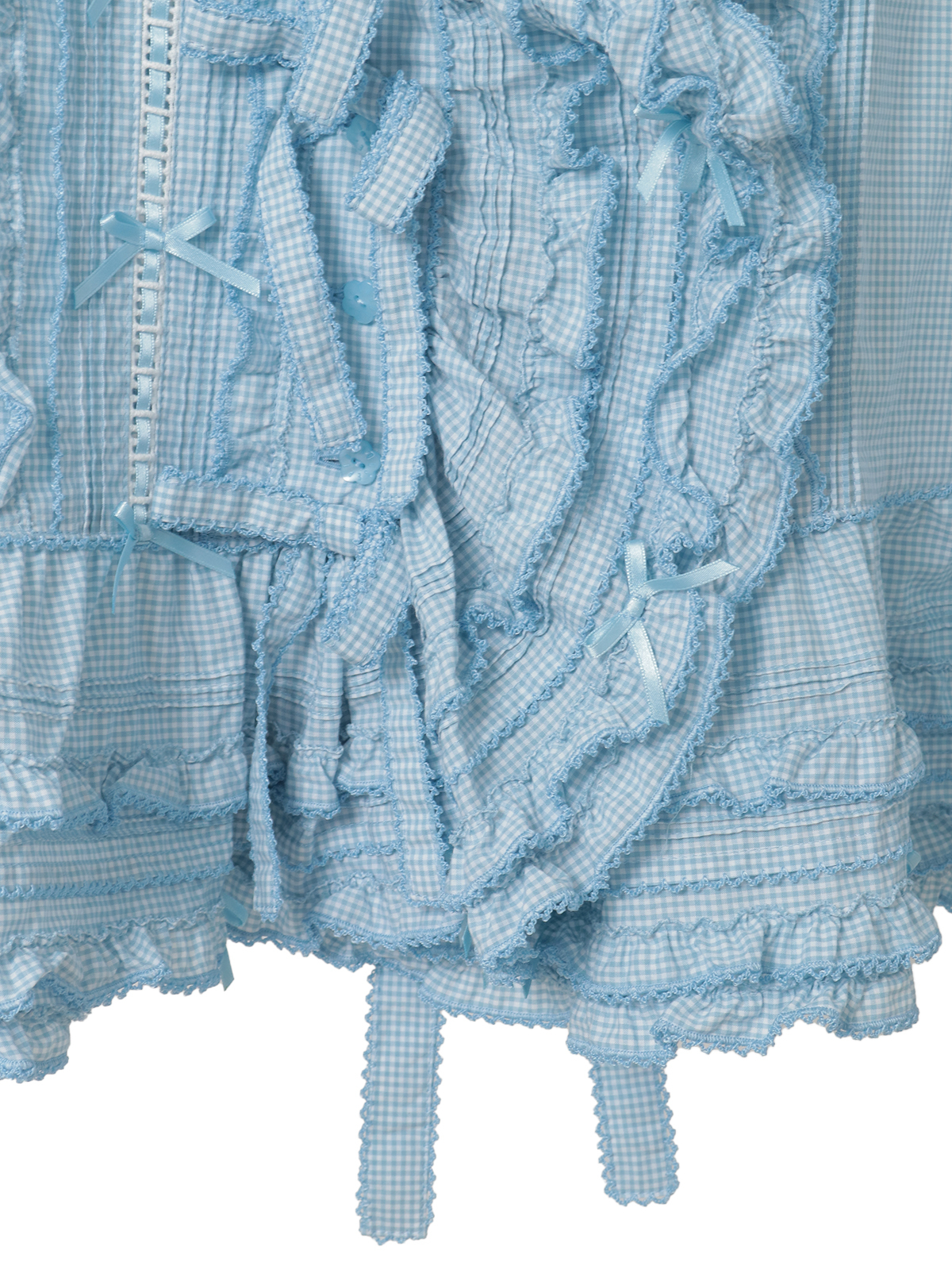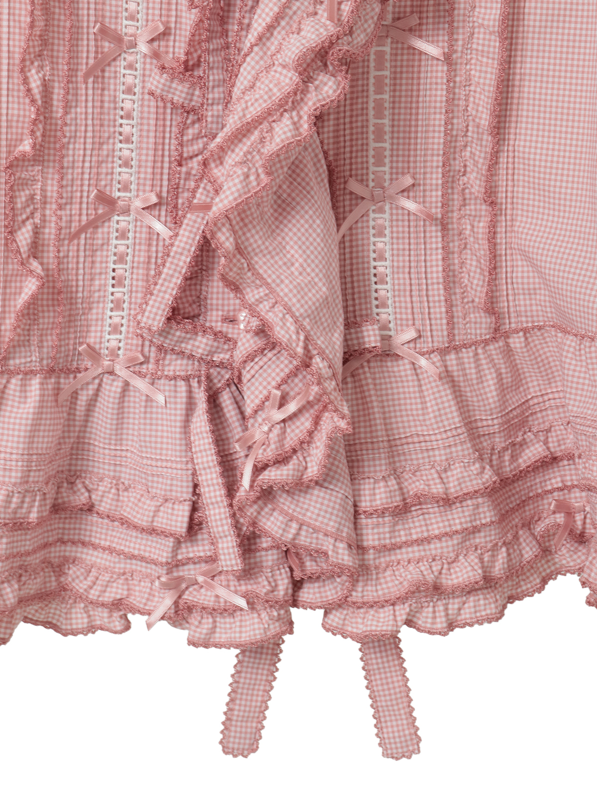 前たてのところや、裾まわりのペプラムのところにフリルを重ね合わせた華やかなデザイン。さらにフロントのところに縦のラインにギンガムチェックのリボンモチーフを5つも並べて豪華な仕上がりに。