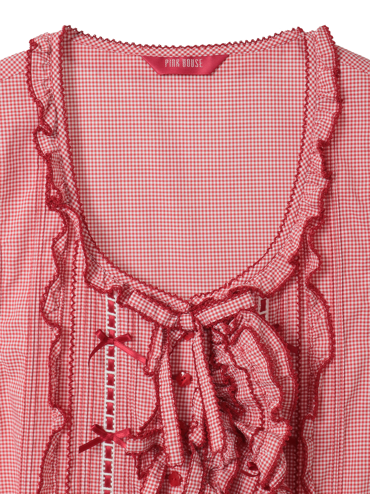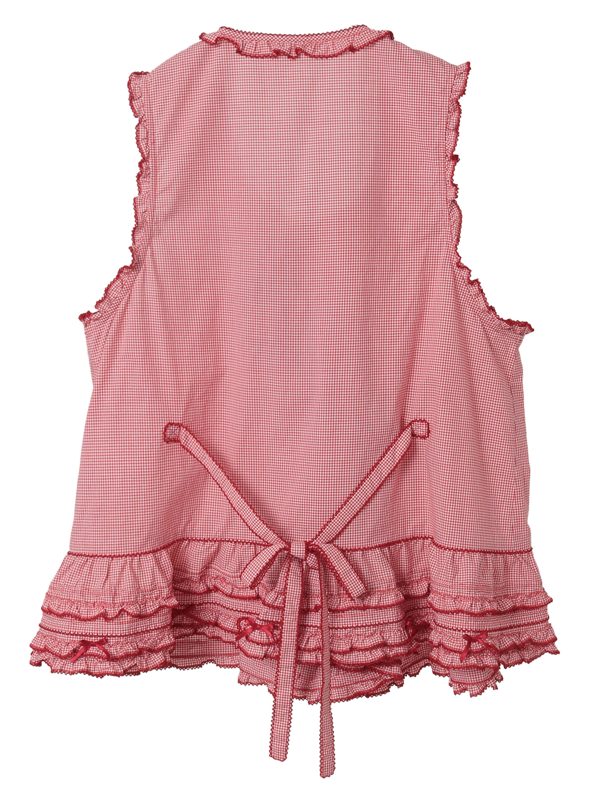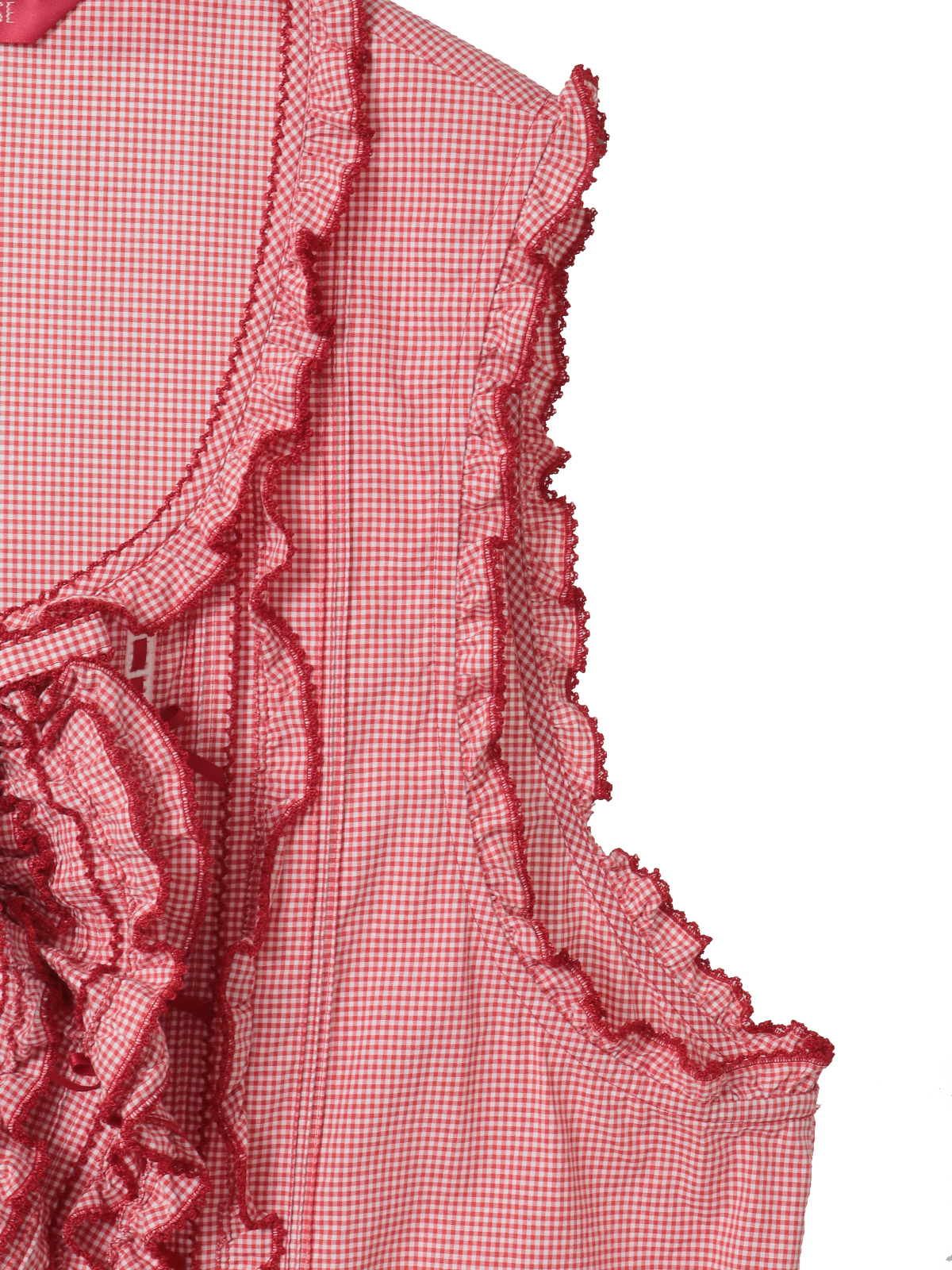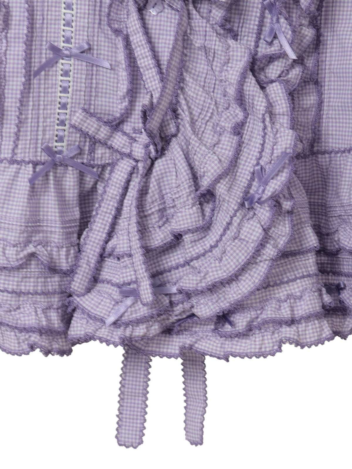 前たてのところや、裾まわりのペプラムのところにフリルを重ね合わせた華やかなデザイン。さらにフロントのところに縦のラインにギンガムチェックのリボンモチーフを5つも並べて豪華な仕上がりに。