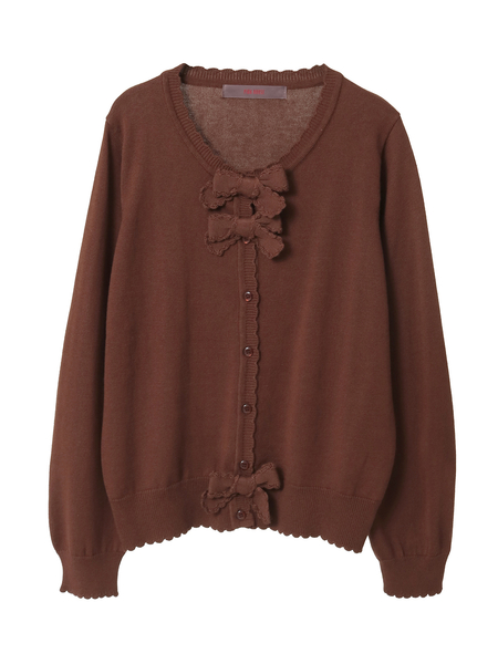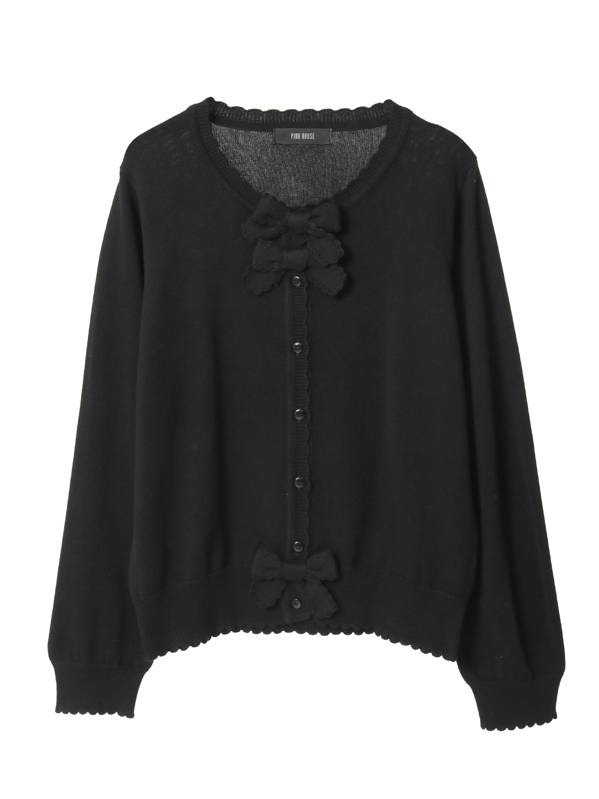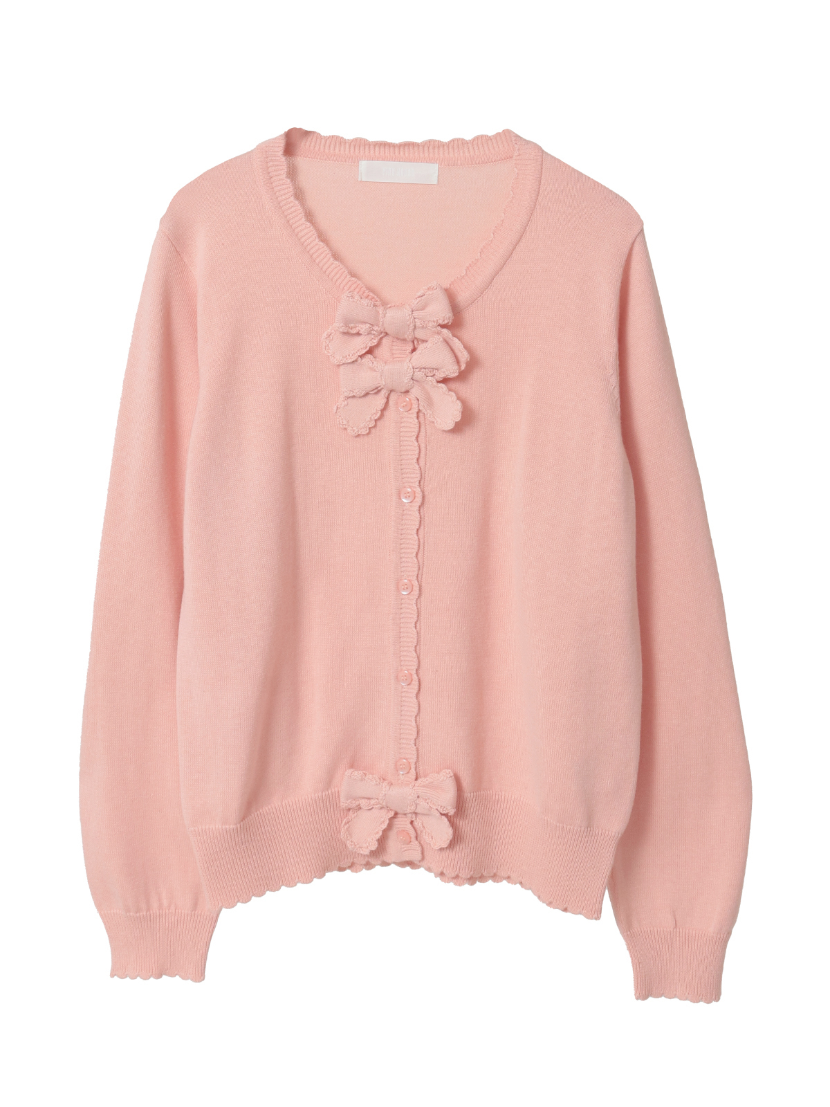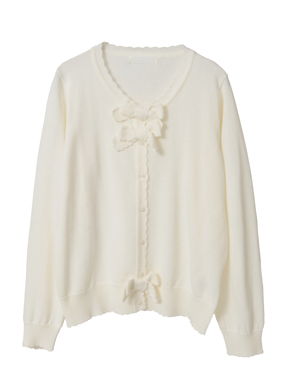 ころんと存在感のあるリボンモチーフを首もとに2つ、裾に1つあしらってポイント使いにしたニットカーディガン。
