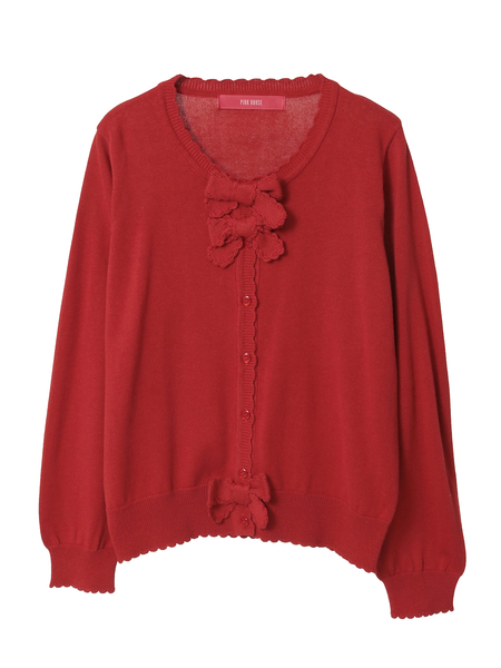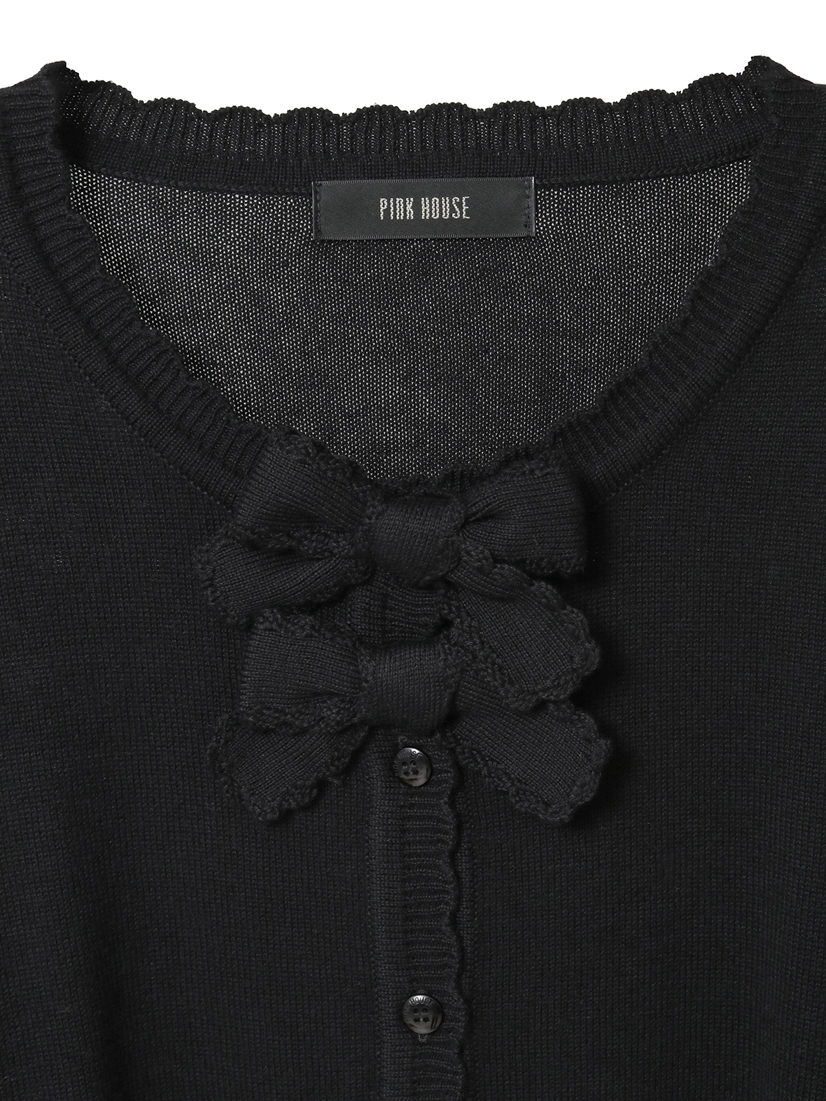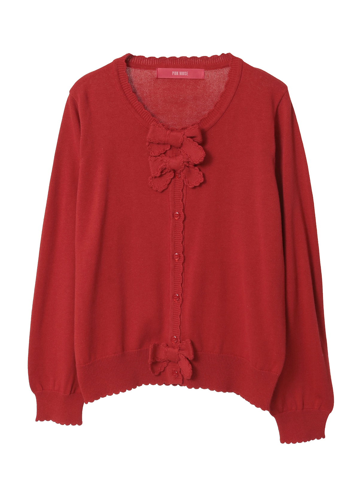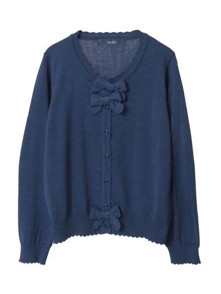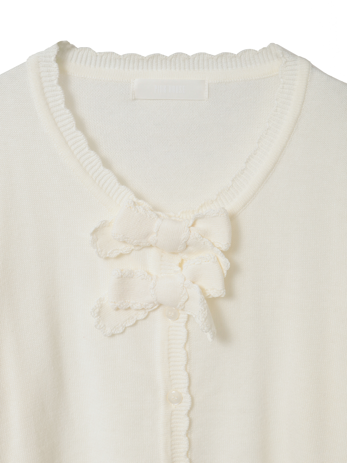 ころんと存在感のあるリボンモチーフを首もとに2つ、裾に1つあしらってポイント使いにしたニットカーディガン。