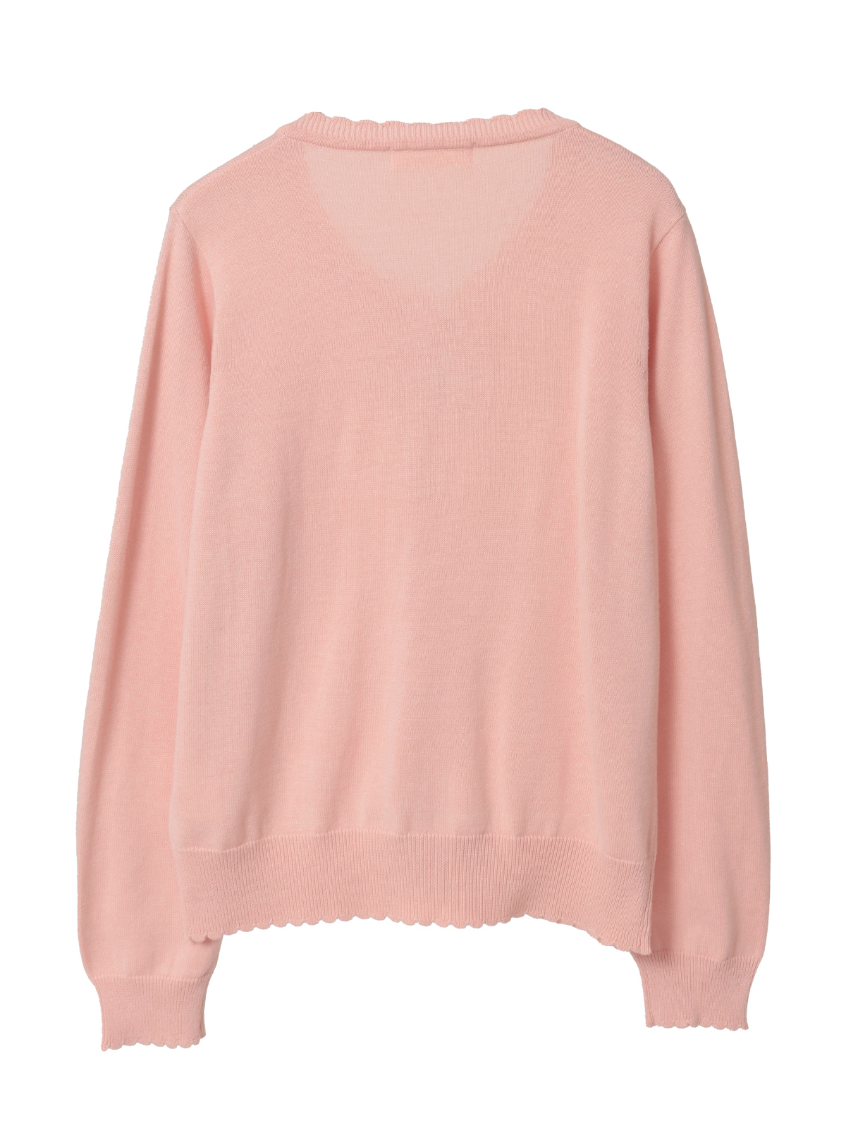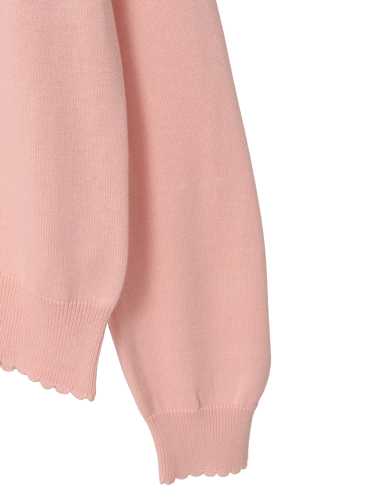 首まわりや前たて、袖ぐちや裾まわりのリブのところにあしらったスカラップフリルのような縁取りのデザインが上品な可愛らしさを演出します。