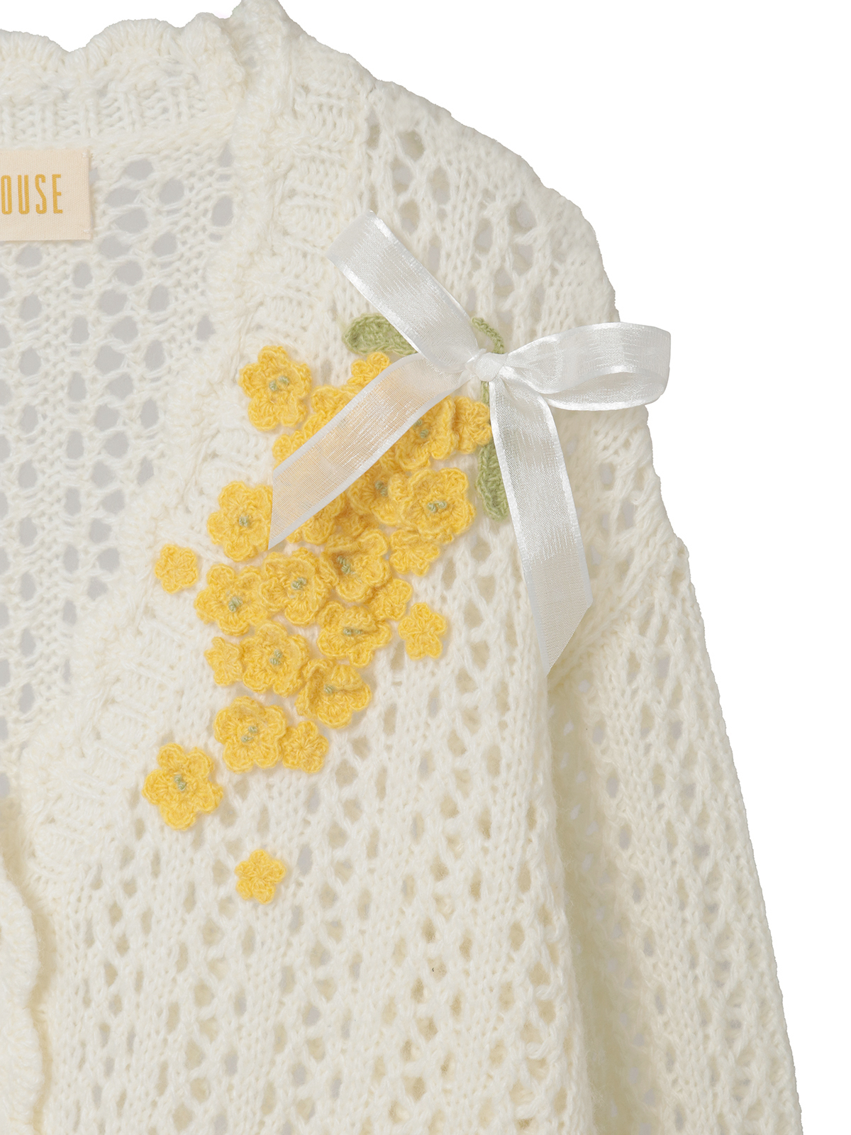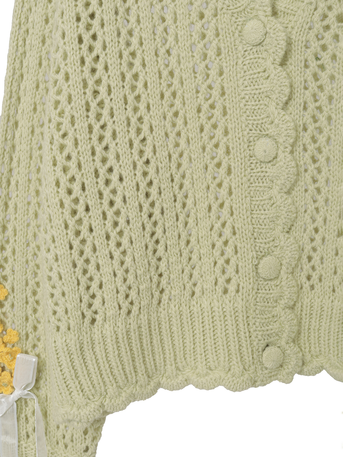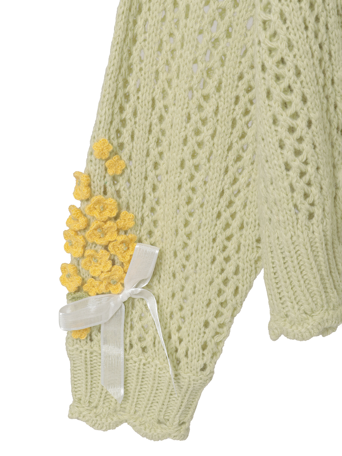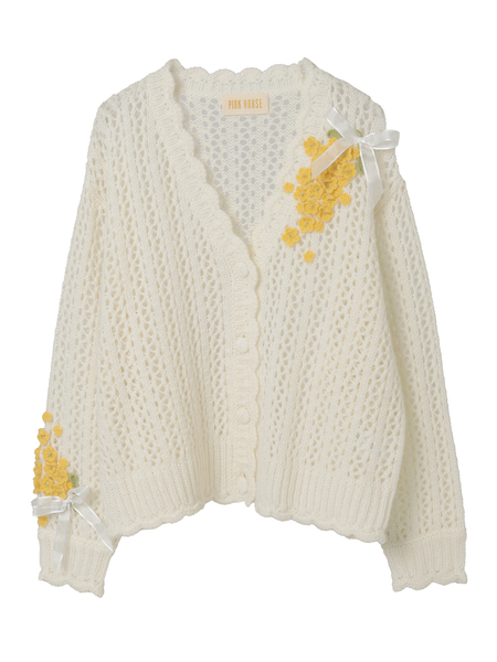 春風のように優しい柔らかな透かし編みのカーディガンの左肩から胸にかけてと、右の袖ぐちにそれぞれあしらって。優しいキイロの花々の連なりが可憐な装いに。