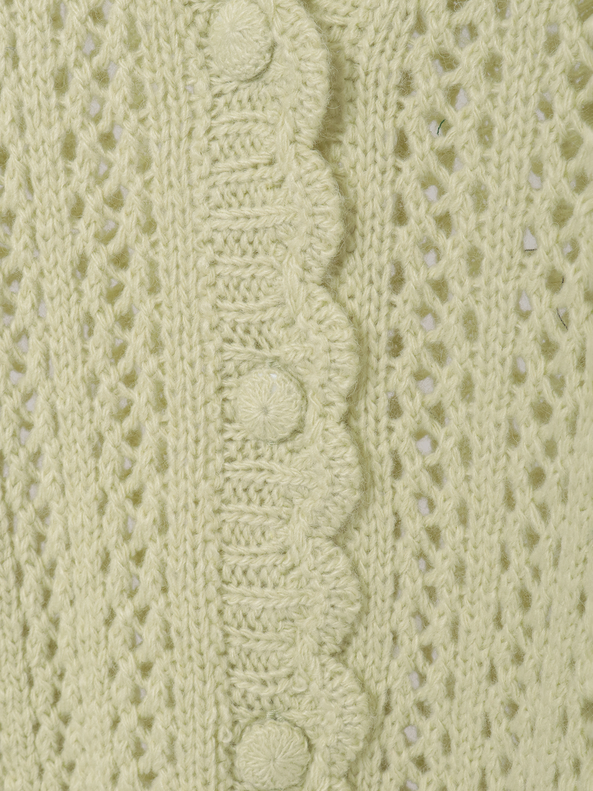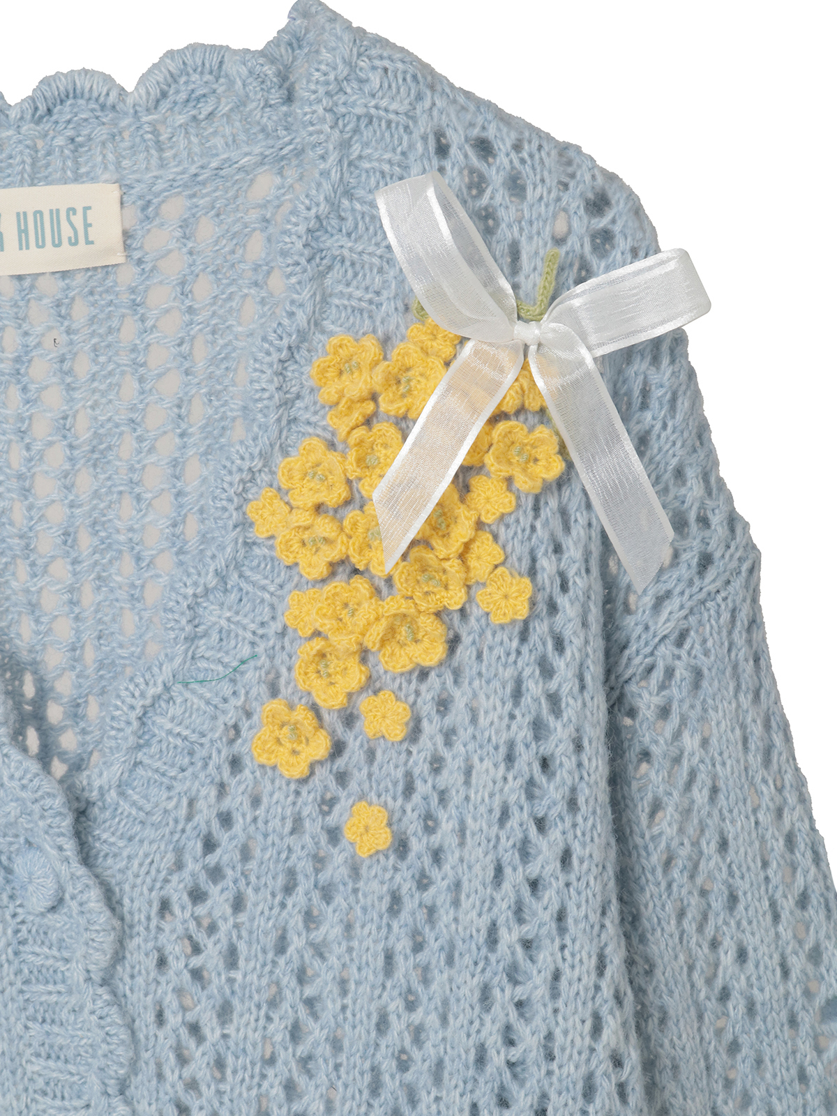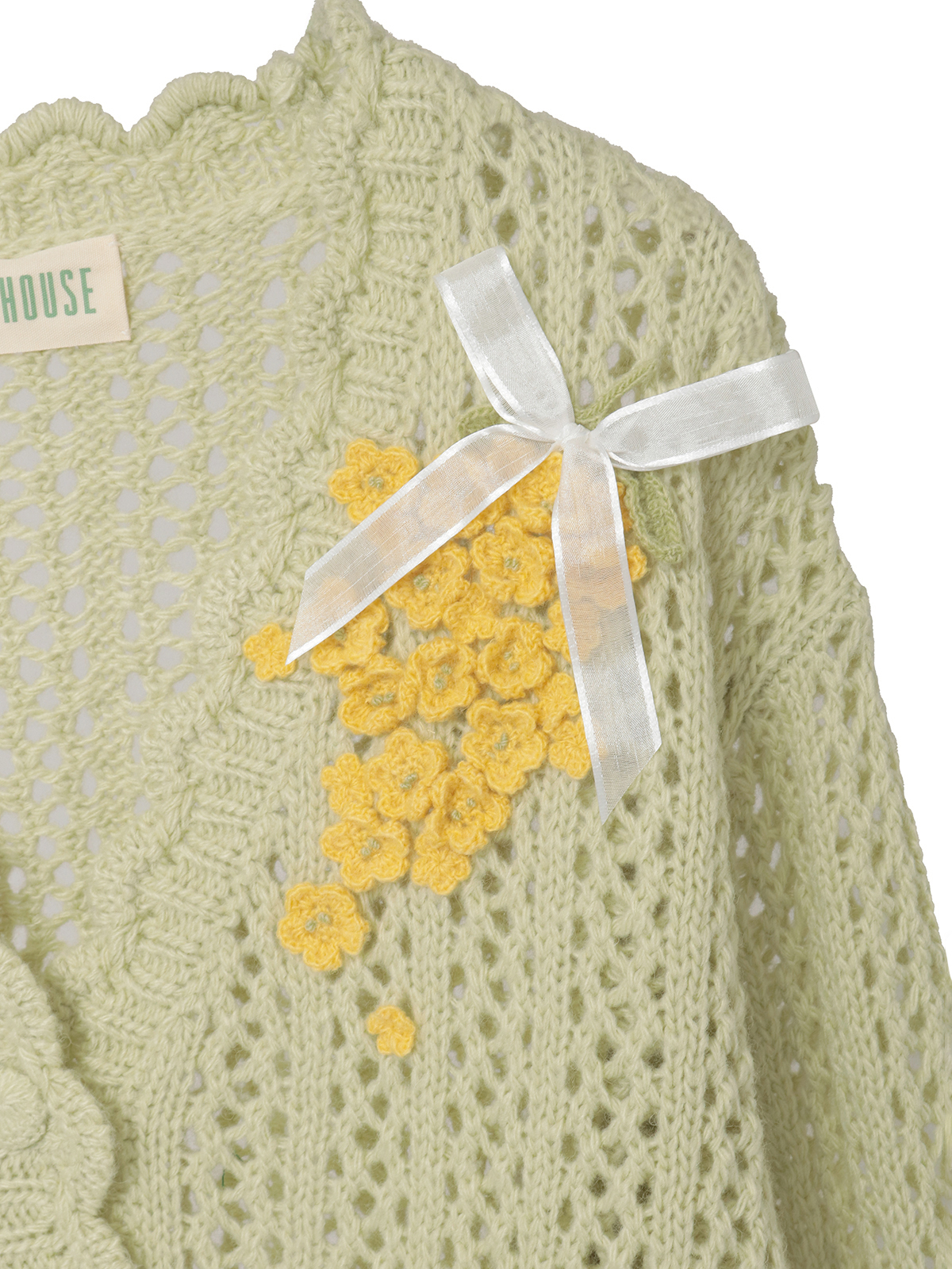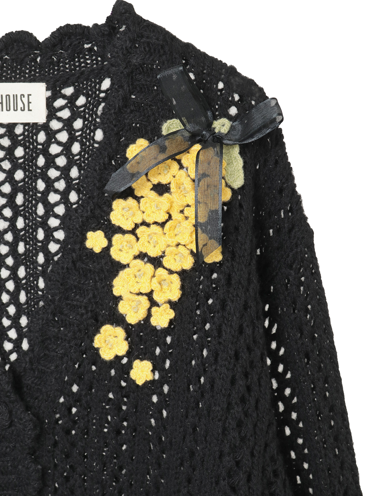 春風のように優しい柔らかな透かし編みのカーディガンの左肩から胸にかけてと、右の袖ぐちにそれぞれあしらって。優しいキイロの花々の連なりが可憐な装いに。