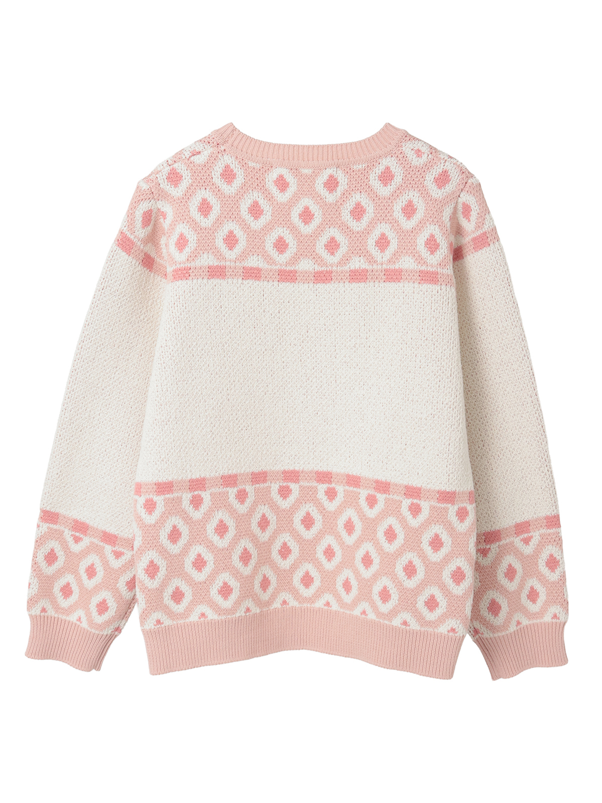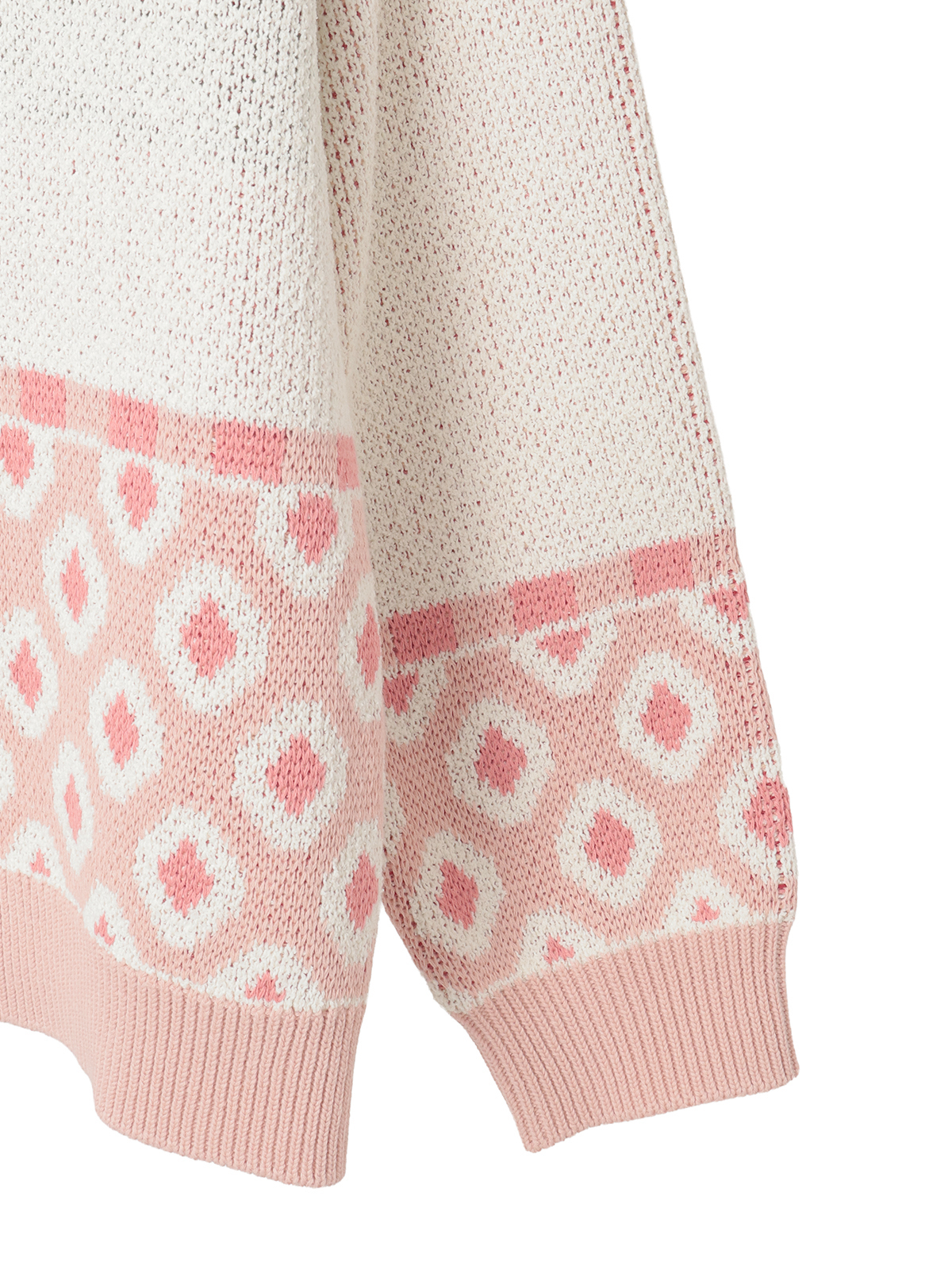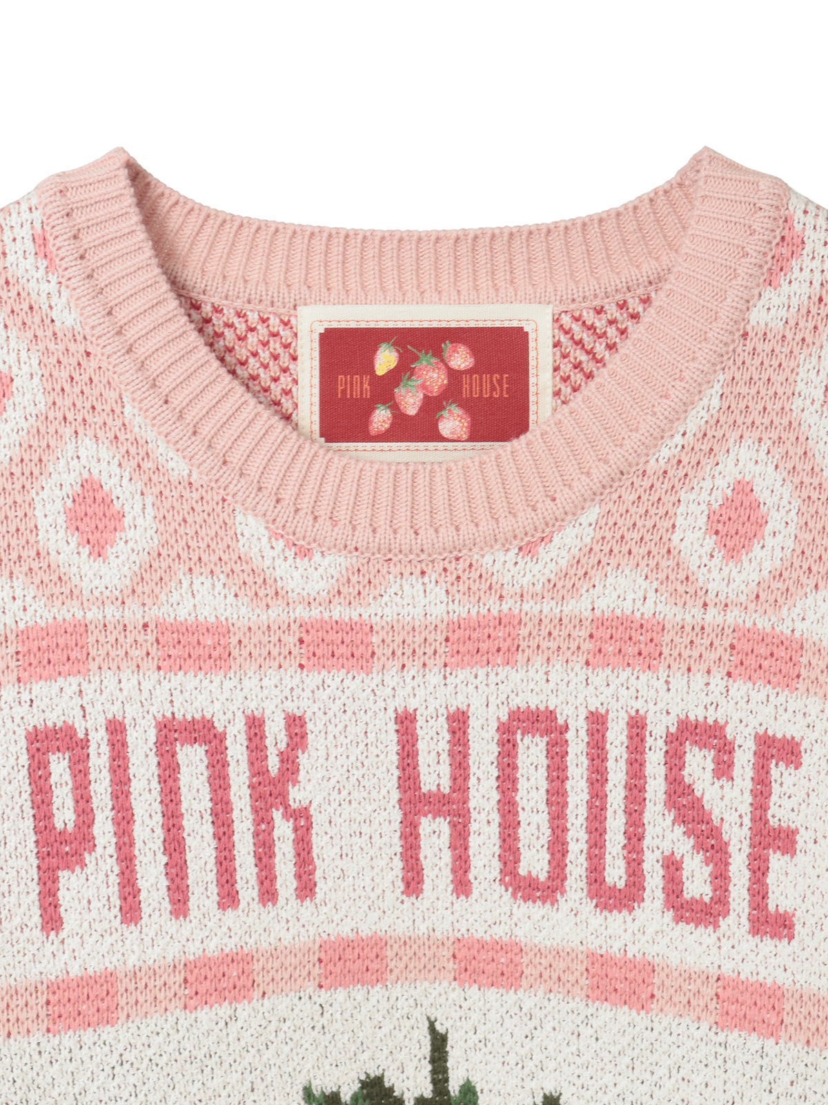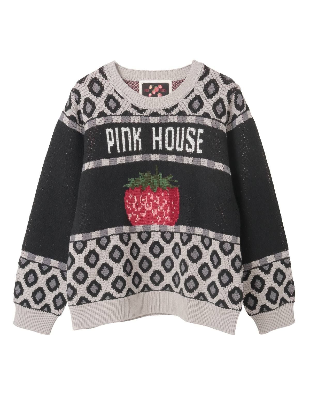 「苺リースプリント」にちなんだ格子模様をそのままニットの柄に落とし込んだユニークな仕上がりに。