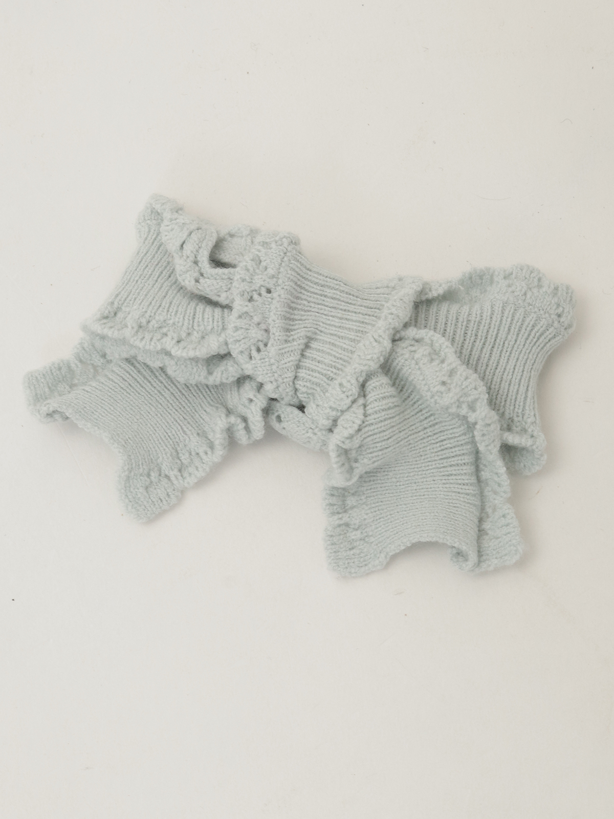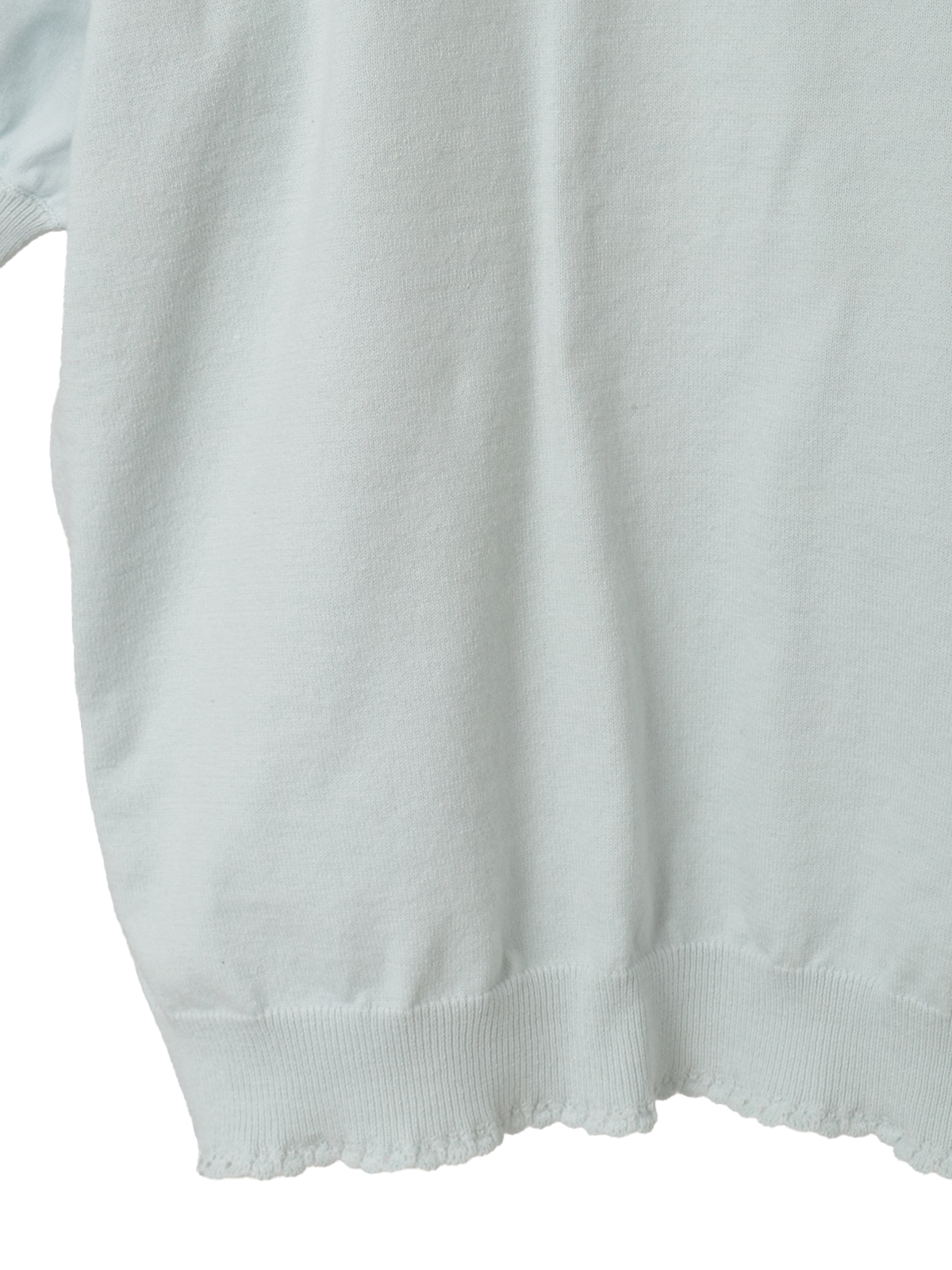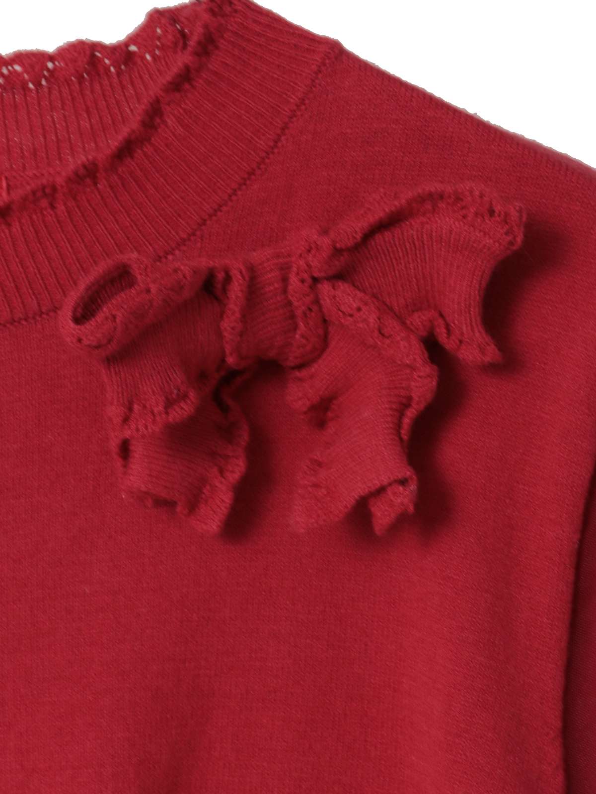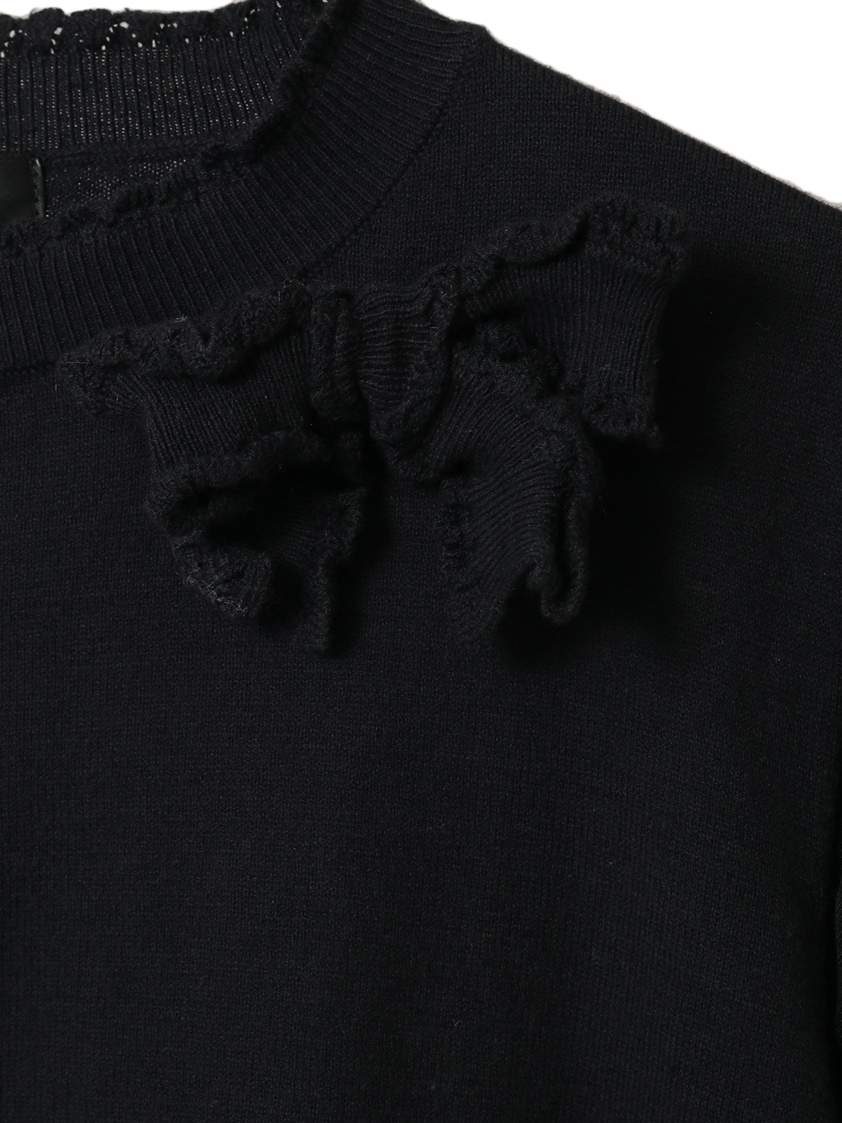 首まわりがちょっとモックネックになったデザインで、フリルのような編地の縁取りが上品な首もとを演出します。