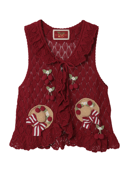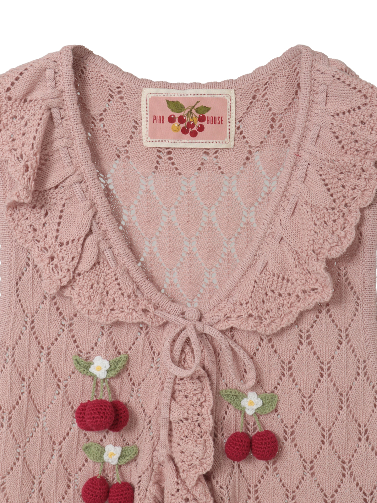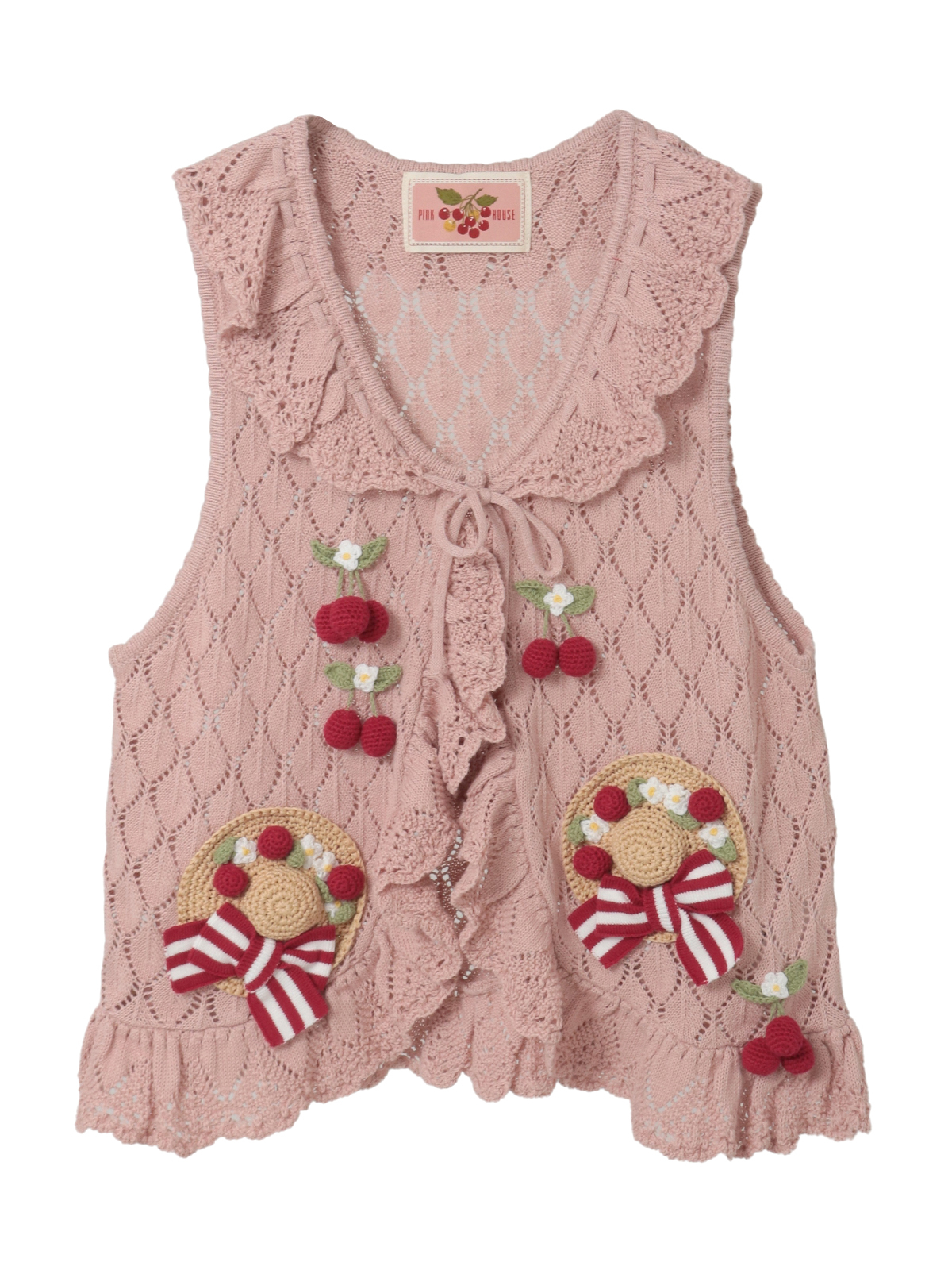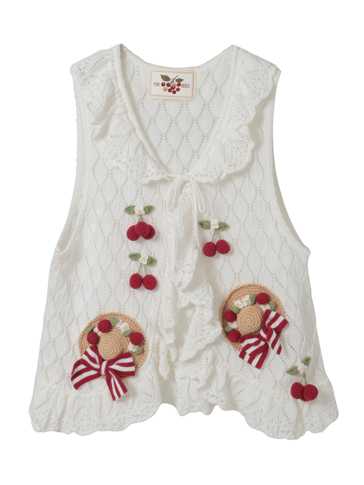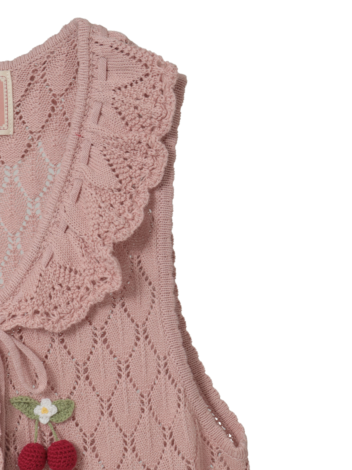 透かし柄の入ったベストに、手編みのさくらんぼのニットモチーフが揺れるさまや、模様編みを施したフリルの縁取りを施して、首まわりや前たてのところや裾まわりなどひらひらと揺れるさまがなんとも可愛らしい仕上がりに。