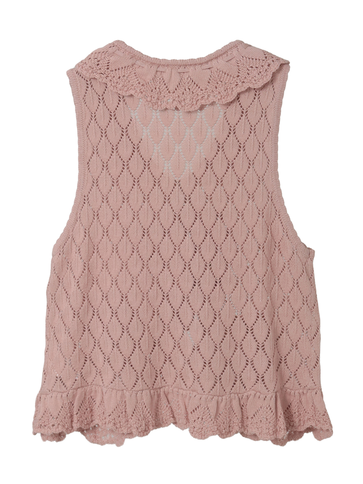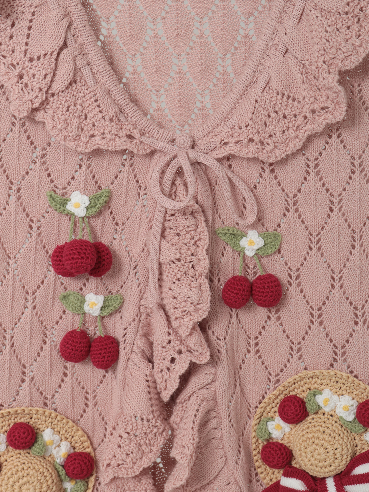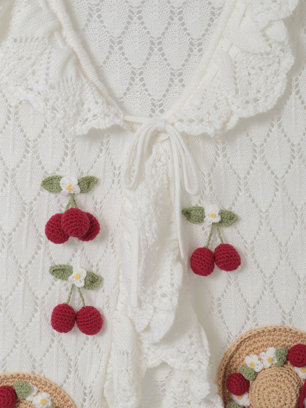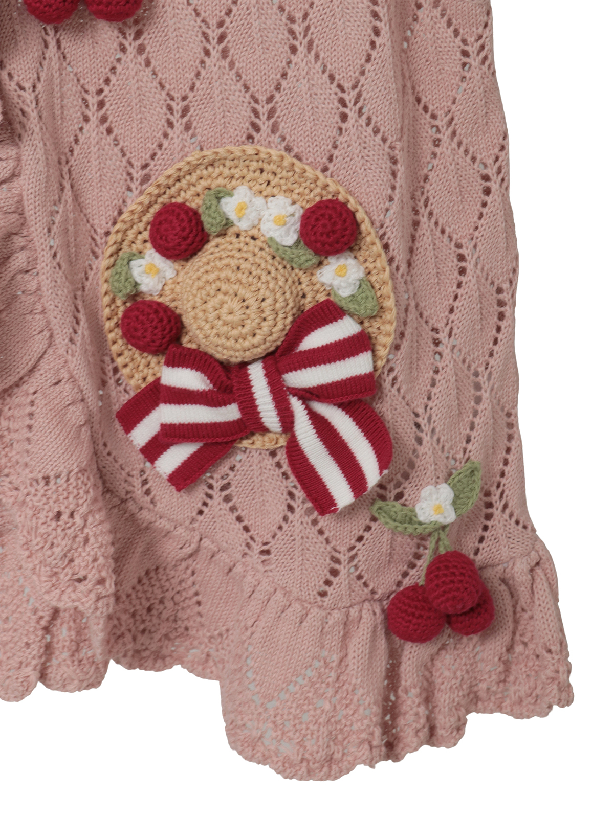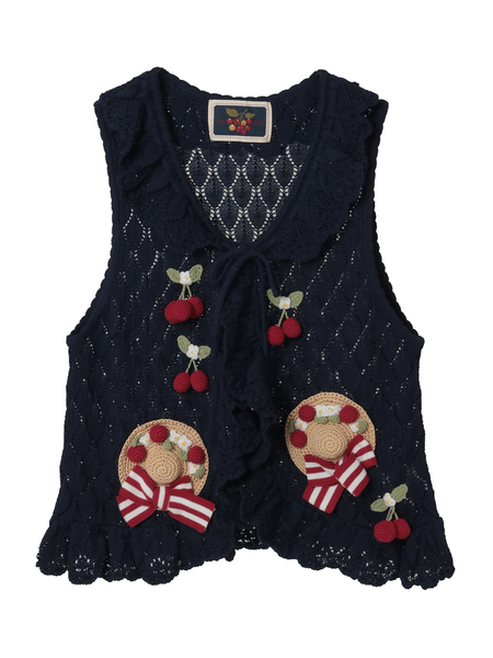 透かし柄の入ったベストに、手編みのさくらんぼのニットモチーフが揺れるさまや、模様編みを施したフリルの縁取りを施して、首まわりや前たてのところや裾まわりなどひらひらと揺れるさまがなんとも可愛らしい仕上がりに。