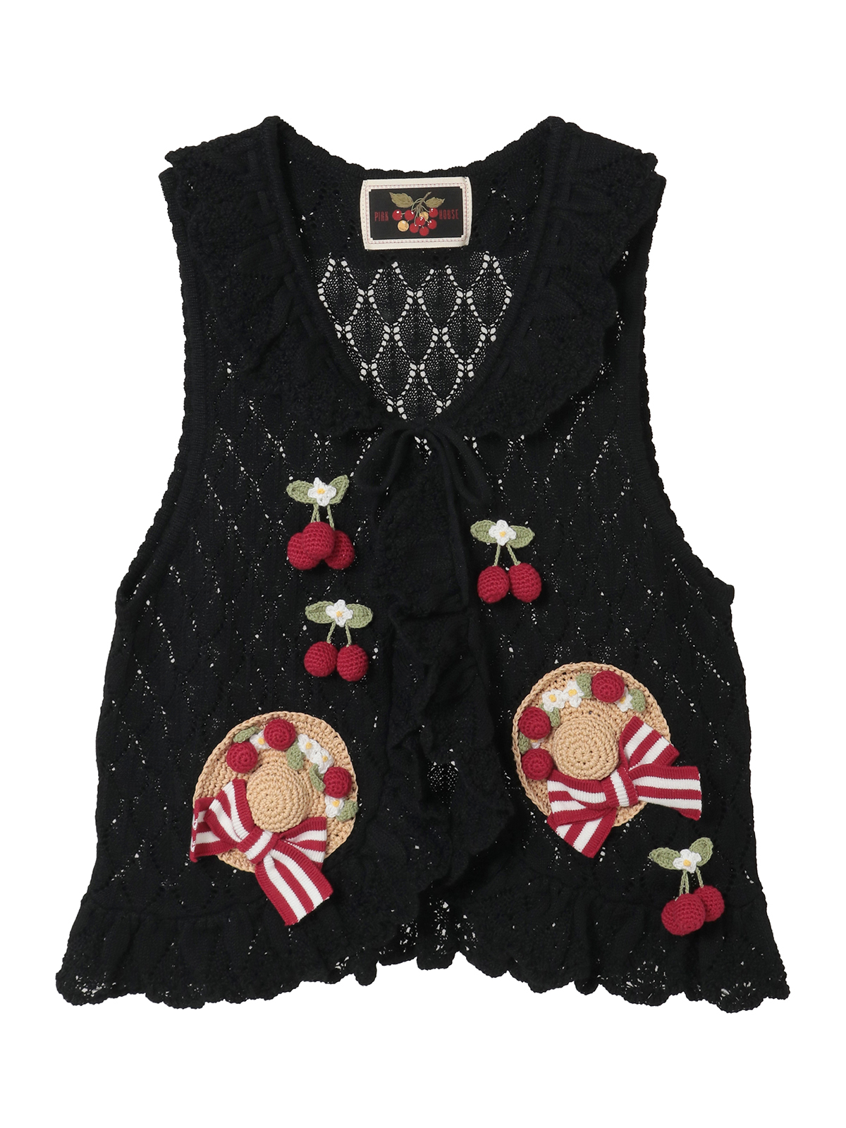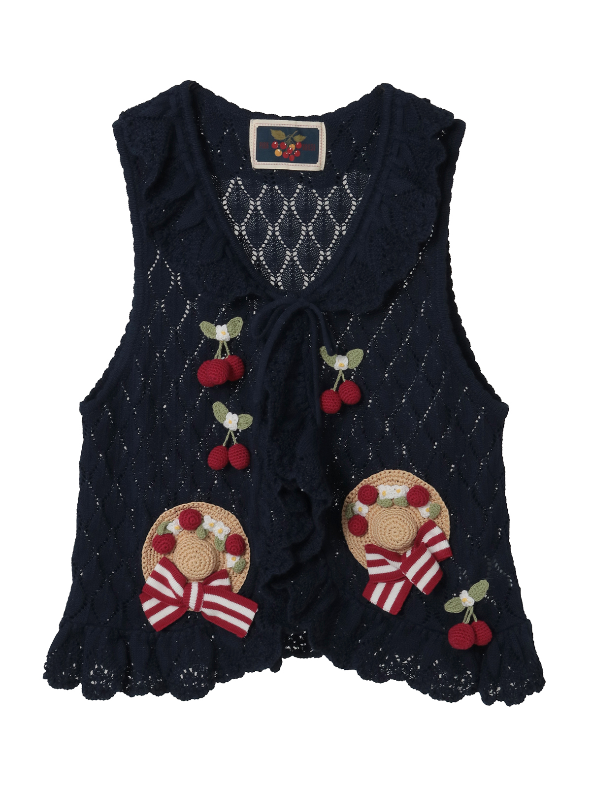 プリントに描かれた、ストライプのりぼんやさくらんぼで飾りたてた麦わら帽子と、真っ赤に色づいたさくらんぼたちをそれぞれキュートなニットモチーフにして、フロントに飾り立てた華やかなニットベスト。