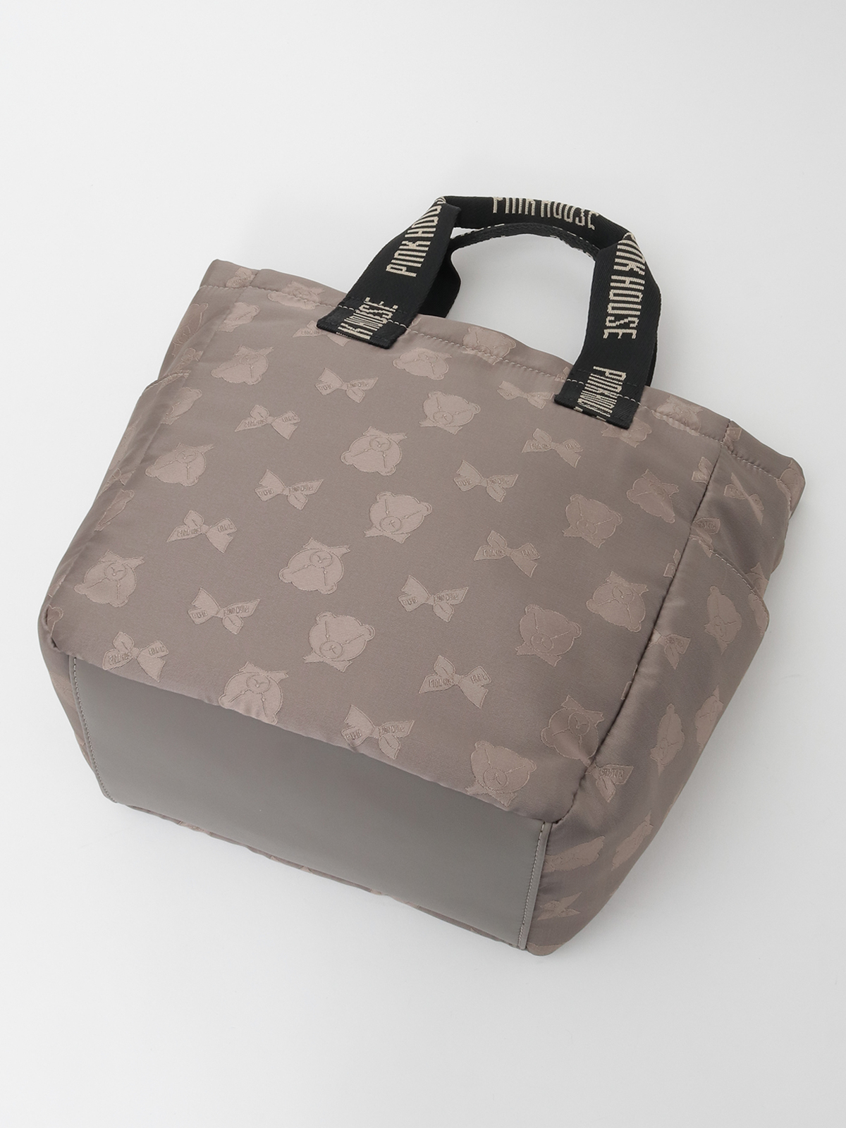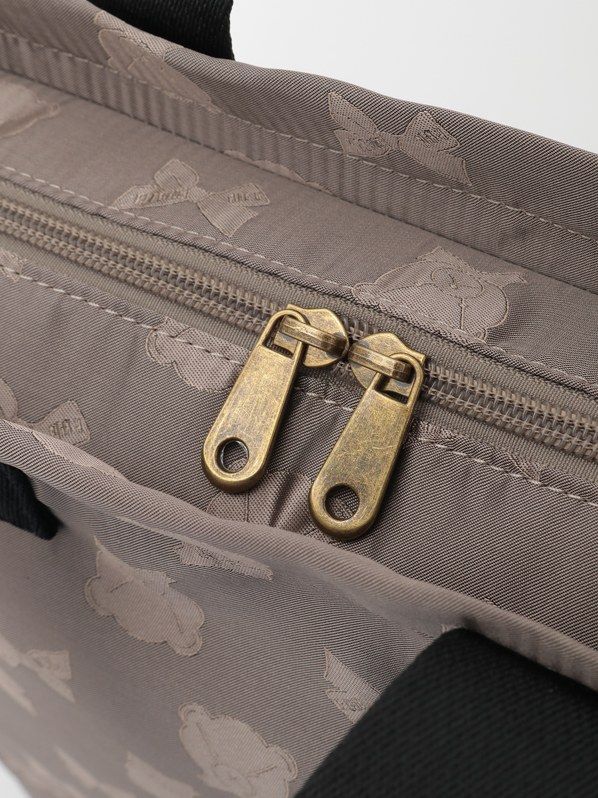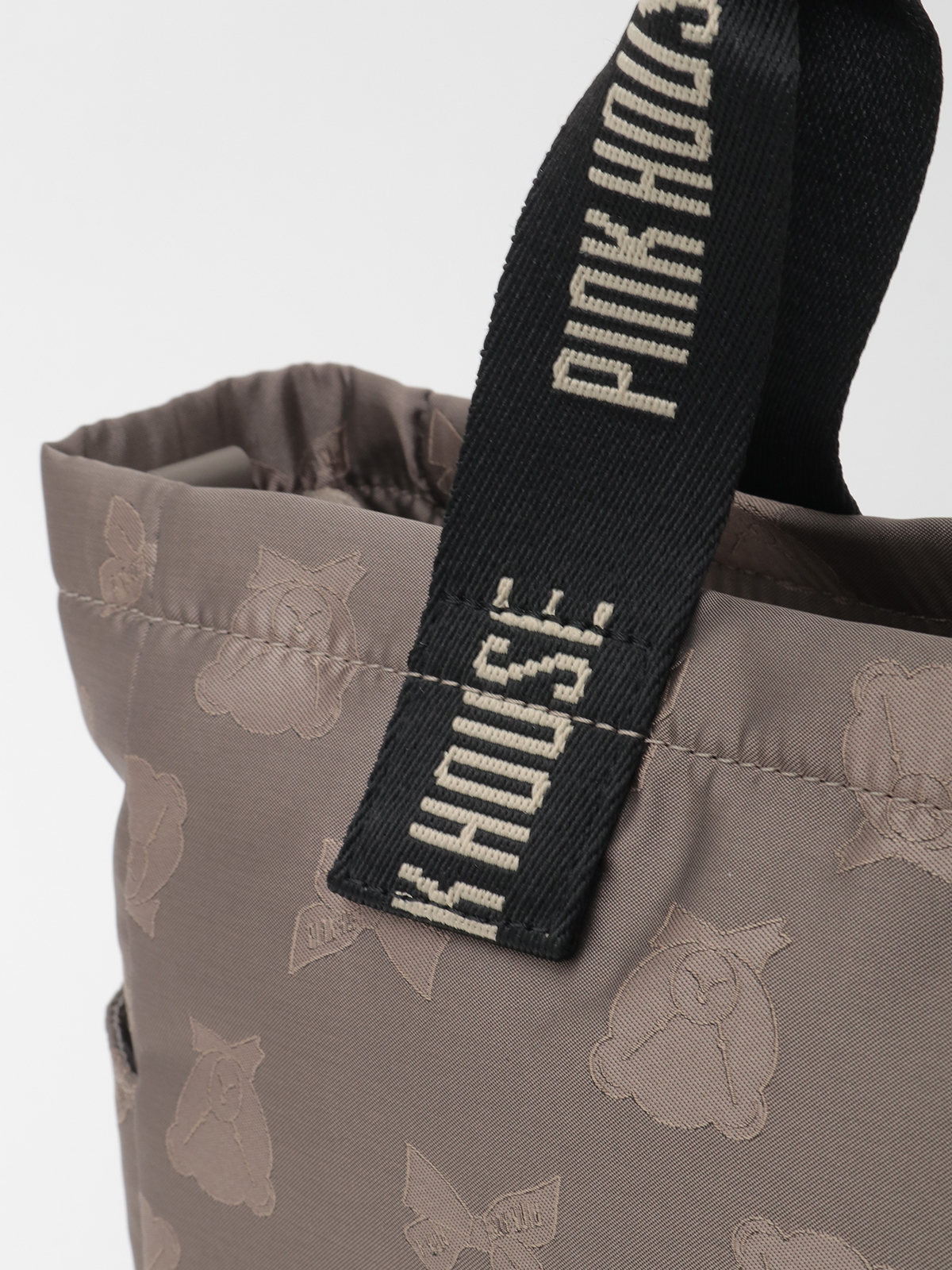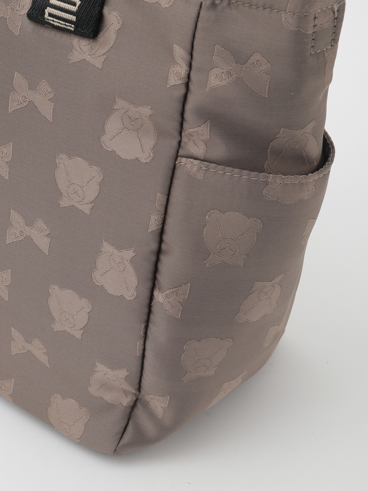 程よいハリ感と上品な光沢感のあるしっかりとしたポリエステル地に、顔くまとリボン、ピンクハウスを代表とするモチーフ柄を織り上げたオリジナルの生地で作られたリュックサック。