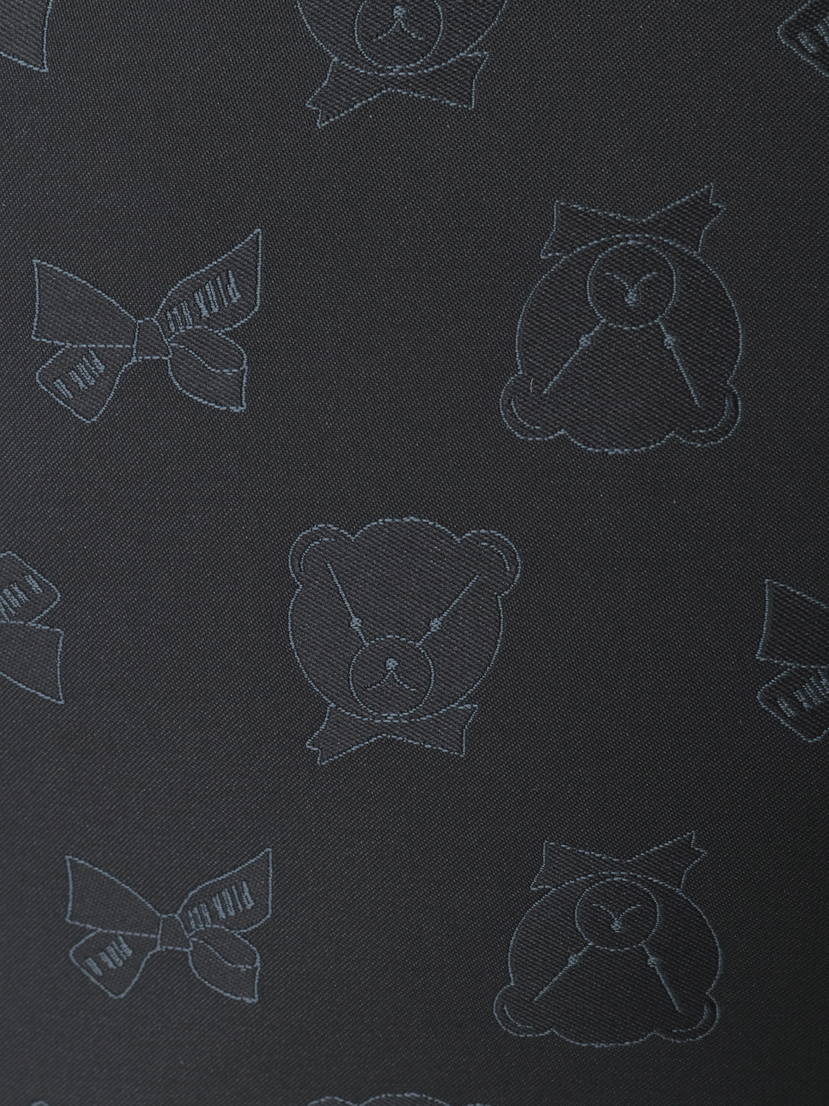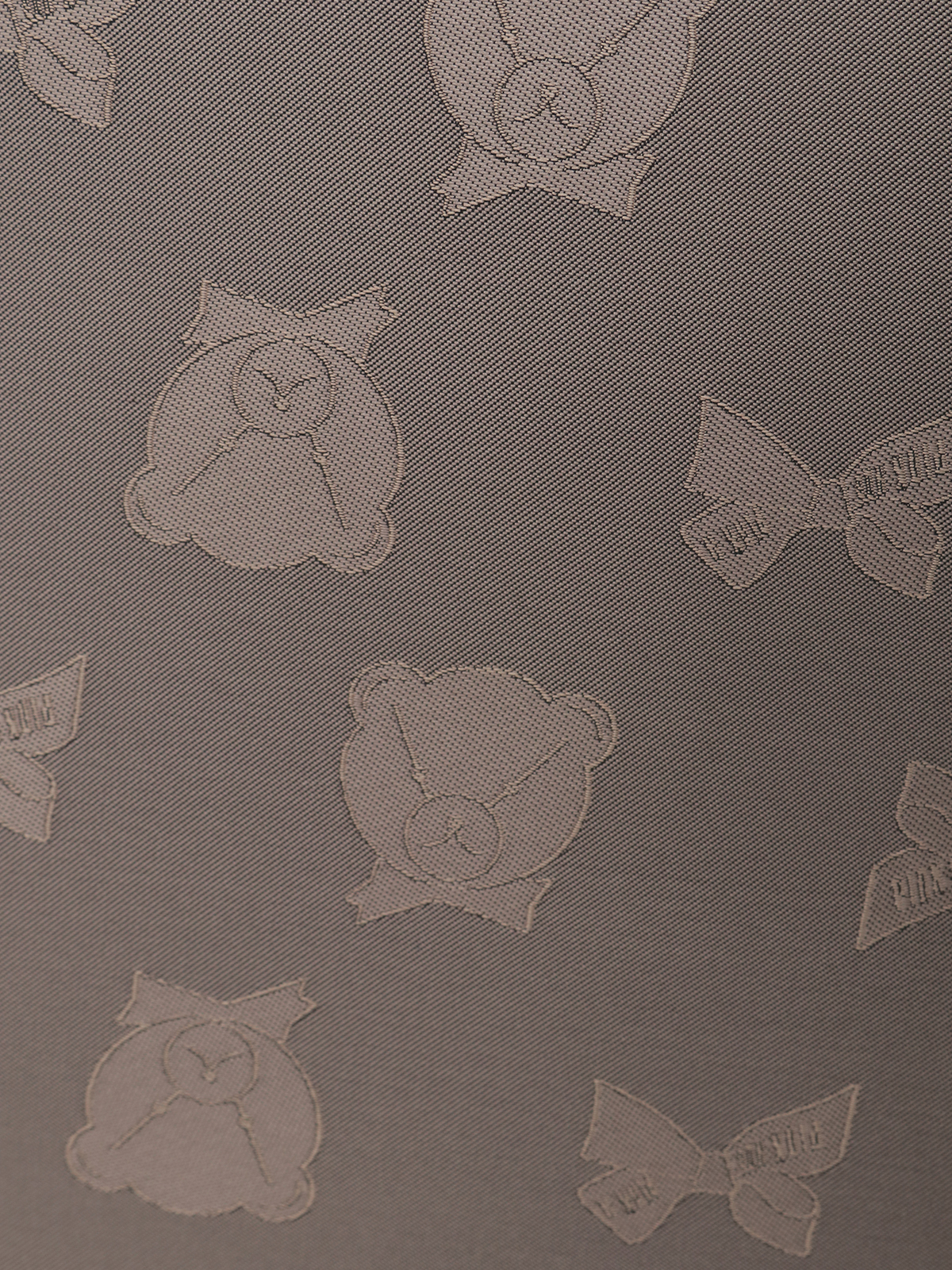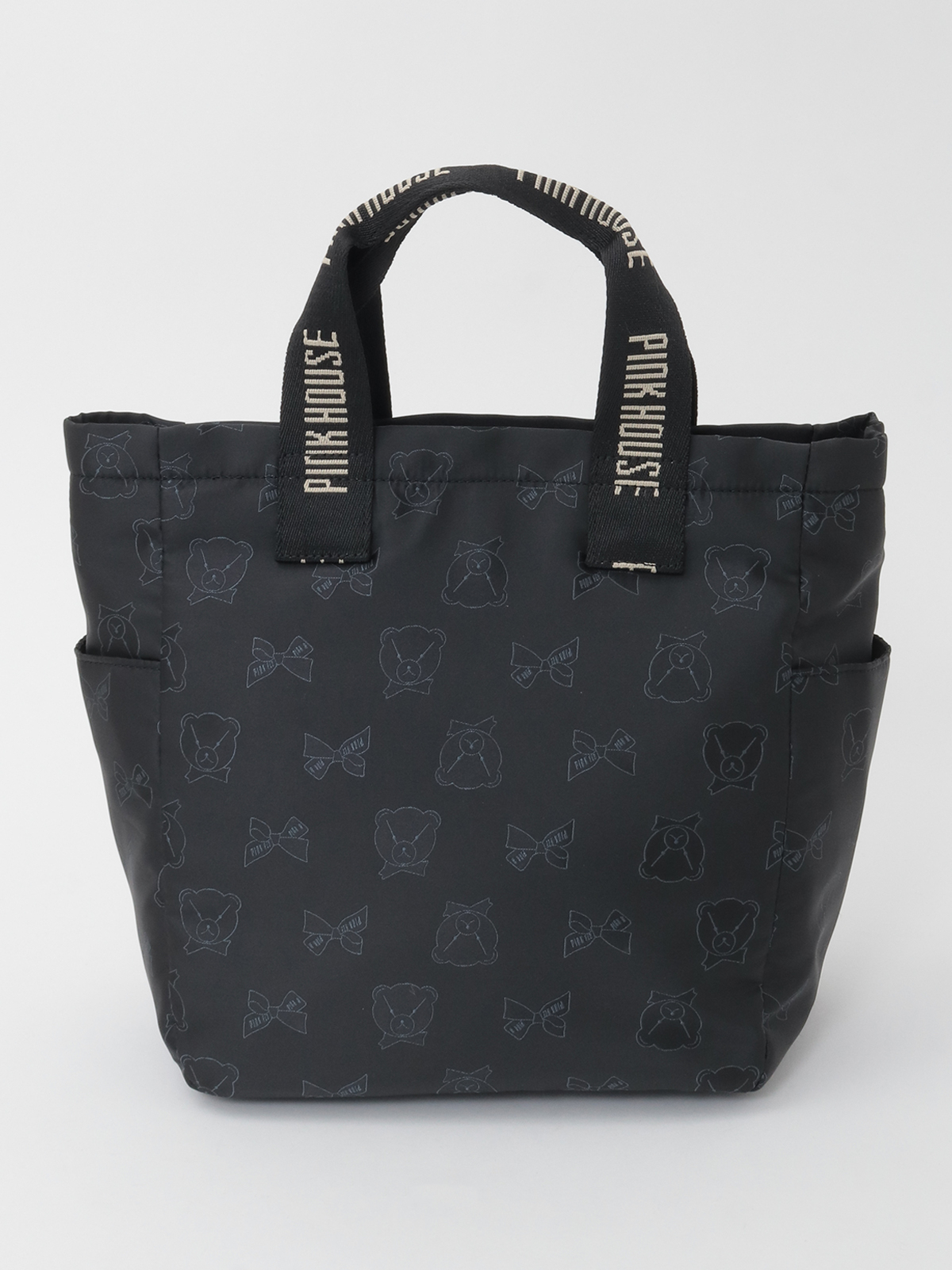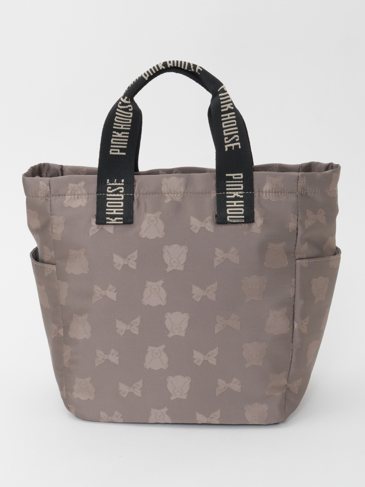 程よいハリ感と上品な光沢感のあるしっかりとしたポリエステル地に、顔くまとリボン、ピンクハウスを代表とするモチーフ柄を織り上げたオリジナルの生地で作られたリュックサック。