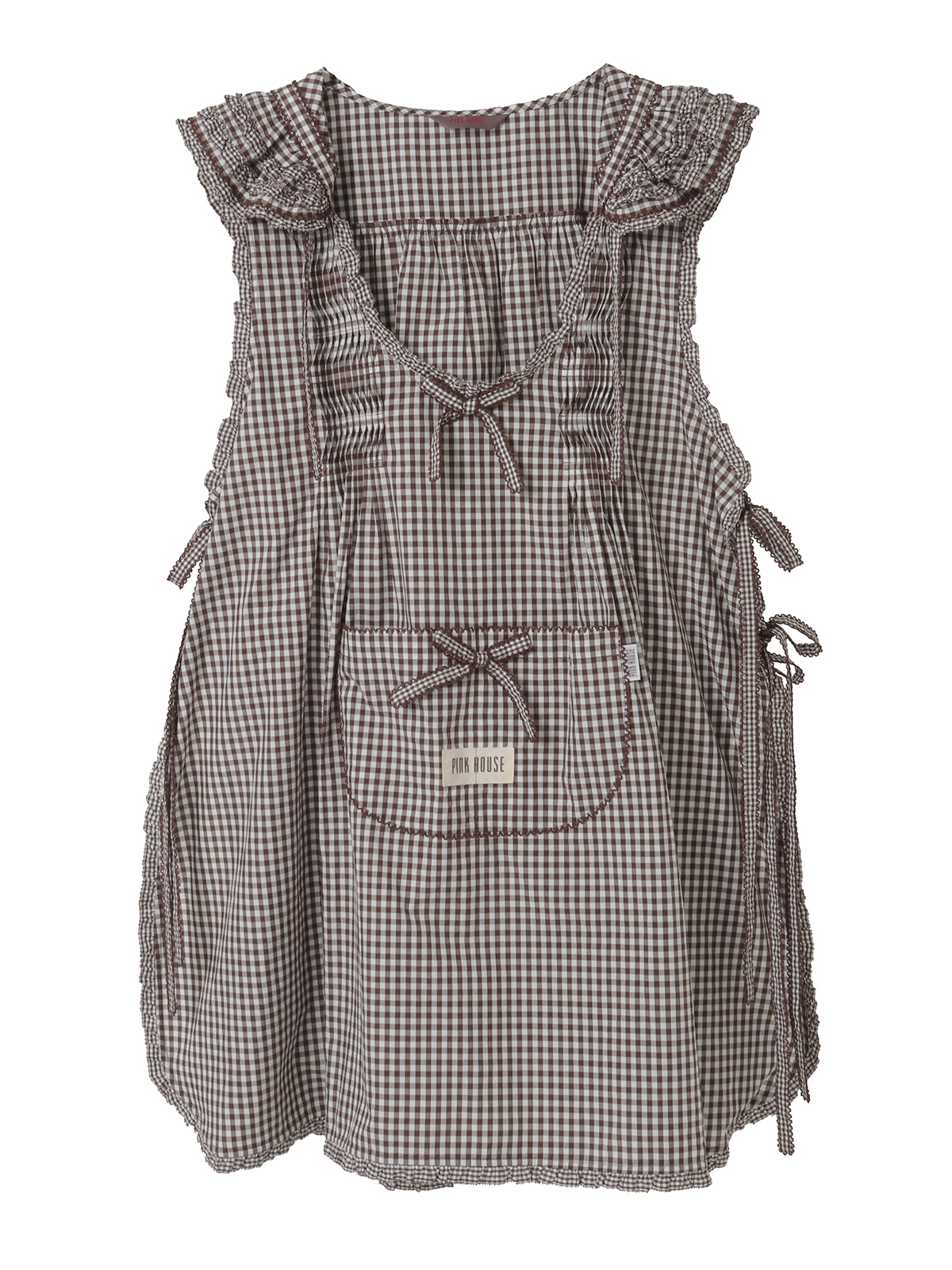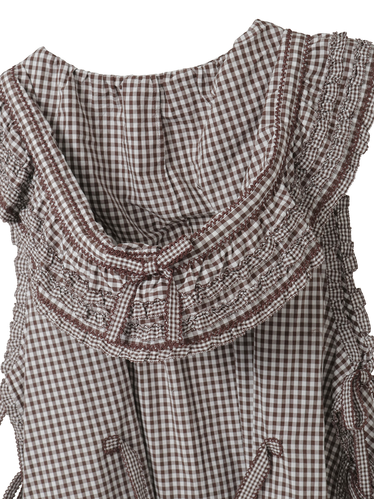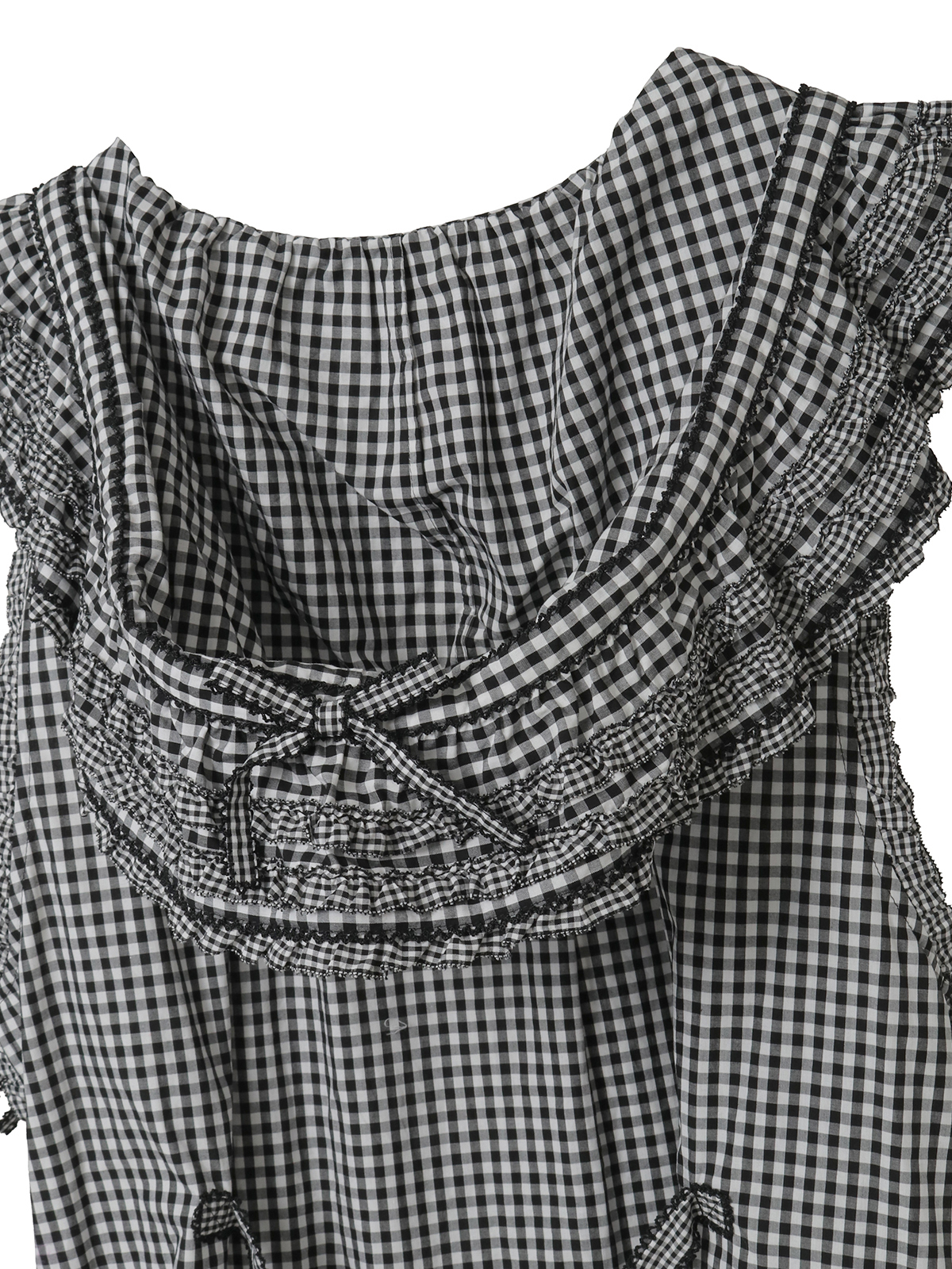 細かい格子の小ギンガムのフリルを部分使いにしたパッチワーク風のデザインがキュートで華やかな仕上がりに。