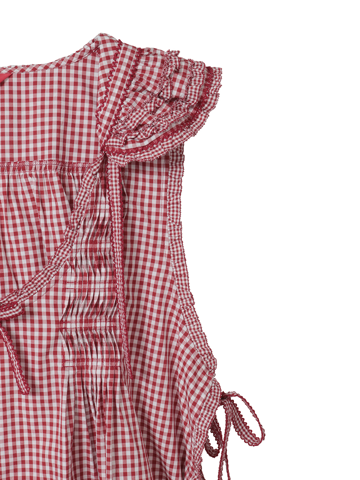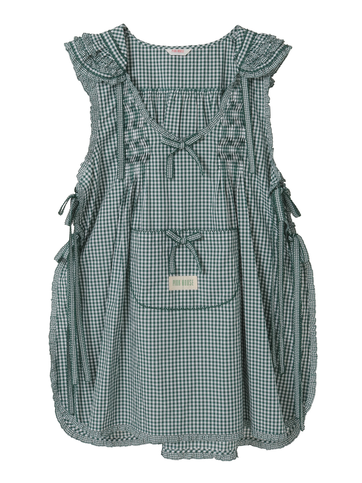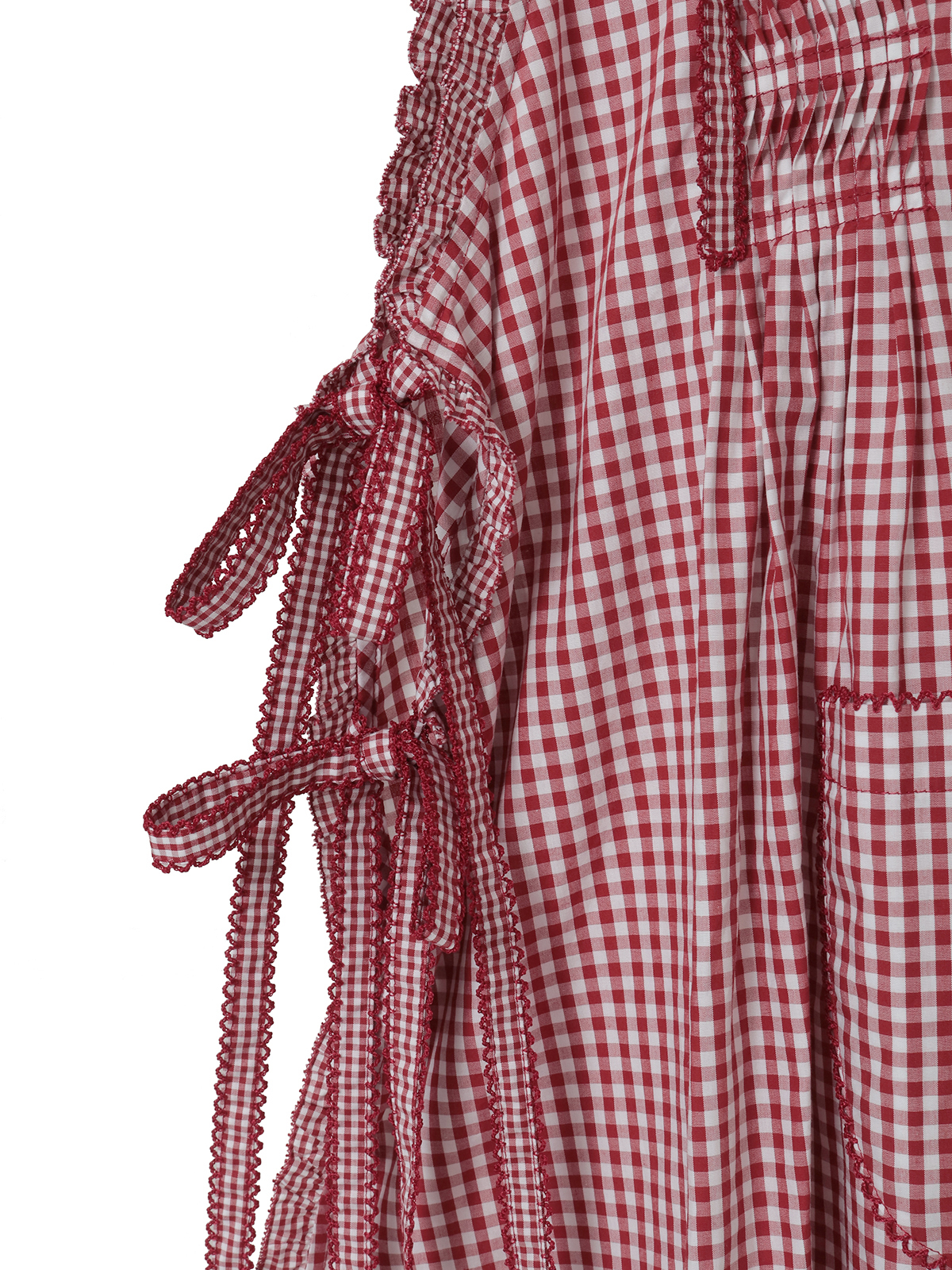 細かい格子の小ギンガムのフリルを部分使いにしたパッチワーク風のデザインがキュートで華やかな仕上がりに。