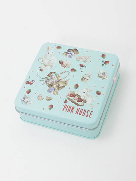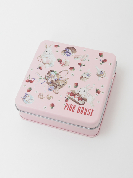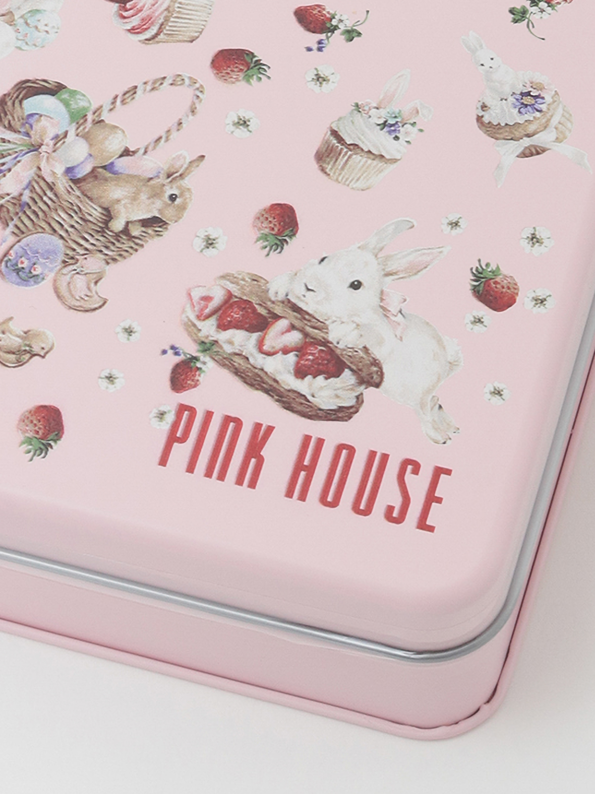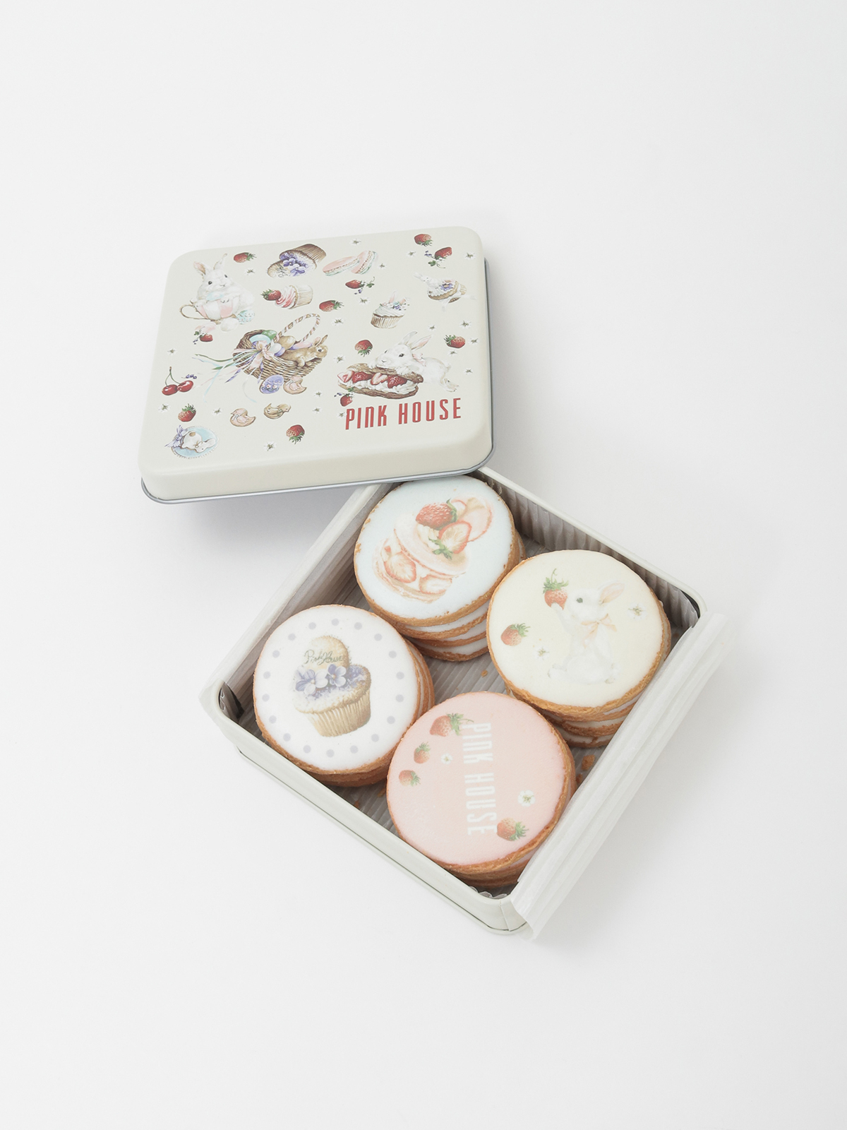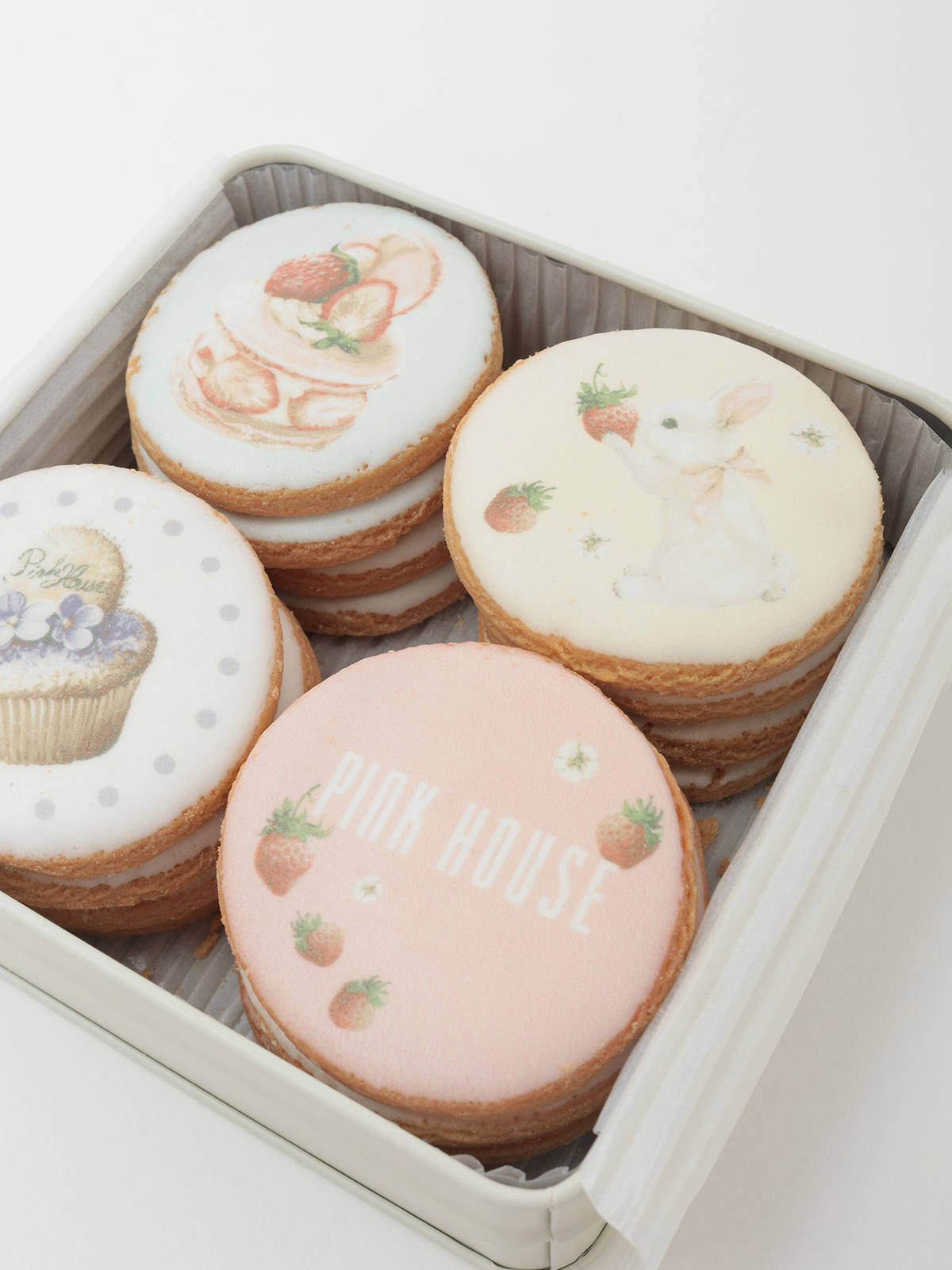 苺を両手にかかえた白うさぎに、苺を飾り立てたピンク色のマカロン、すみれの花を飾り立てたカップケーキに、PINK HOUSEのロゴに苺を散りばめた4種のアイシングクッキーがそれぞれ4セットづつ入った16枚入り。