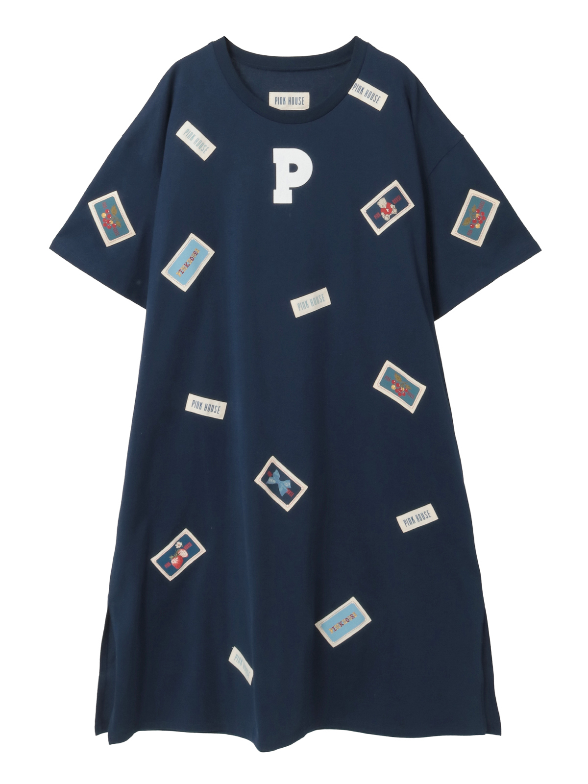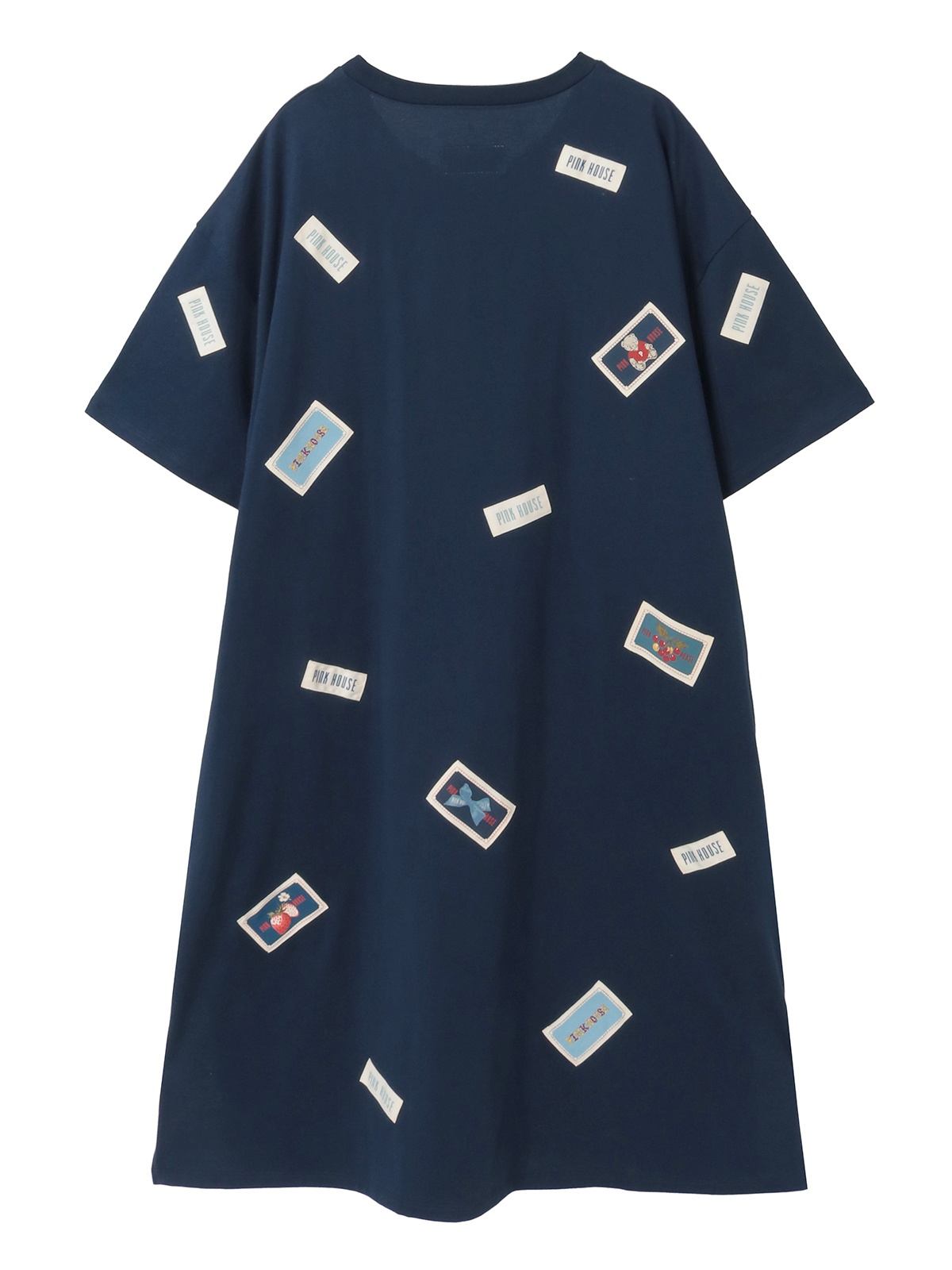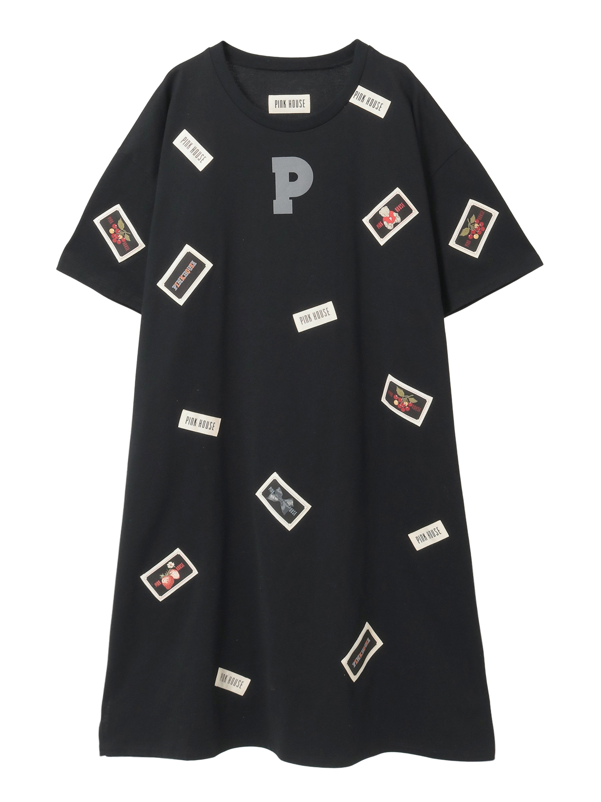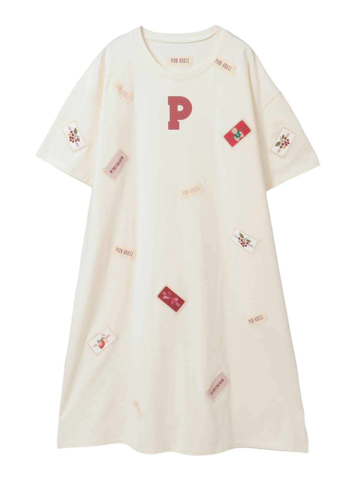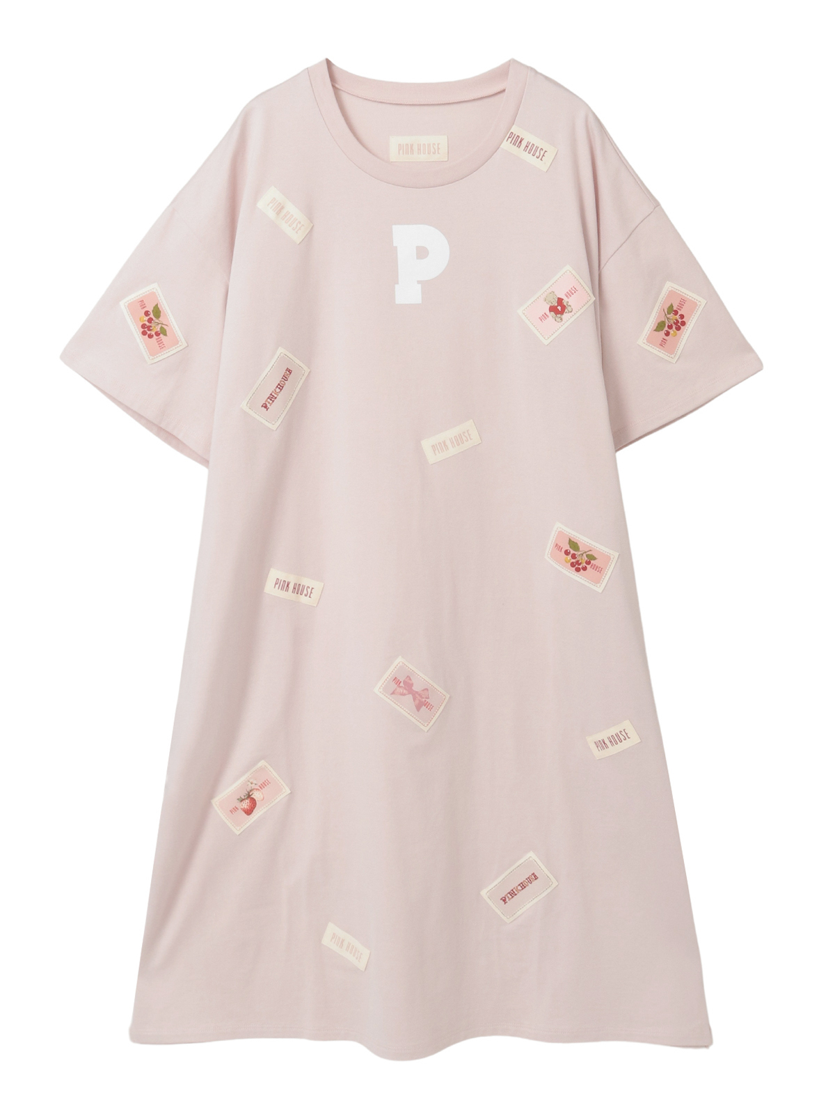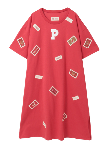 そのまわりを、ピンクハウスを代表とする「顔クマネーム」や「マーガレットネーム」などをロゴネームと共に身ごろいっぱいにあしらったカットソーワンピース。