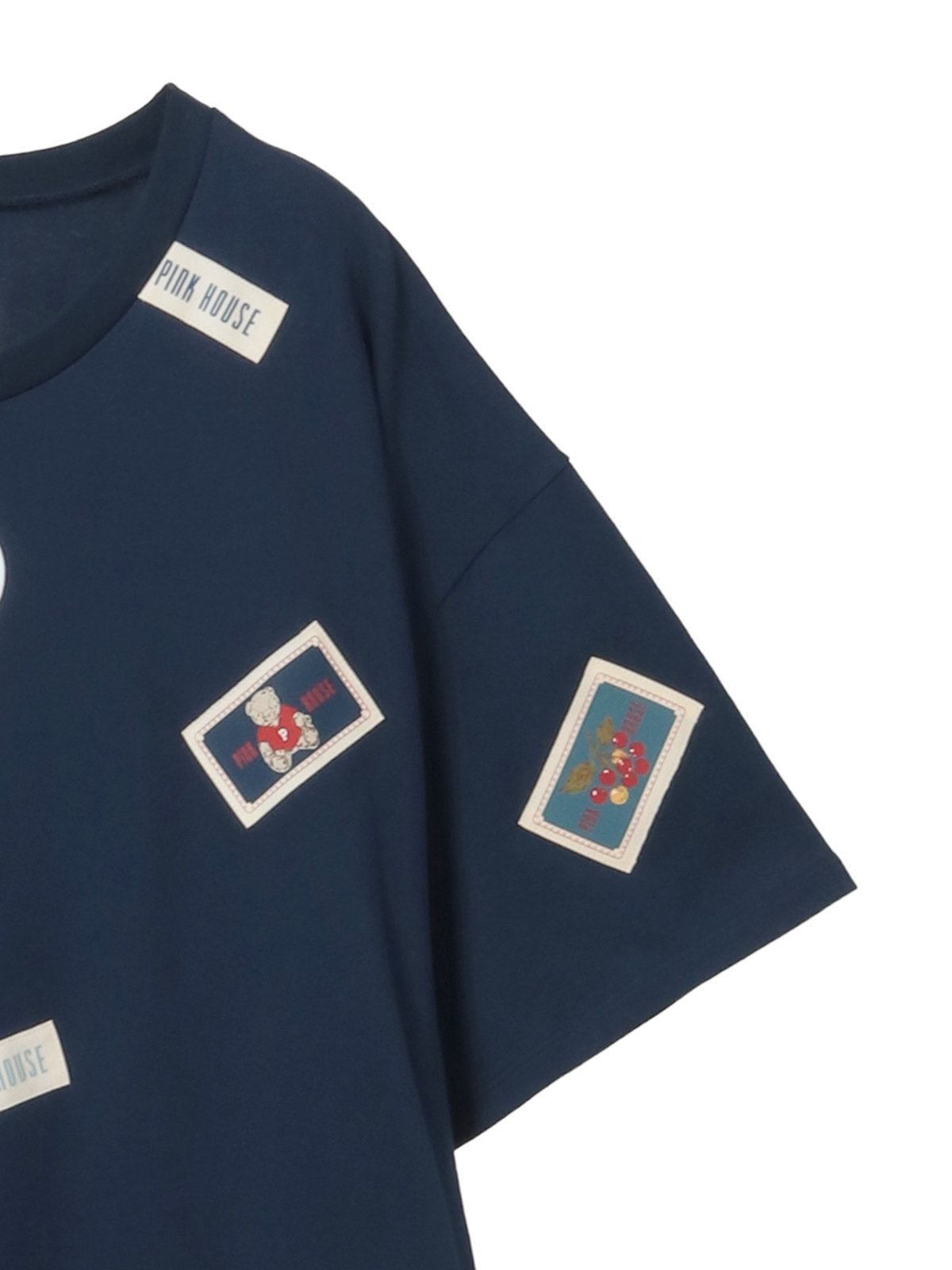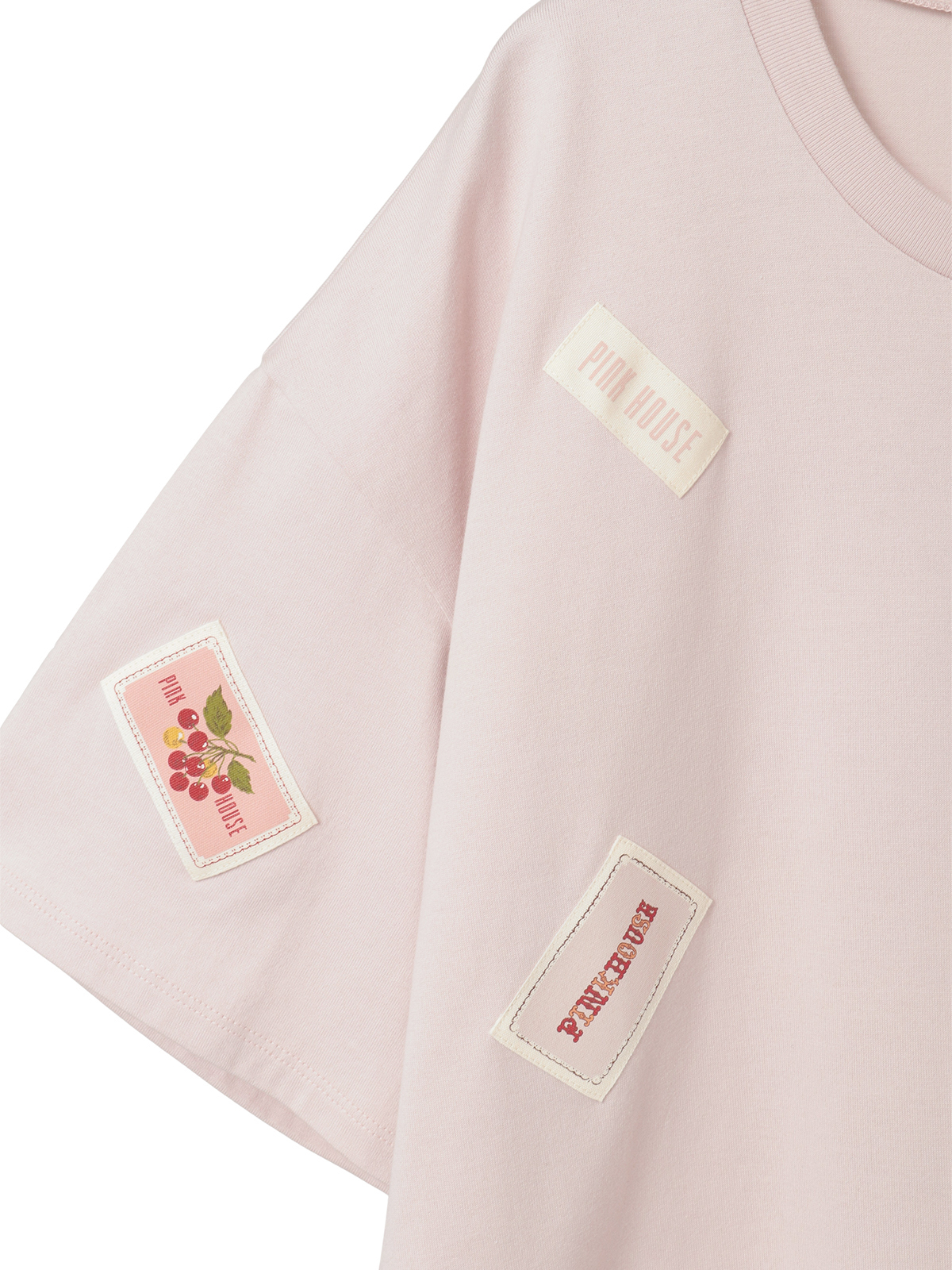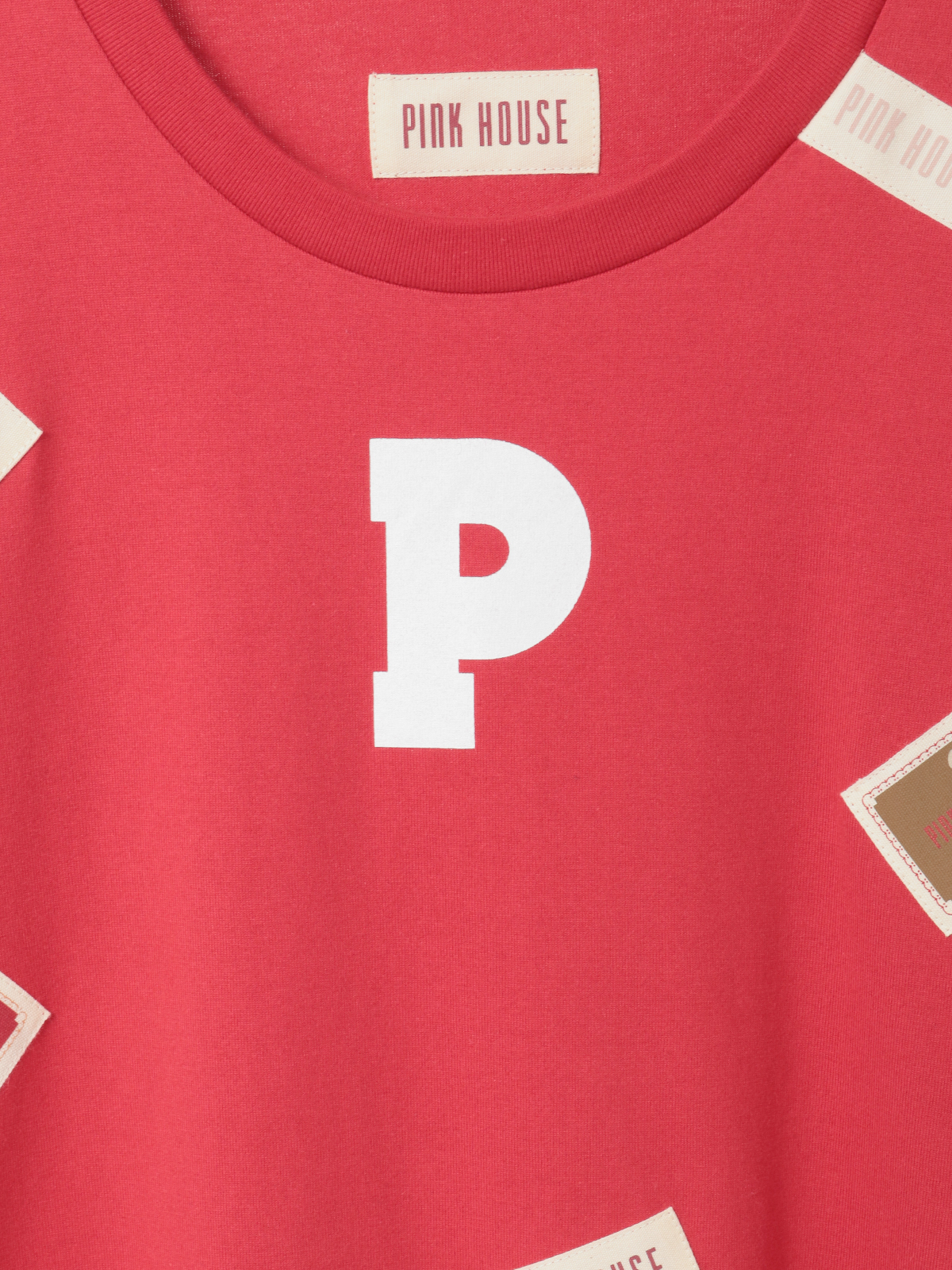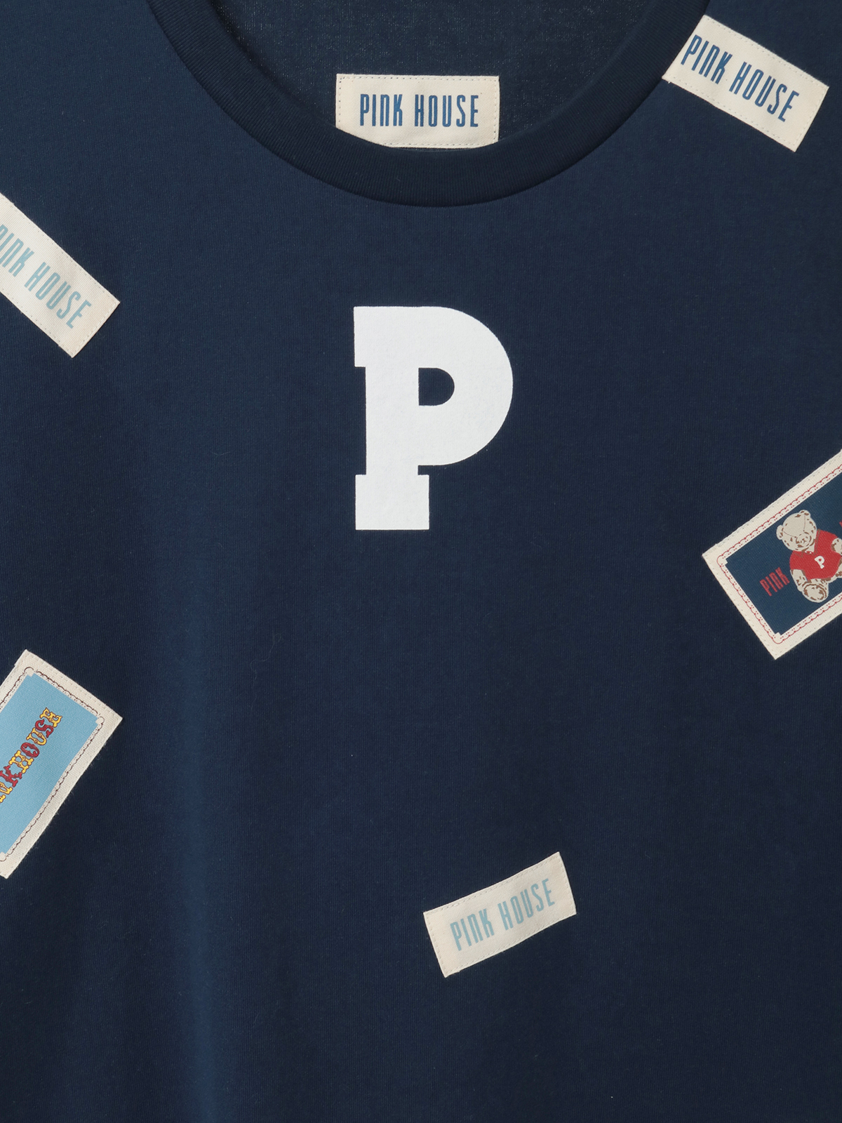 そのまわりを、ピンクハウスを代表とする「顔クマネーム」や「マーガレットネーム」などをロゴネームと共に身ごろいっぱいにあしらったカットソーワンピース。