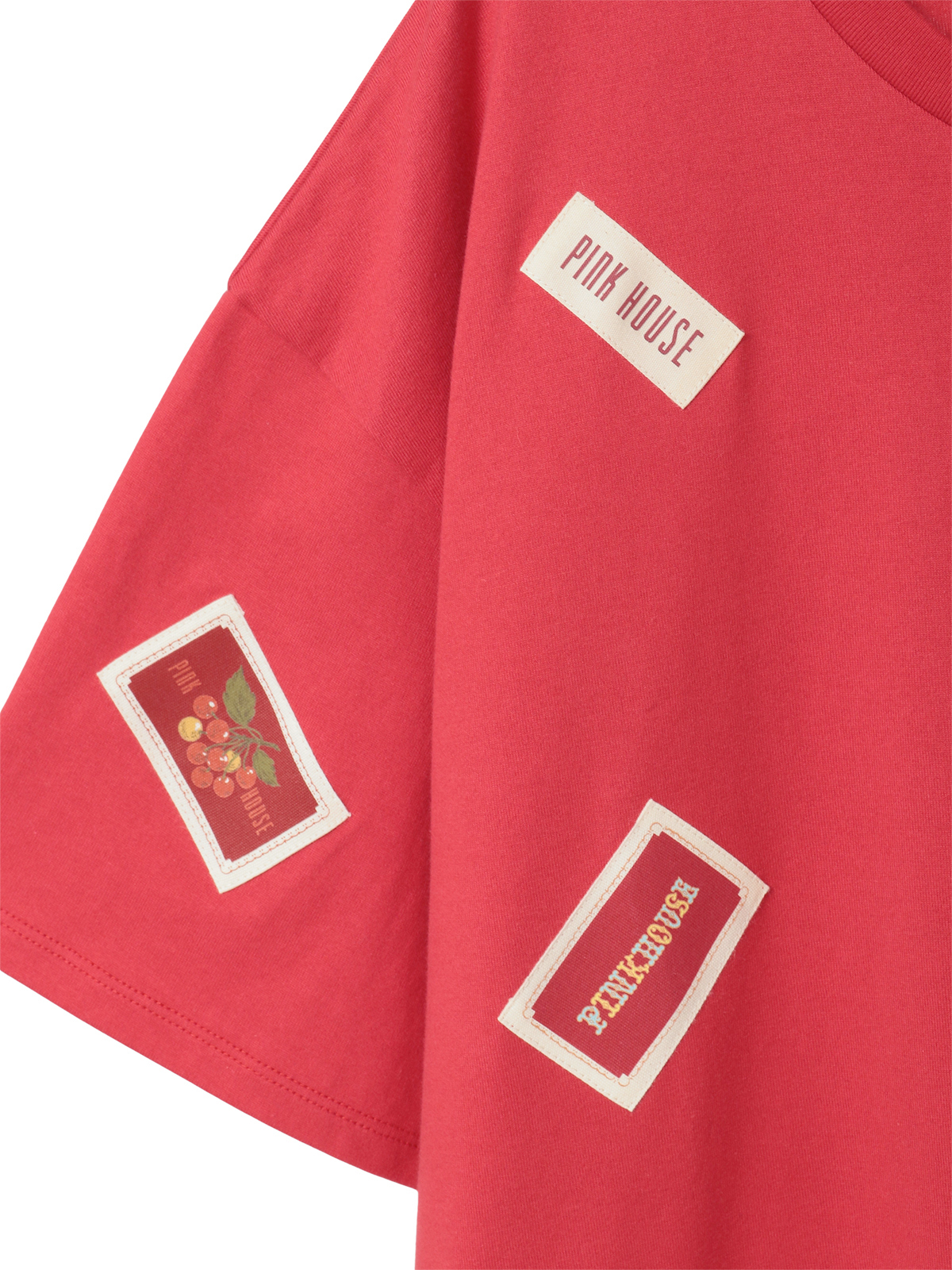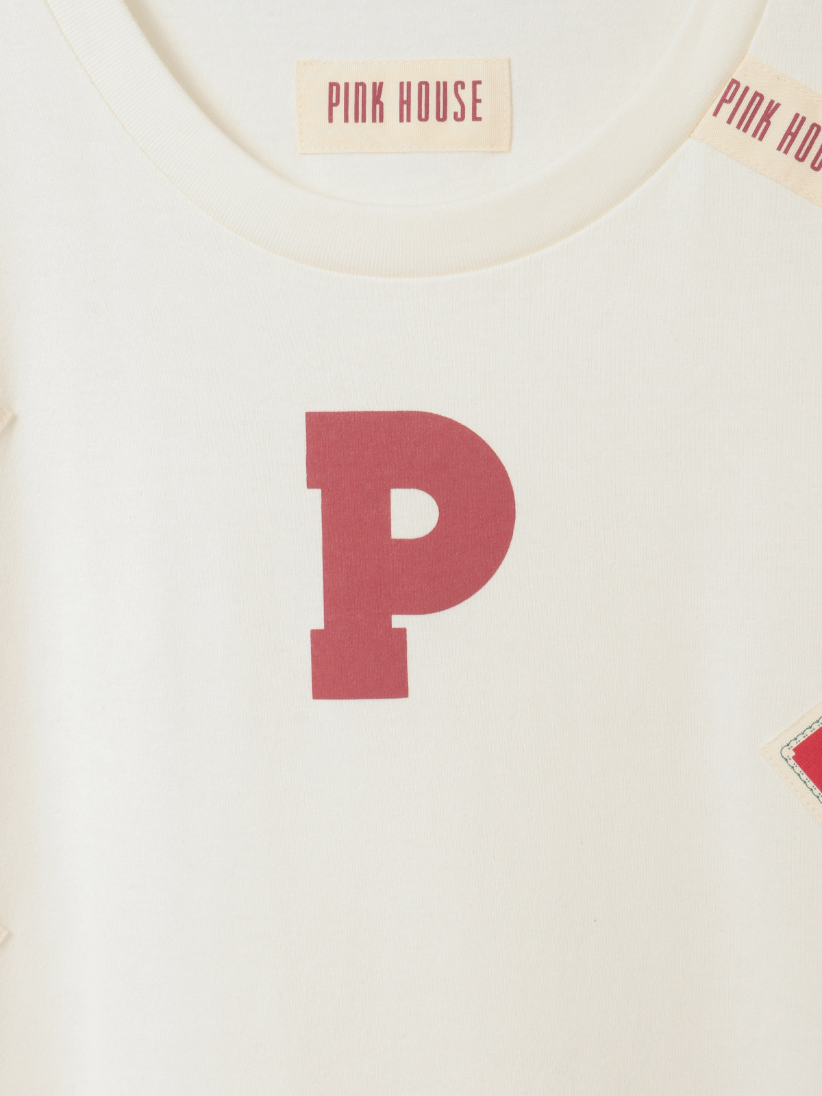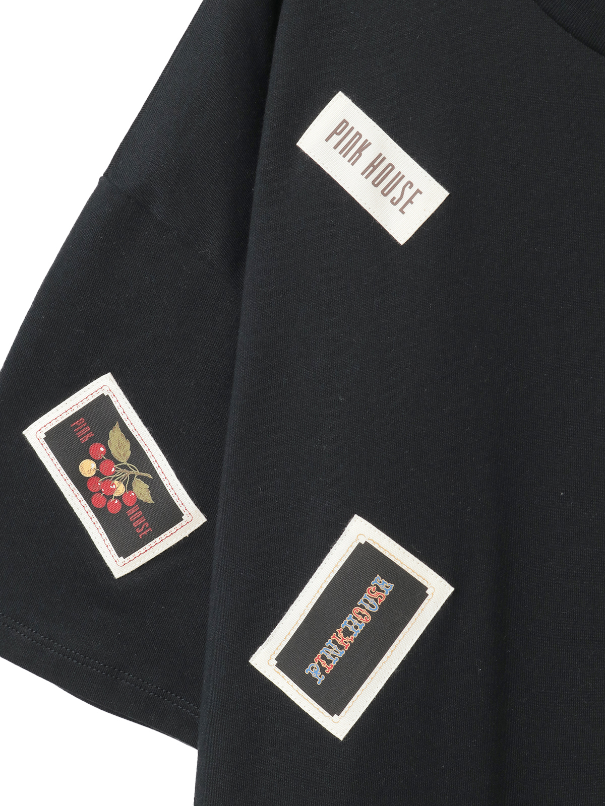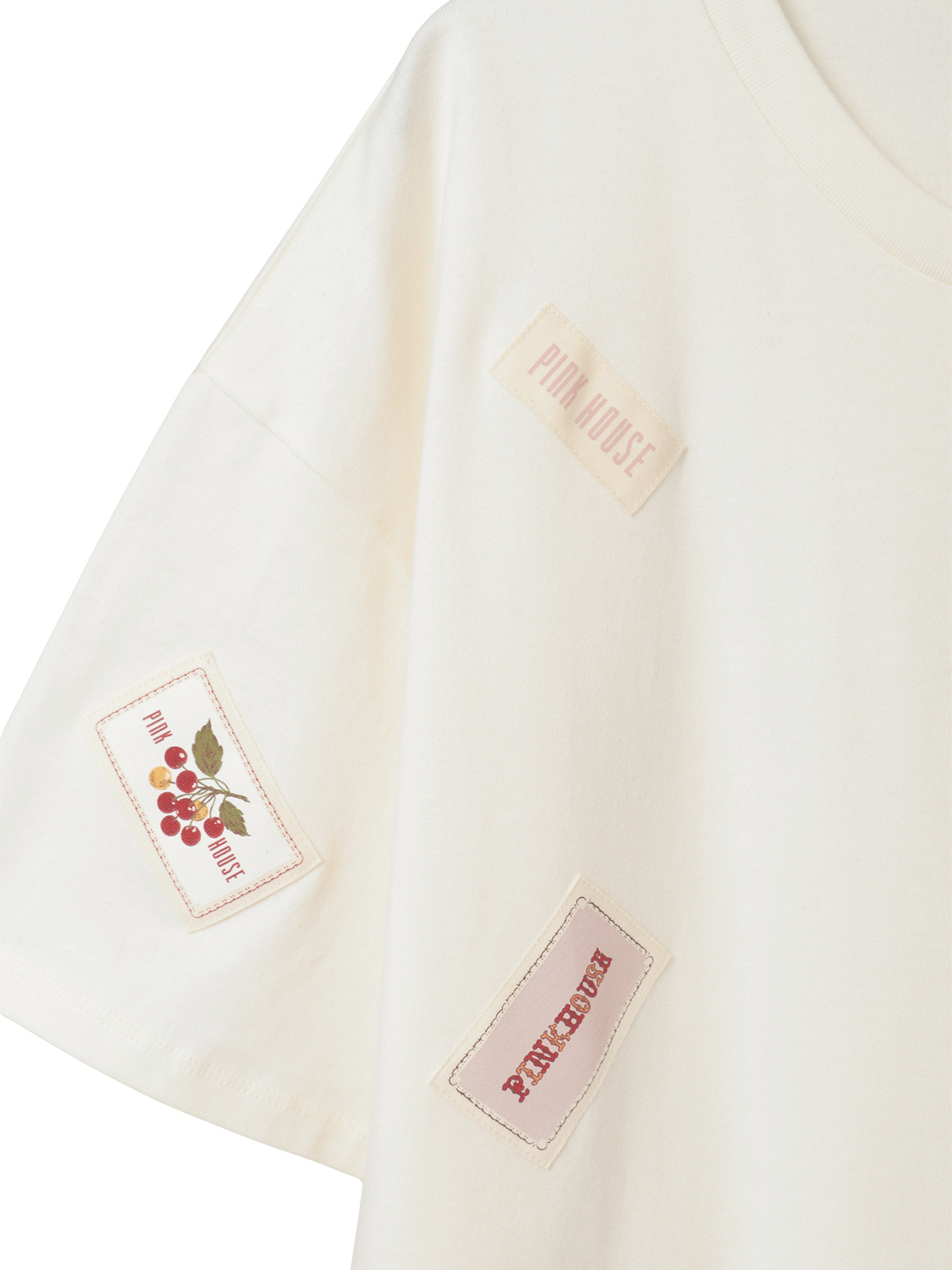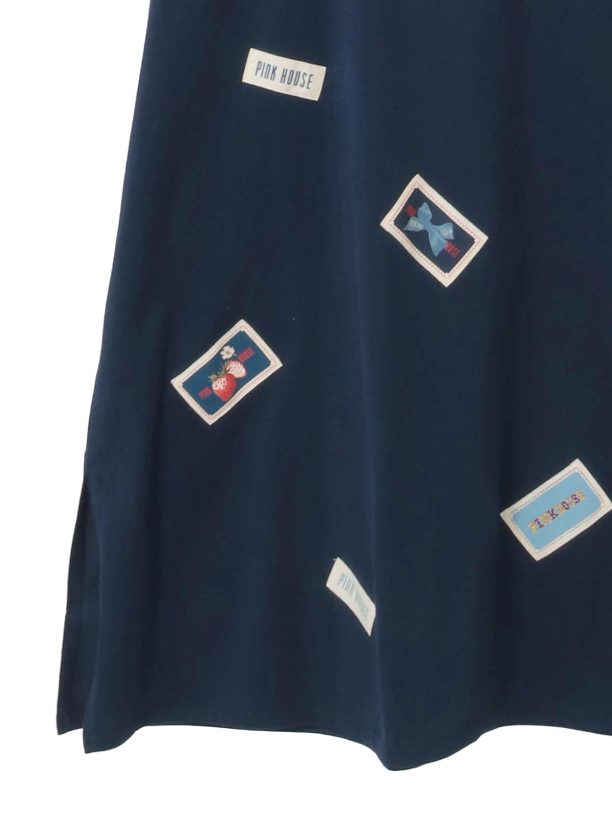 そのまわりを、ピンクハウスを代表とする「顔クマネーム」や「マーガレットネーム」などをロゴネームと共に身ごろいっぱいにあしらったカットソーワンピース。