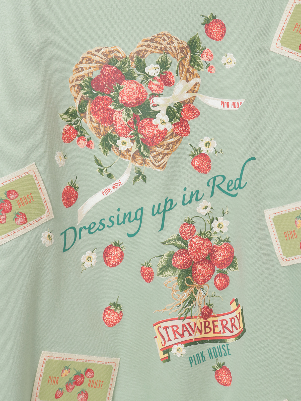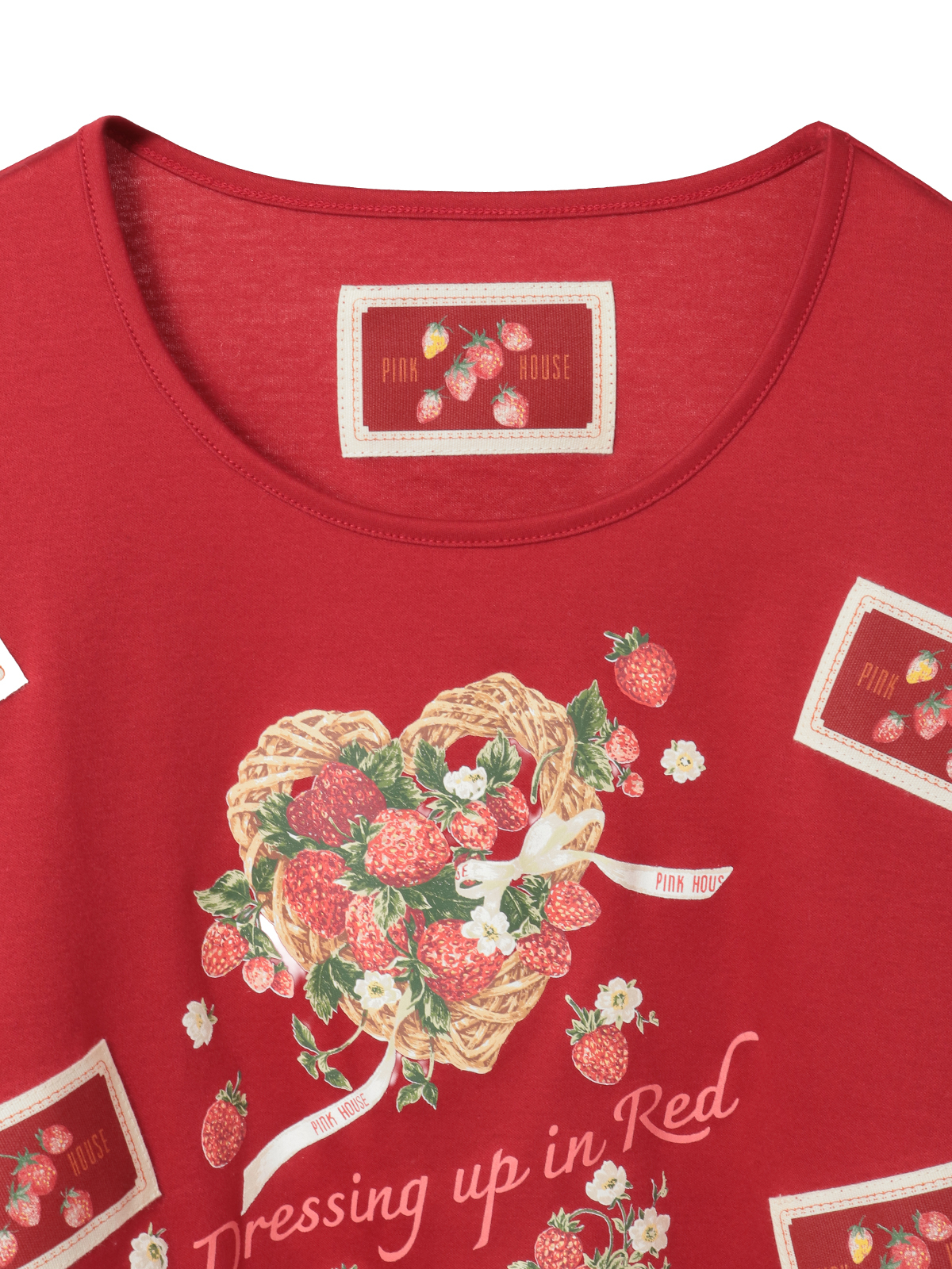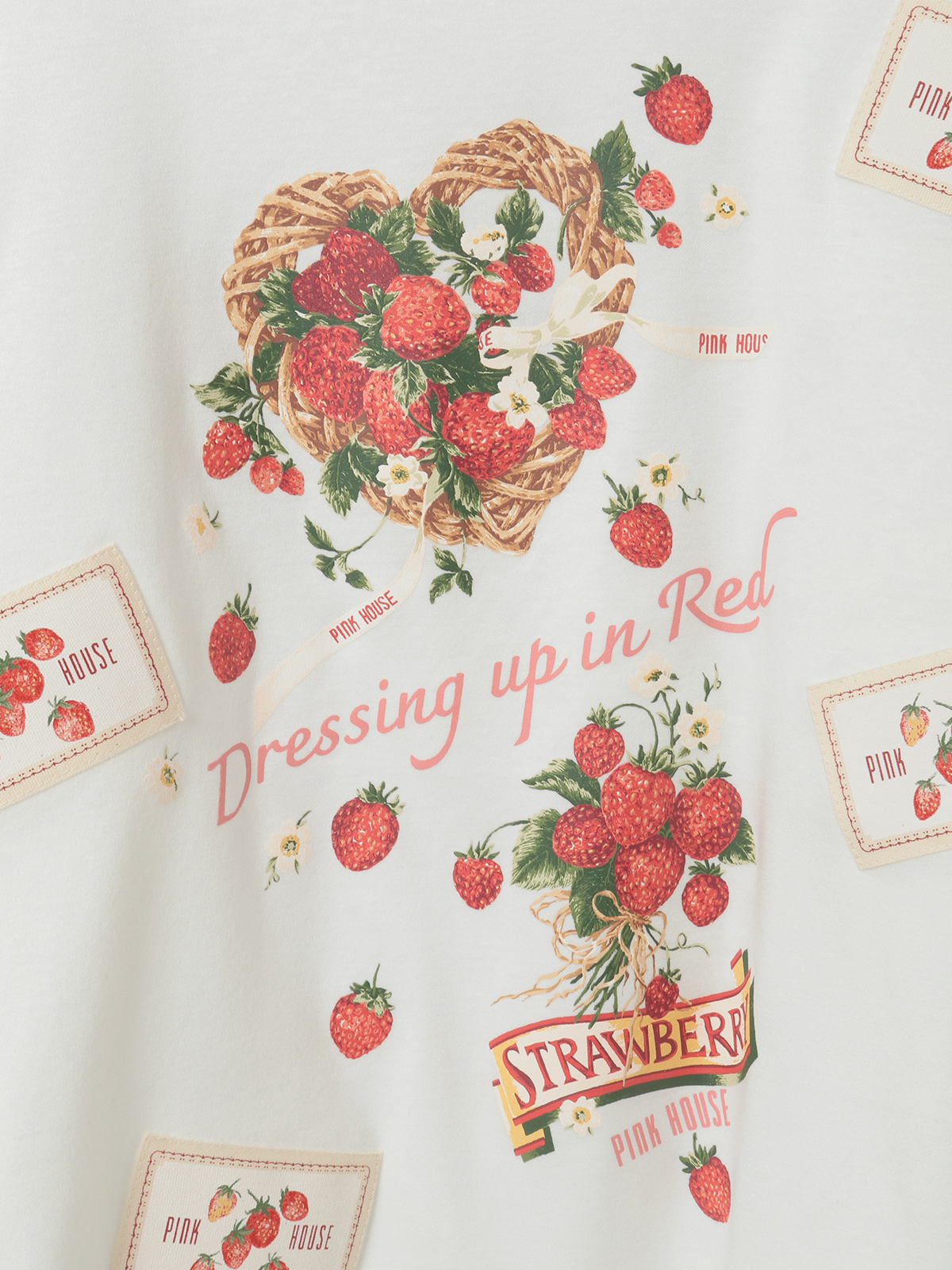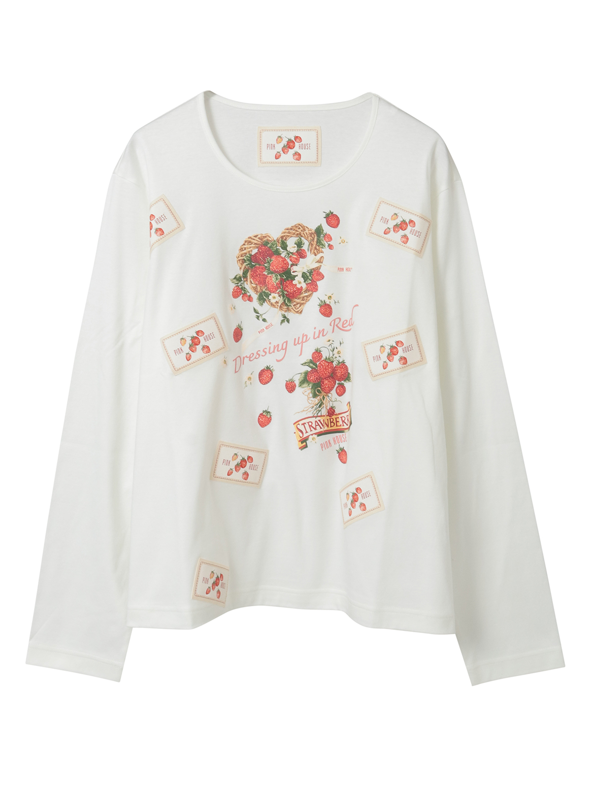 「苺リースプリント」に描かれた、ちいさな苺ブーケとハート型の苺リースをそれぞれピックアップしてフロントにプリントしたカットソー。
