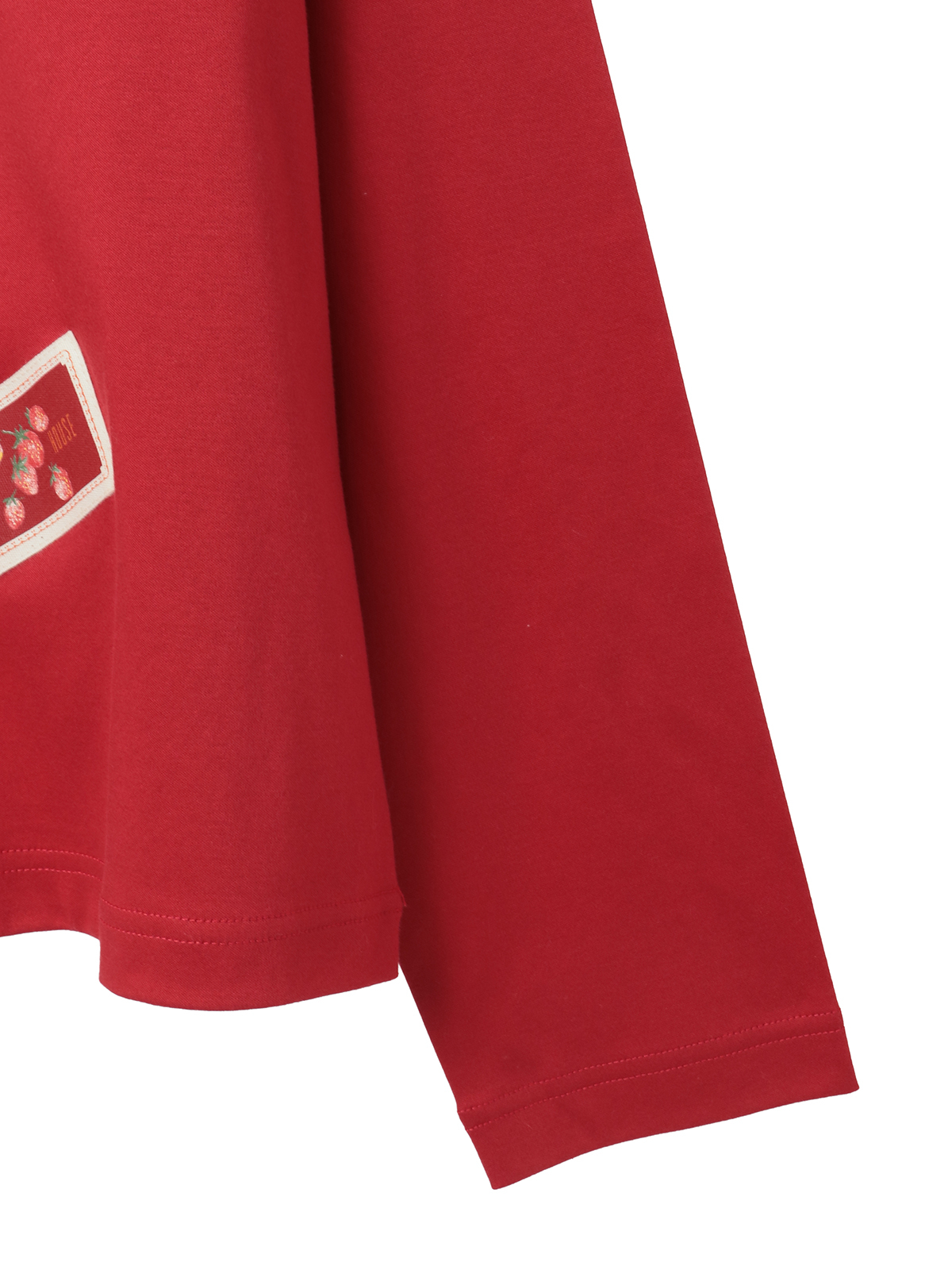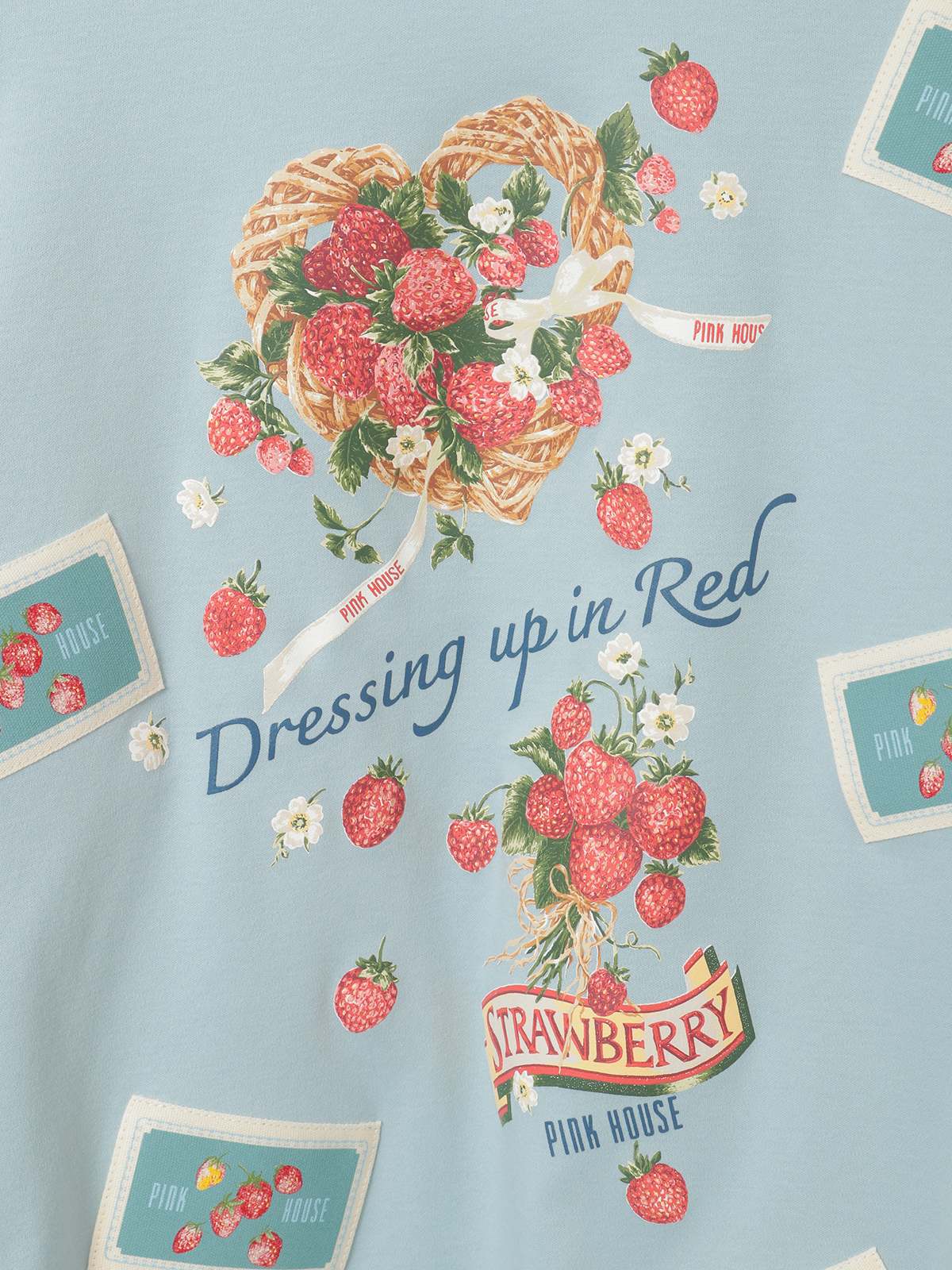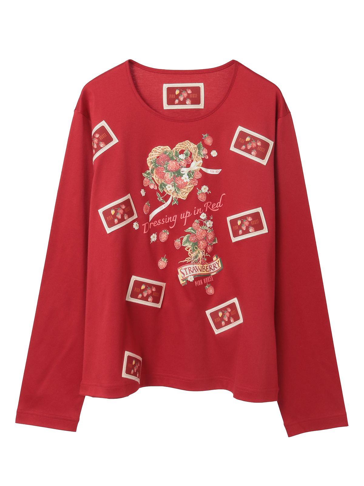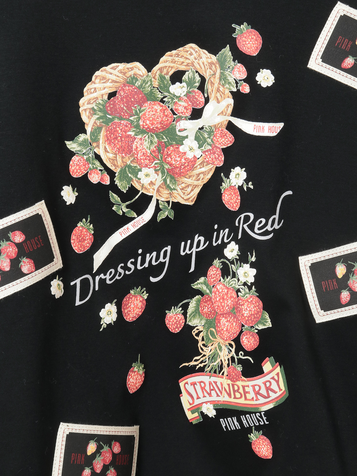 「苺リースプリント」に描かれた、ちいさな苺ブーケとハート型の苺リースをそれぞれピックアップしてフロントにプリントしたカットソー。
