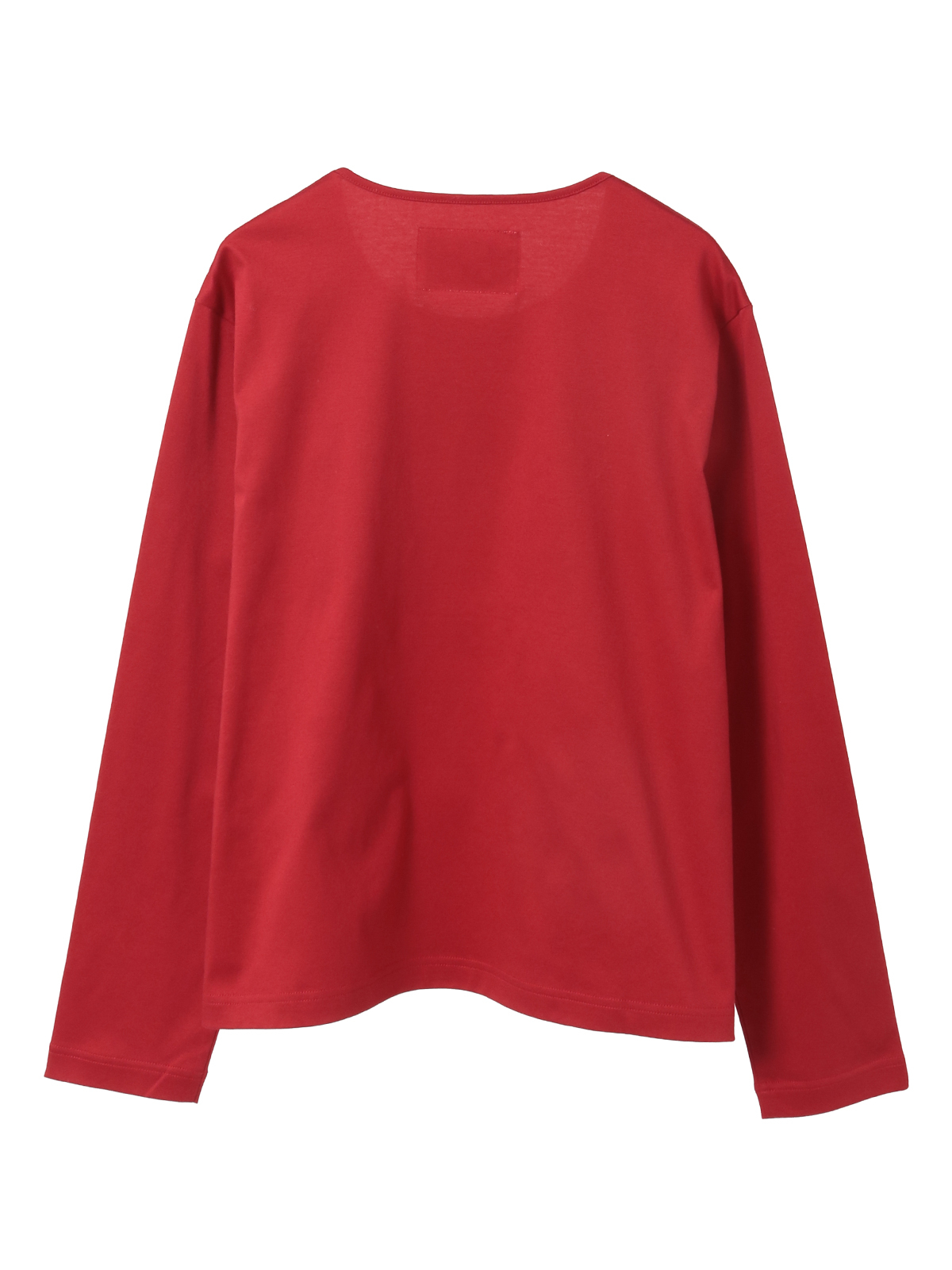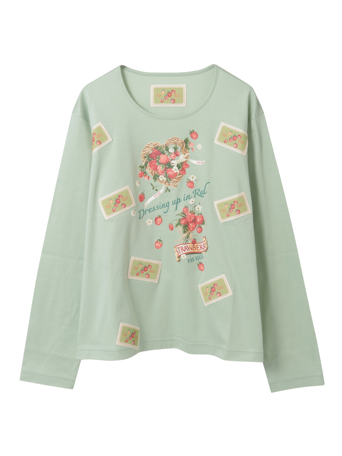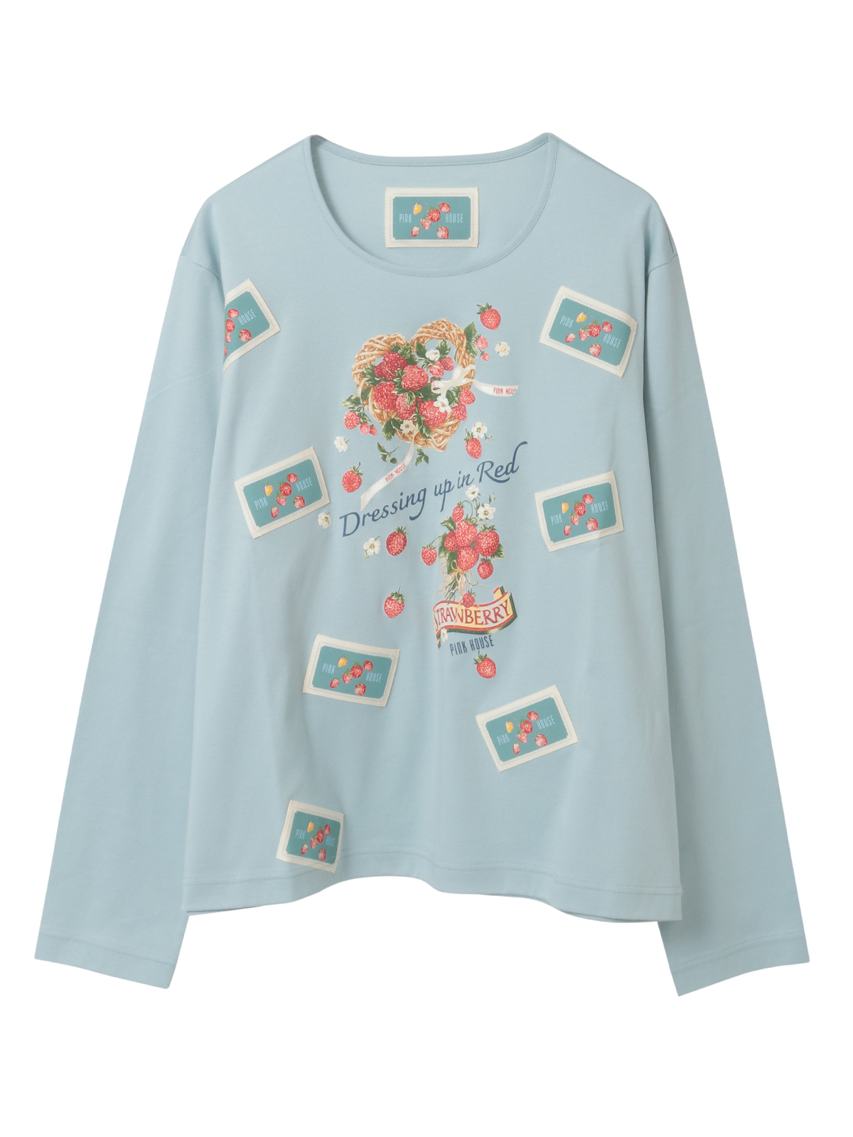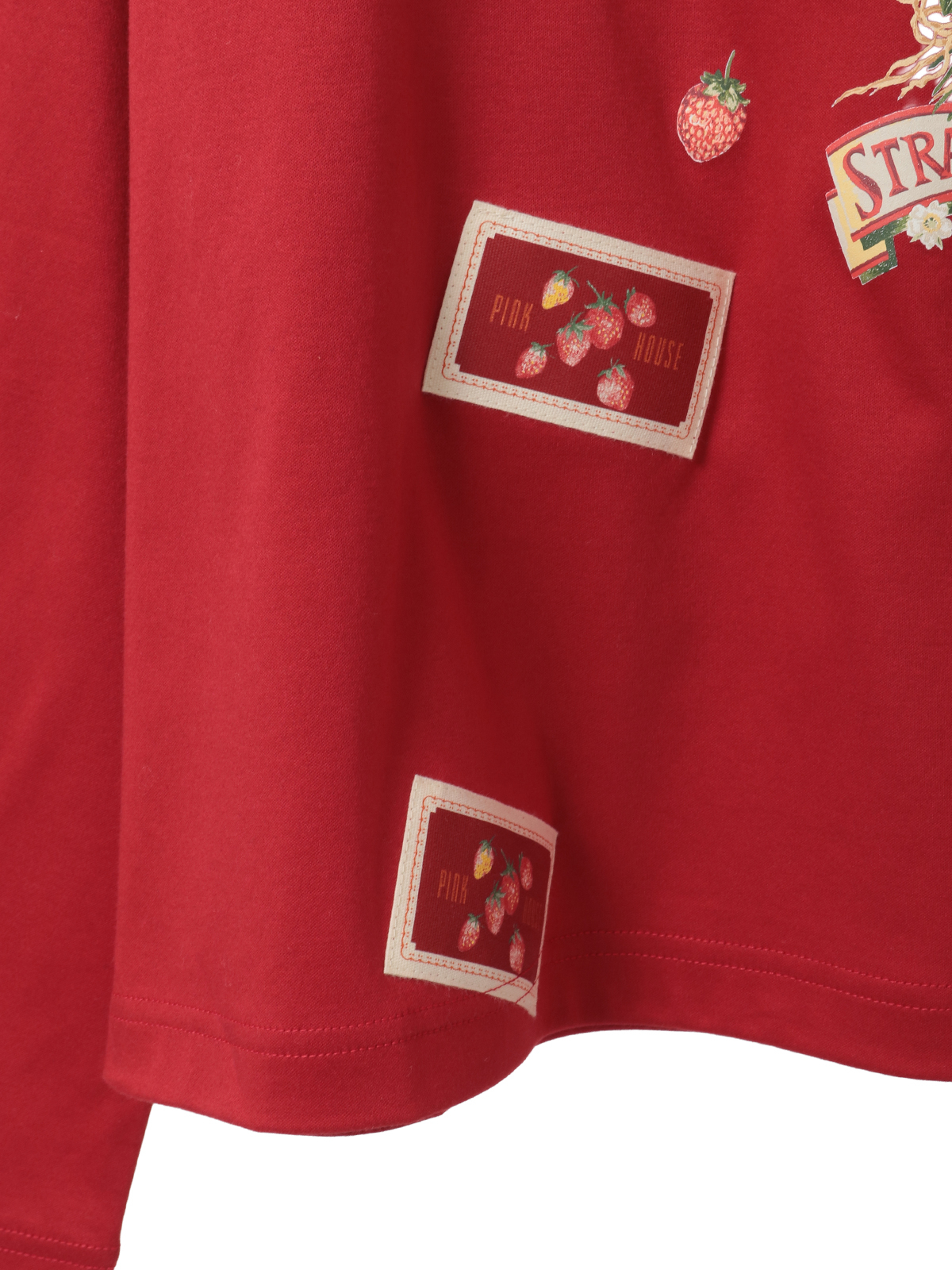 「苺リースプリント」に描かれた、ちいさな苺ブーケとハート型の苺リースをそれぞれピックアップしてフロントにプリントしたカットソー。