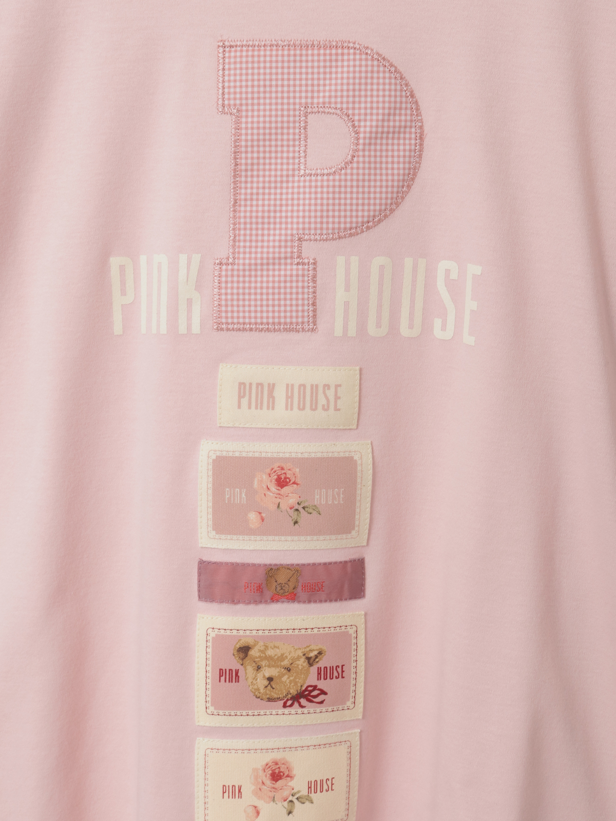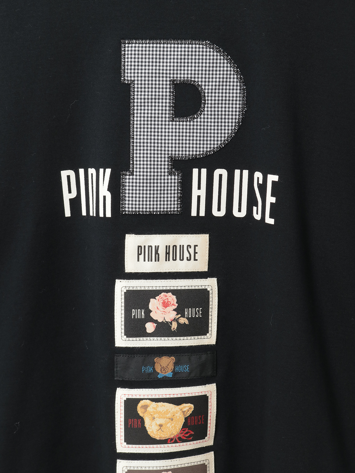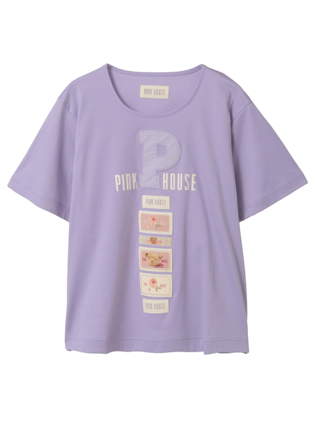 存在感あるPロゴアップリケのまわりには、PINK HOUSEのロゴプリントを添えて。