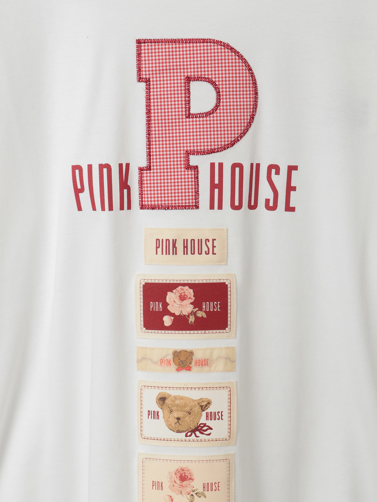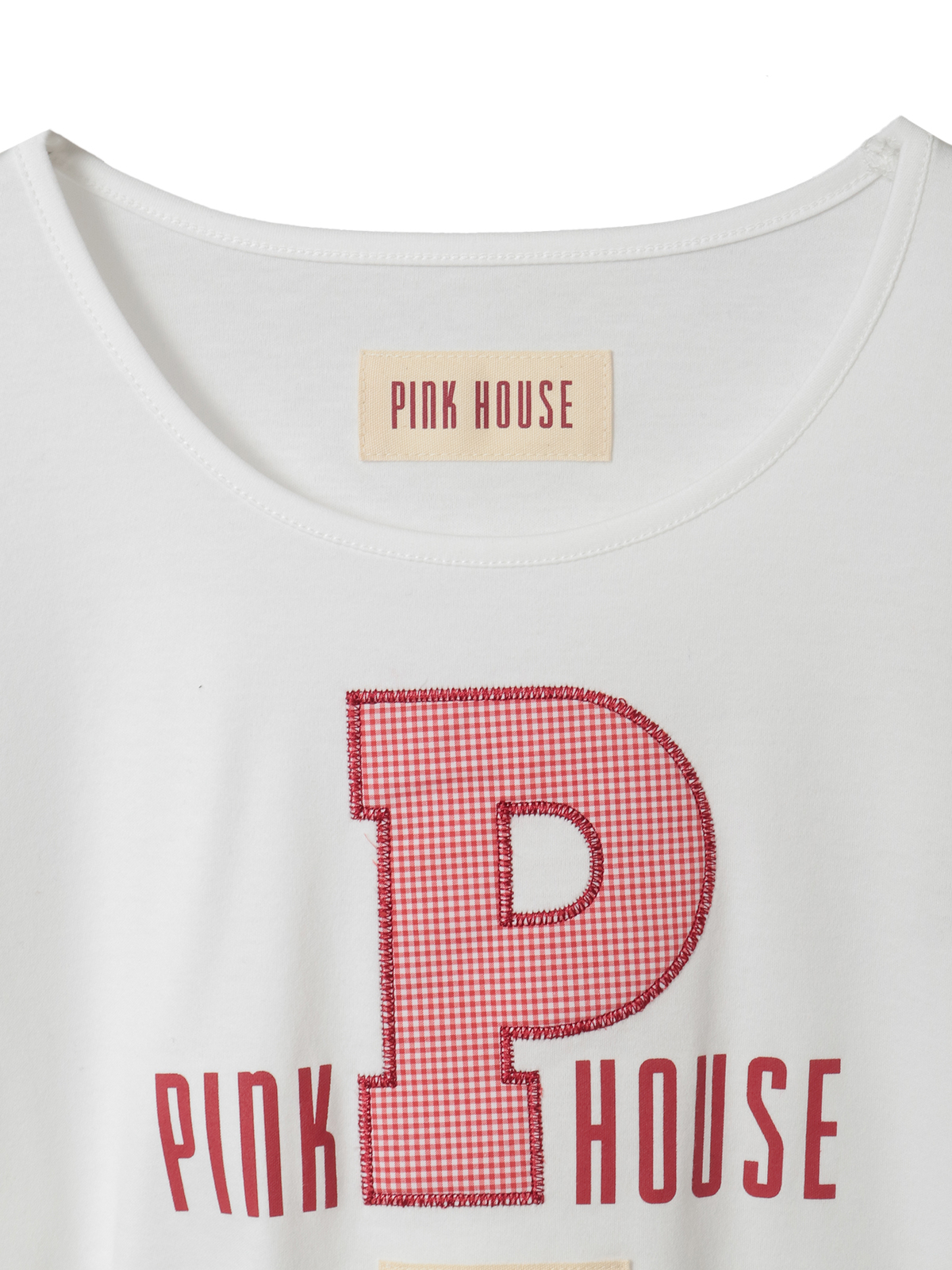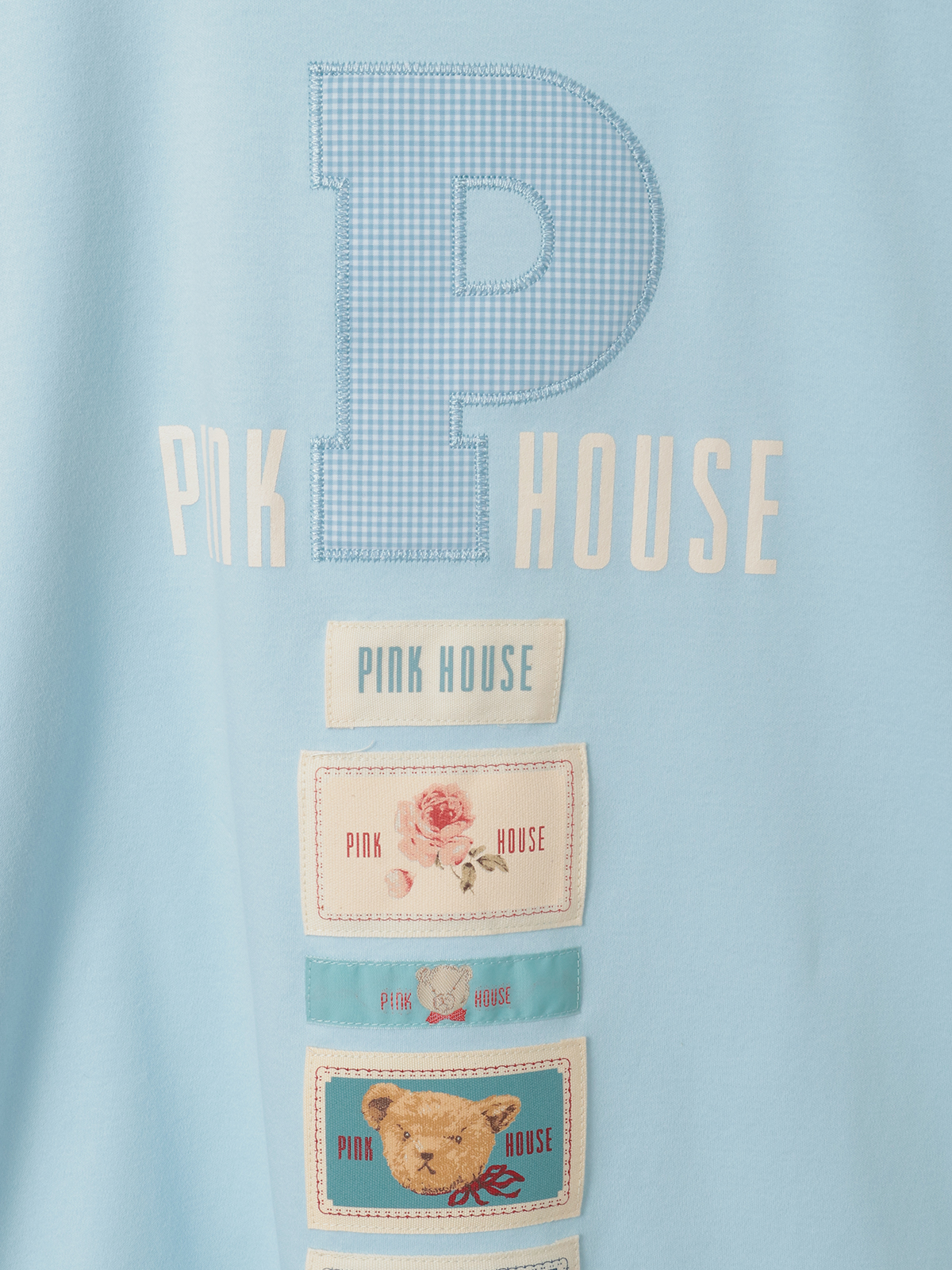 存在感あるPロゴアップリケのまわりには、PINK HOUSEのロゴプリントを添えて。
