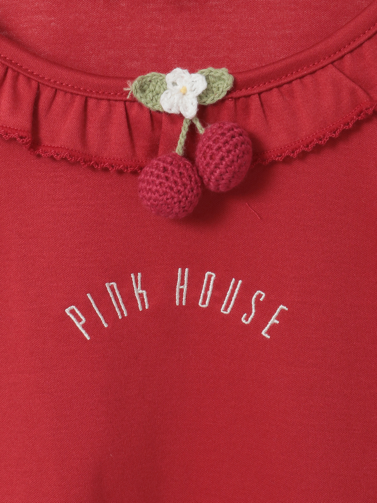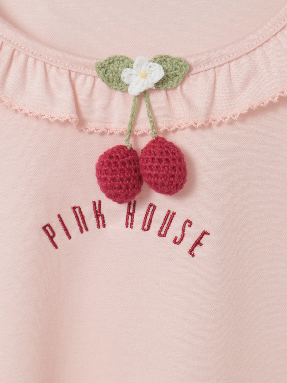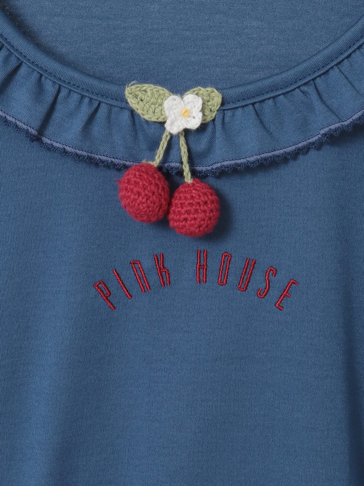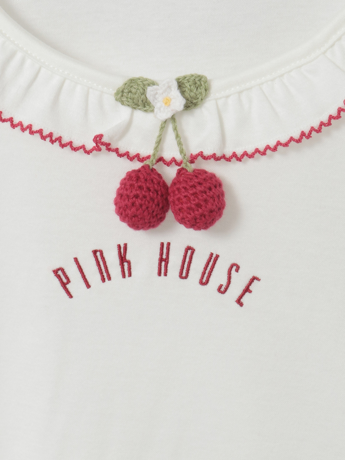 「さくらんぼの日曜日」プリントに描かれた、まあるく実ったさくらんぼを可愛らしいニットモチーフにして、首もとにちょこんとあしらってワンポイントに。