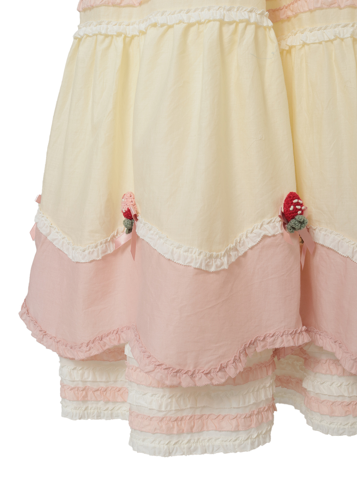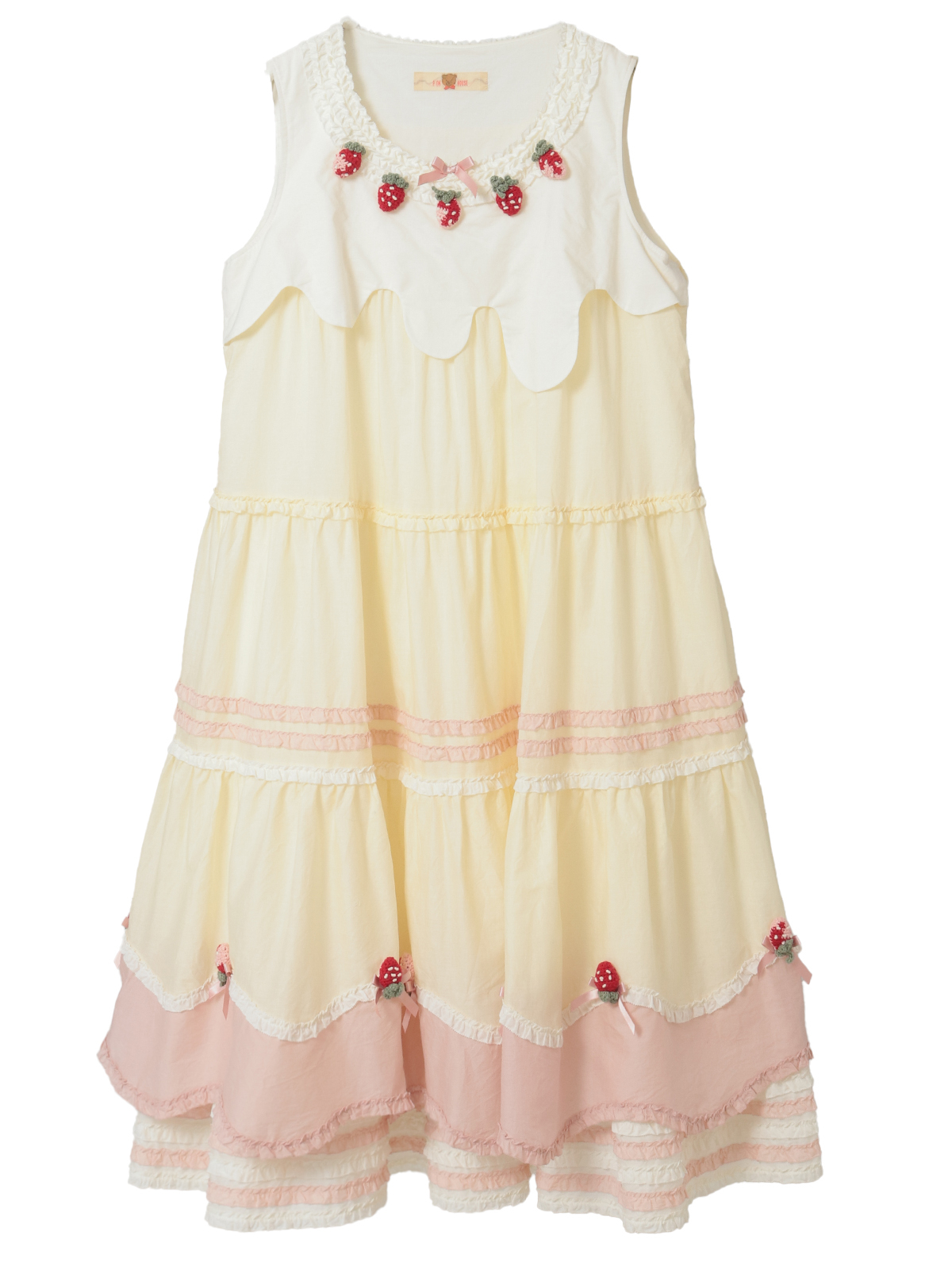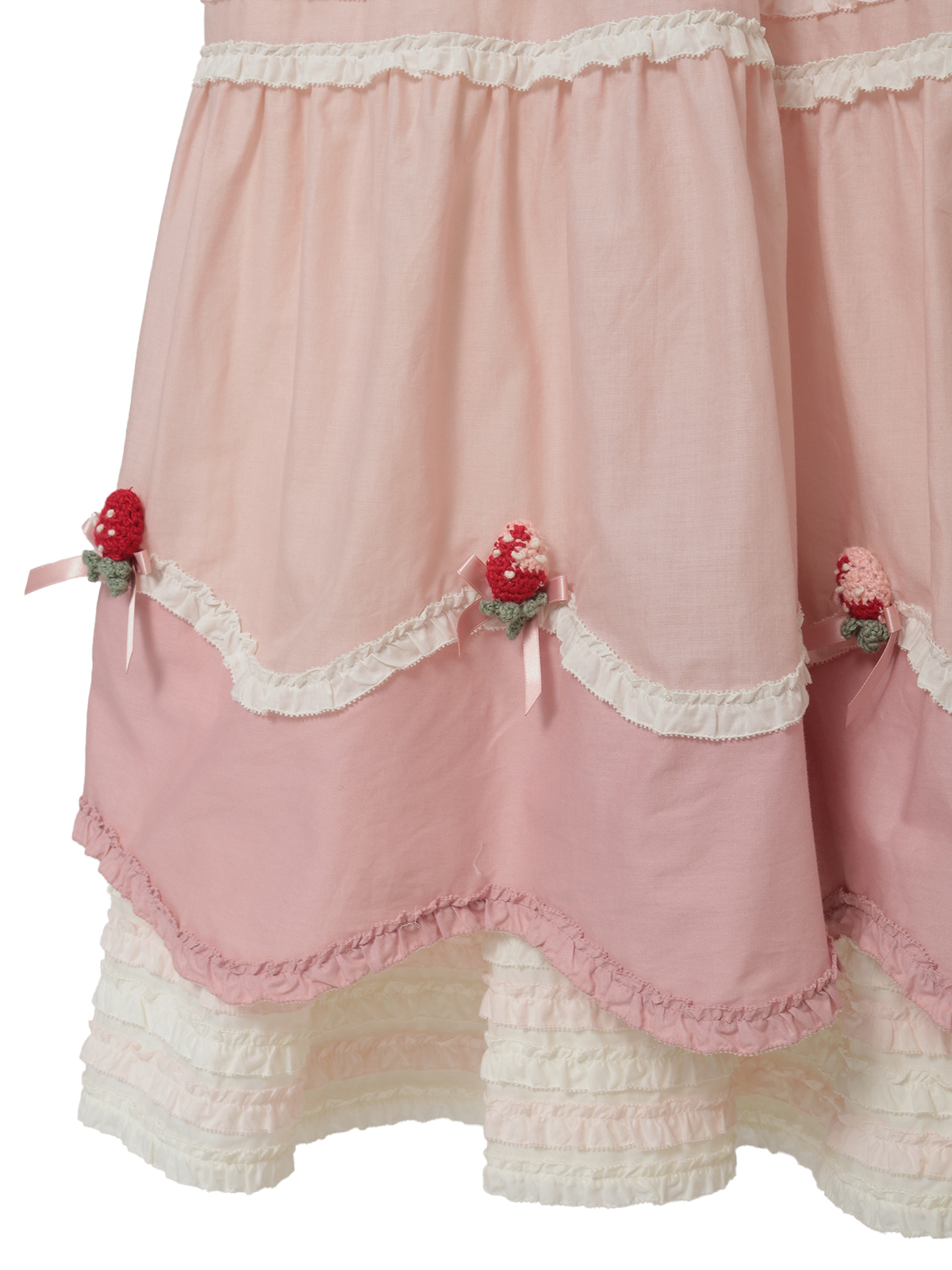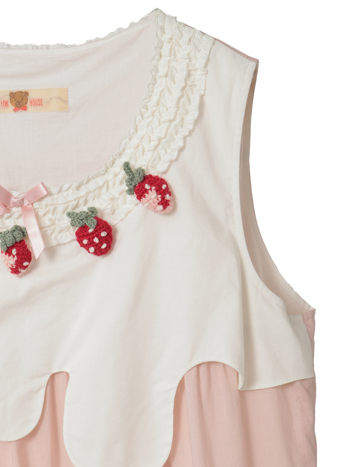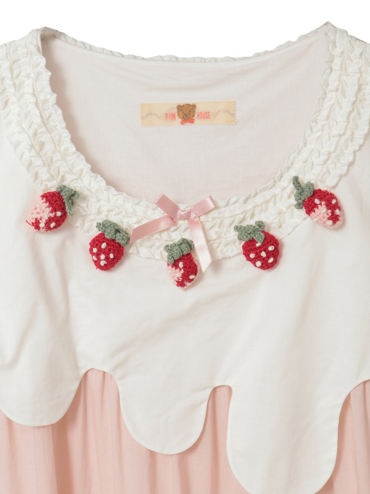 トップスの部分は、上からホイップクリームをかけているようなイメージ。首まわりにあしらったフリルのうえには、苺のニットモチーフをな5つ並べてトッピング。さらに首もとには、ピンク色のサテンリボンを添えて可愛らしく。