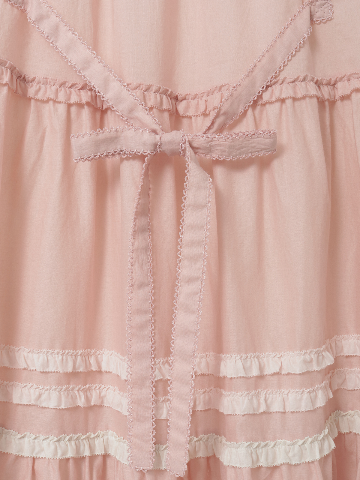 ピンク色のリボンと苺モチーフは、裾まわりのスカラップフリルのデザインのところにもあしらって華やかに。