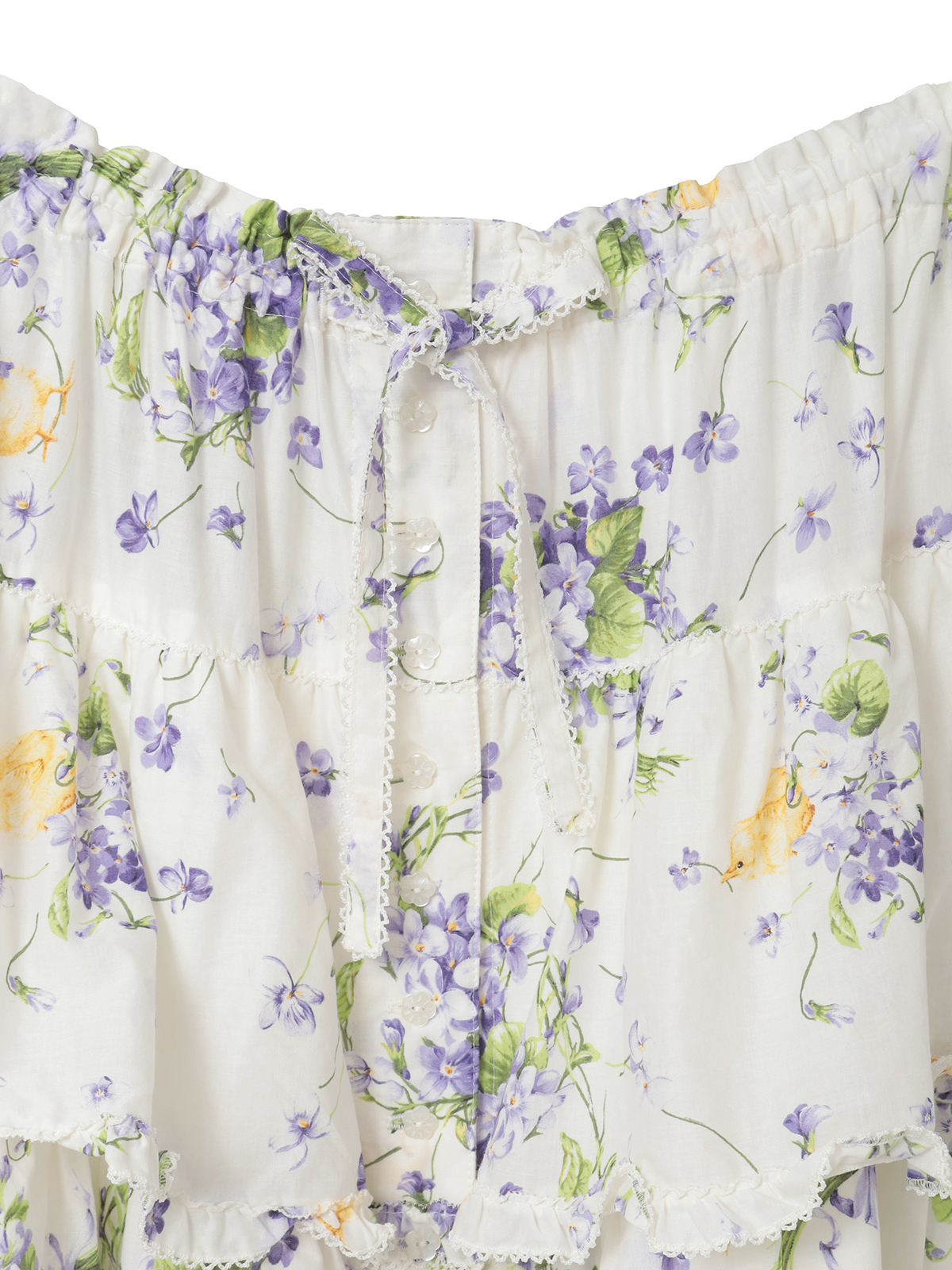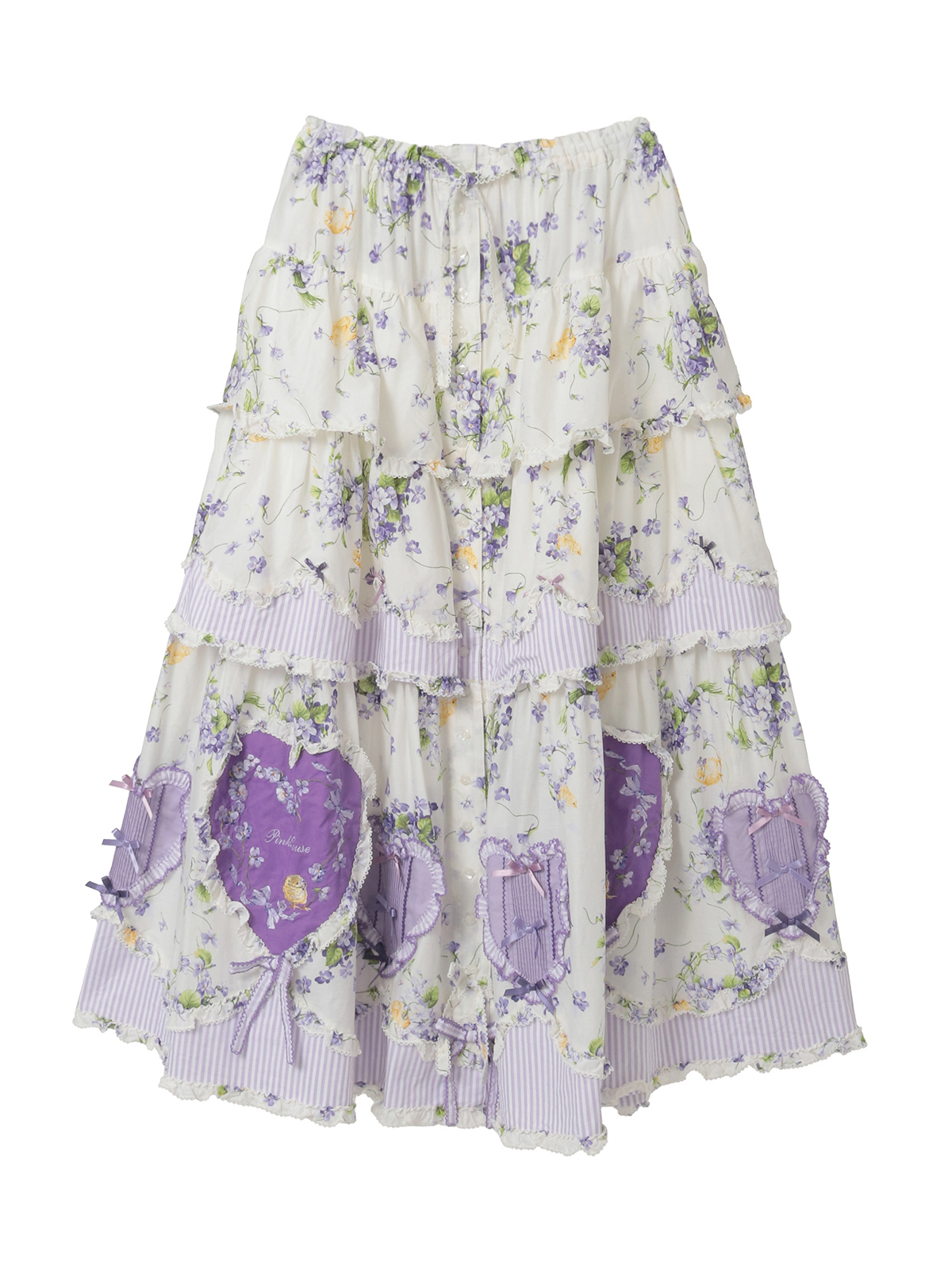 3段のフリルを重ね合わせたレイヤードタイプのスカートは、フリルの先にストライプ地を重ねわせたパッチワーク風のデザイン。