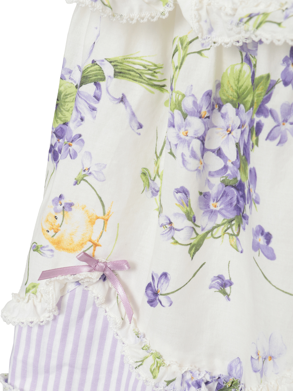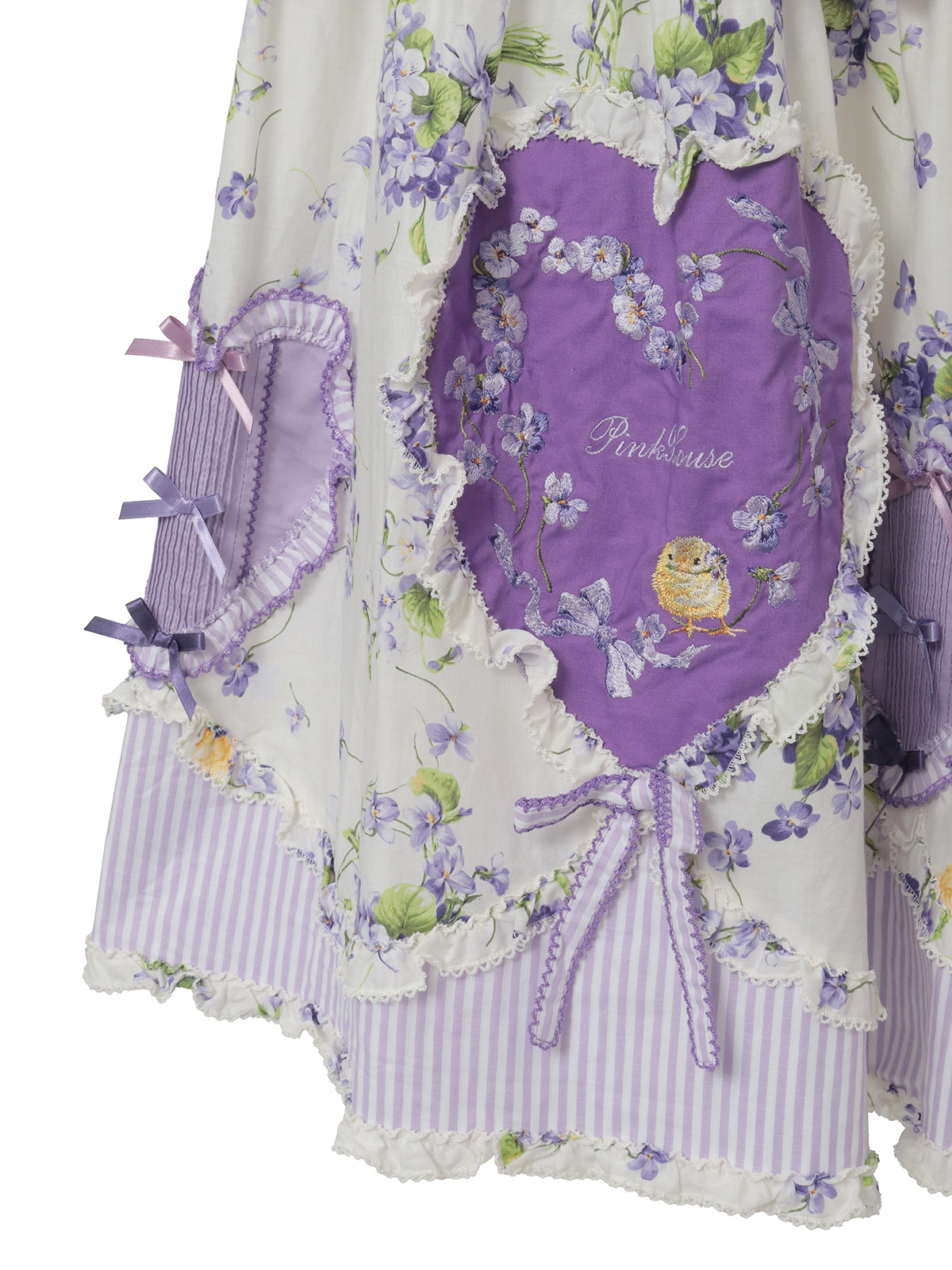 アップリケは、大きいものにはひよことすみれの刺繍をあしらって、小さいものにはタックにピコット刺繍の装飾を施してミニサテンリボンで飾り立ててそれぞれ配色使いにして裾まわりにぐるりとバランスよく並べました。アップリケのまわりにはストライプ地もフリルで縁取りして可愛らしく仕上げました。前開きタイプなので、なかにさまざまなペチコートを重ねたりと着こなしの幅が広がります。