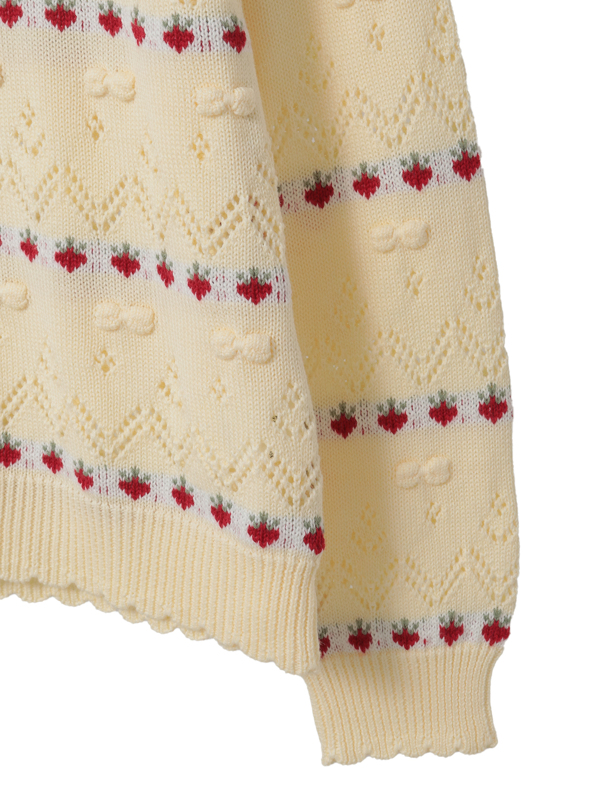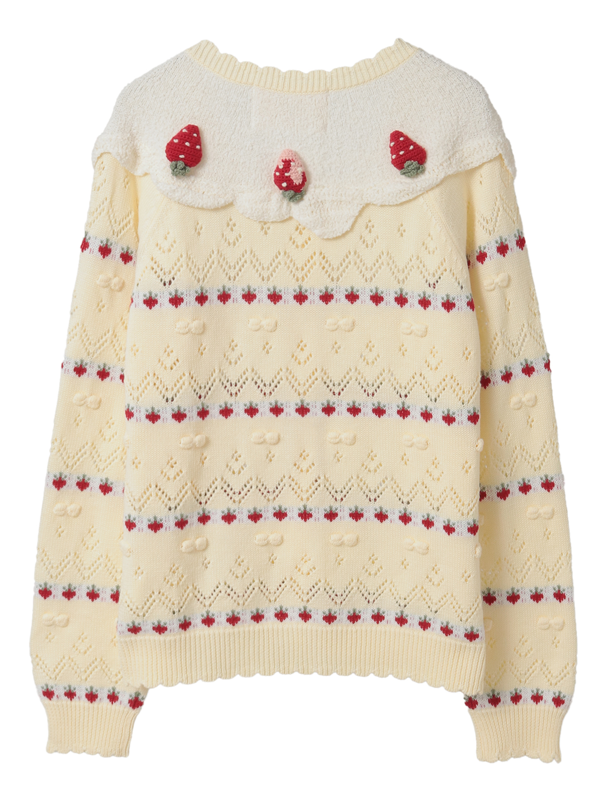 ヨークまわりのデティールは、まるで上からホイップクリームをかけているようなイメージ。さらにコロンとしたかたちがとってもキュートな苺のニットモチーフをいくつも並べてトッピング。可愛いモチーフは後ろの背中まであしらって。