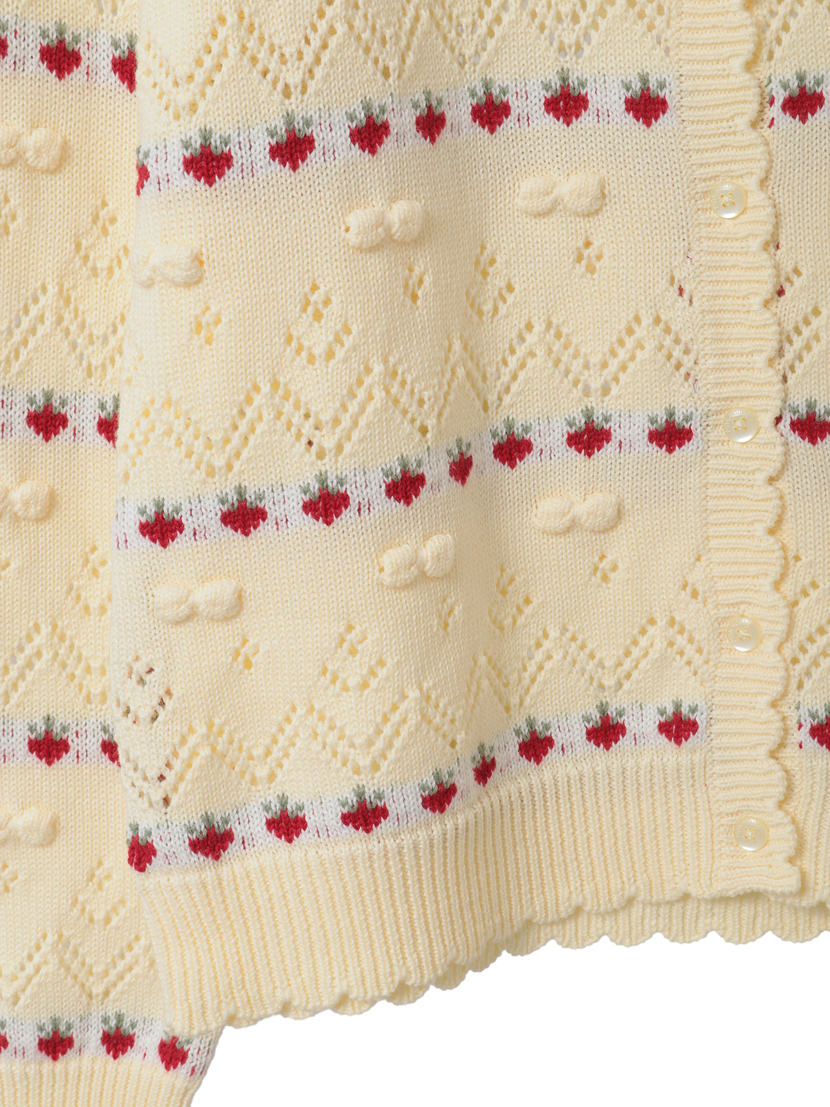身ごろには、苺のモチーフをいっぱい、ライン上に編み込んだ模様編みがなんとも可愛らしい。まるで苺の実が入ったイチゴクリームをスポンジで挟んだようなイメージに。透かし柄と交互にあしらって可愛らしい仕上がりに。