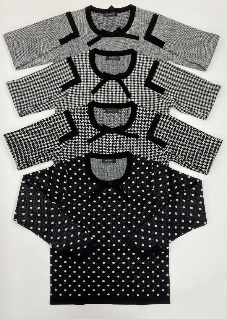 クルーネックにリボンがついたジャガードニットプルオーバー。