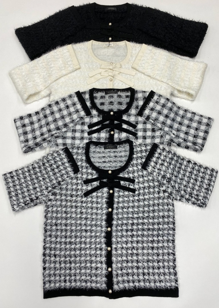 ニットカーディガンは、2つのリボンとパール調の釦がアクセント。
