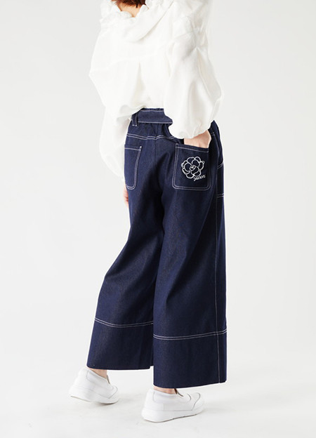 うしろのポケットにワンポイントでカメリアマークとロゴを刺しゅうしており、バックスタイルも決まります。