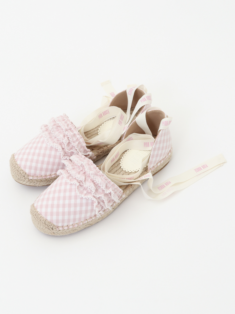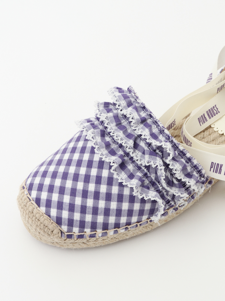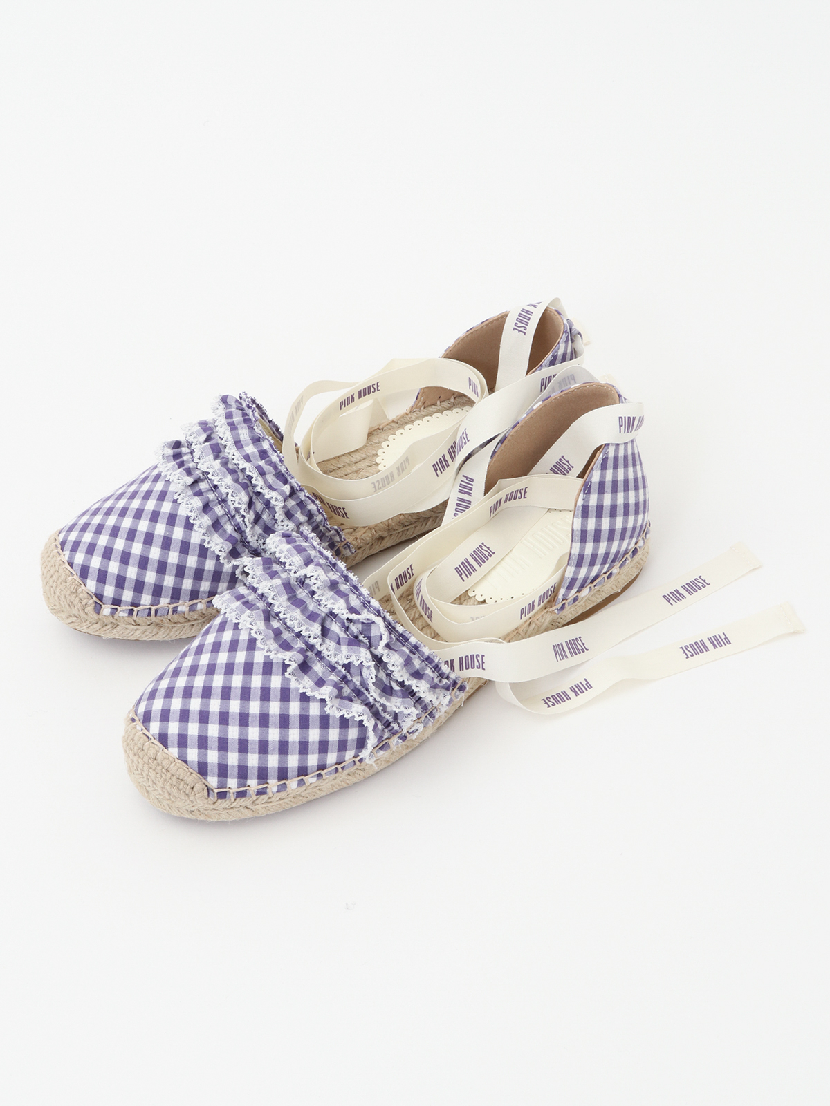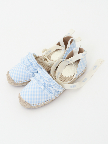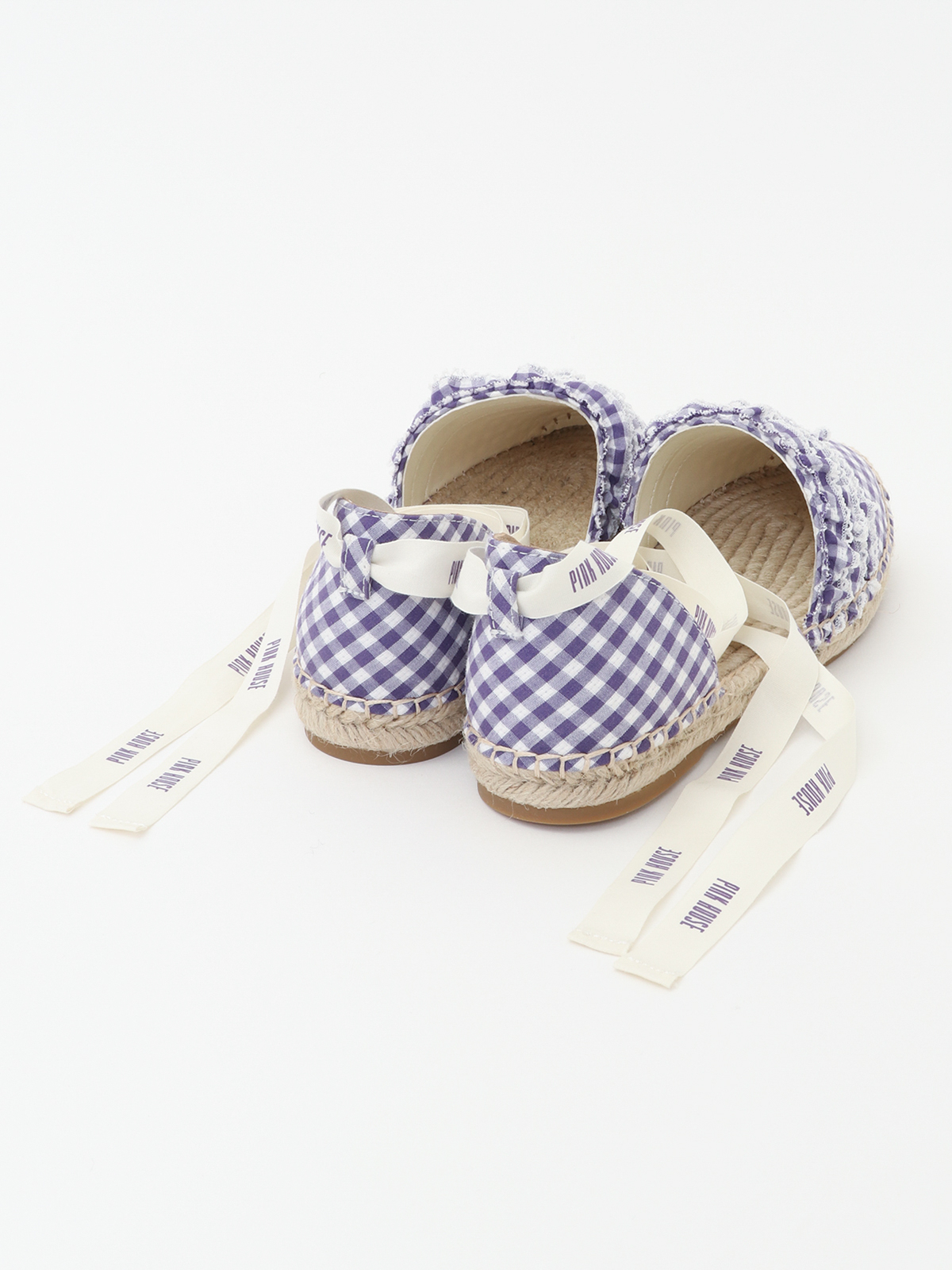 爽快さと軽快さを兼ね備えた爽やかな春夏のコーディネイトにピッタリなエスパドリーユ。ジュートのソールが通気性に優れ、カジュアルな風合いをもたらします。甲の部分にはフリルを添えて可愛らしく仕上げました。かかとにはロゴ入りリボンが通してあるので足首に巻いて結んで可愛らしい足元を演出します。リボンは取り外しができるので、着こなしに合わせてお楽しみください。ドビーギンガムを使用しているので、シリーズのお洋服にも合わせやすく、着合わせもしやすくカジュアルからレイヤードスタイルまで幅広くお楽しみいただけます。キナリの無地ローンもご用意があるので、お好みをお選びいただけます。