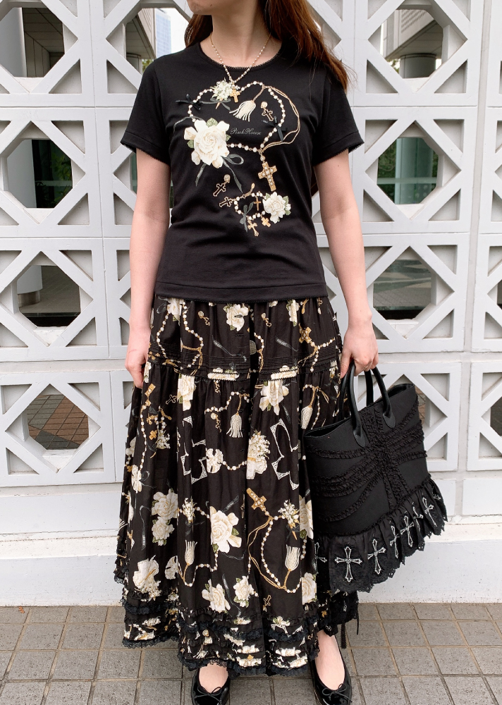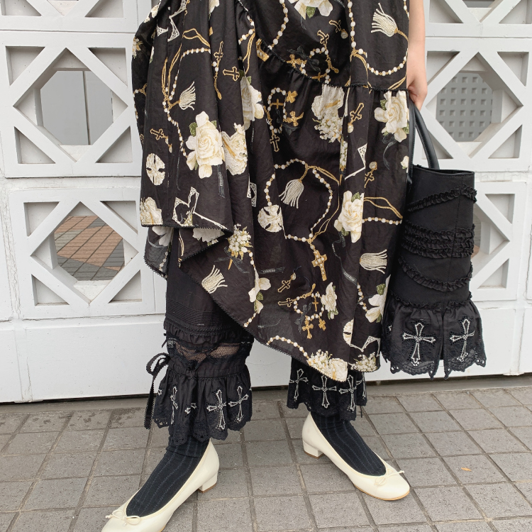 ドロワーズの裾にあしらわれた十字架を囲うステッチ刺繍はシルバーメタリックを使用してクールな印象に。