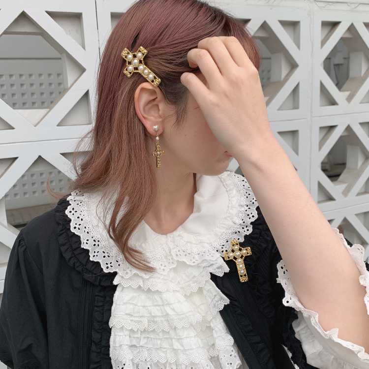 パールとゴールドの組み合わせが目を引く、クロスモチーフのアクセサリーを組み合わせて