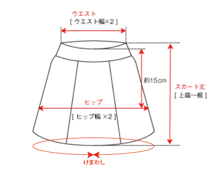 ※ヒップはファスナー止まり位置を、ファスナーのない商品はウエストより約15cm下を測っております。